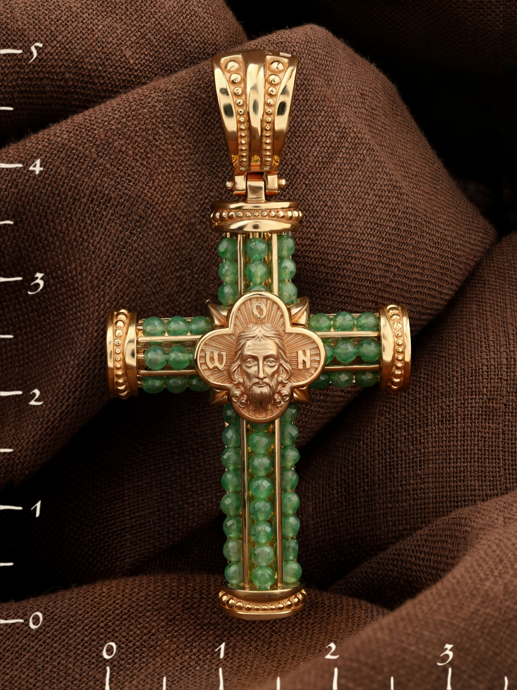 В центральной части лицевой стороны креста изображен Спас Нерукотворный — образ Господа и Спасителя нашего Иисуса Христа, чудесно отпечатавшийся на плате, котором Христос вытер свой лик. Согласно Преданию, изложенному в Четьи Минее, Авгарь V Ухама, больной проказой, послал ко Христу своего архивария Ханнана (Ананию) с письмо, в котором просил Христа прийти в Едессу и исцелить его. Ханнан же был художником, и Авгарь поручил ему, если Спаситель не сможет прийти, то написать хотя бы Его образ и принести ему. Видя, что Ханнан хочет сделать Его портрет, Христос потребовал воды, умылся, вытер Свой лик платом, и на этом плате отпечатался Его образ. Спаситель передал этот плат Ханнану с повелением отнести с ответным письмом пославшему его. Получив портрет, Авгарь исцелился от главного своего недуга, но лицо его оставалось еще поврежденным. После Пятидесятницы в Едессу пошёл святой апостол Фаддей, один из 70-ти, закончил исцеление Авгаря и обратил его в христианство. Авгарь прикрепил образ к доске и поместил в нише над городскими воротами, убрав оттуда находившегося там идола.