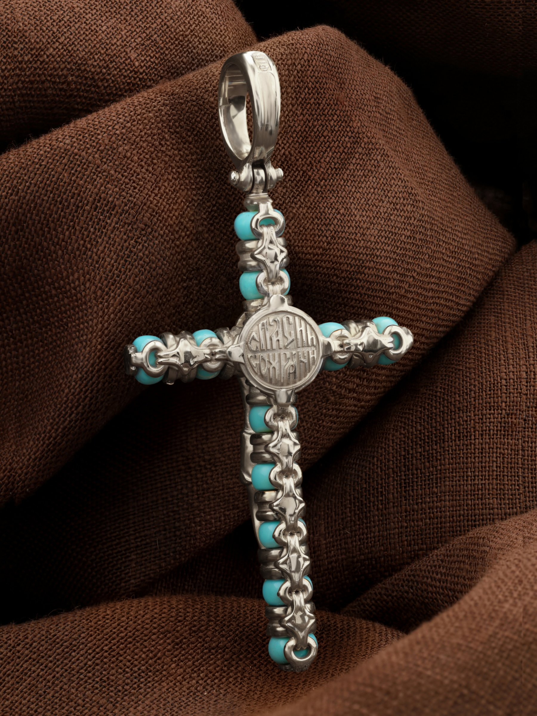 В центральной части оборотной стороны креста помещена молитва: «Спаси и сохрани».