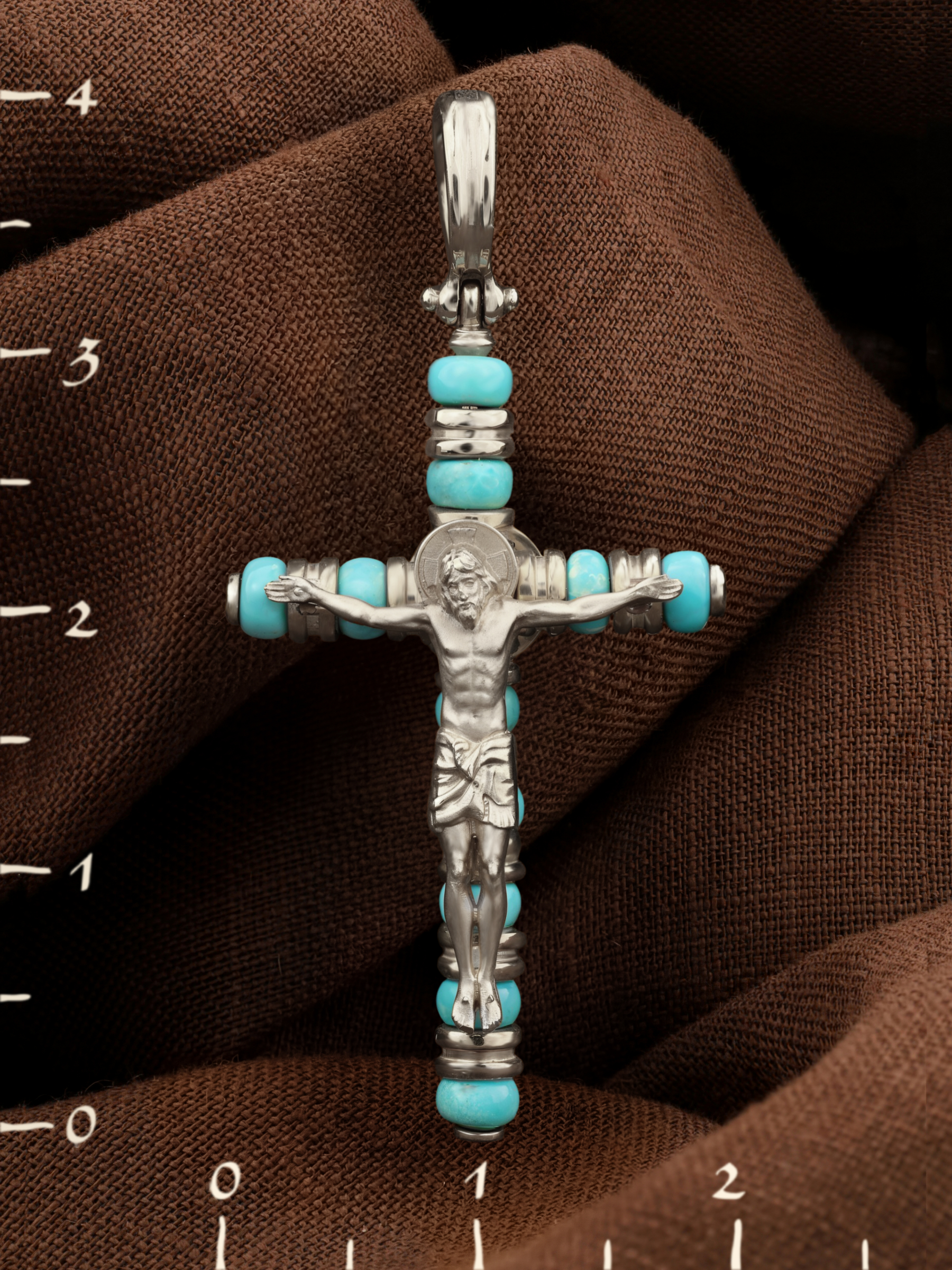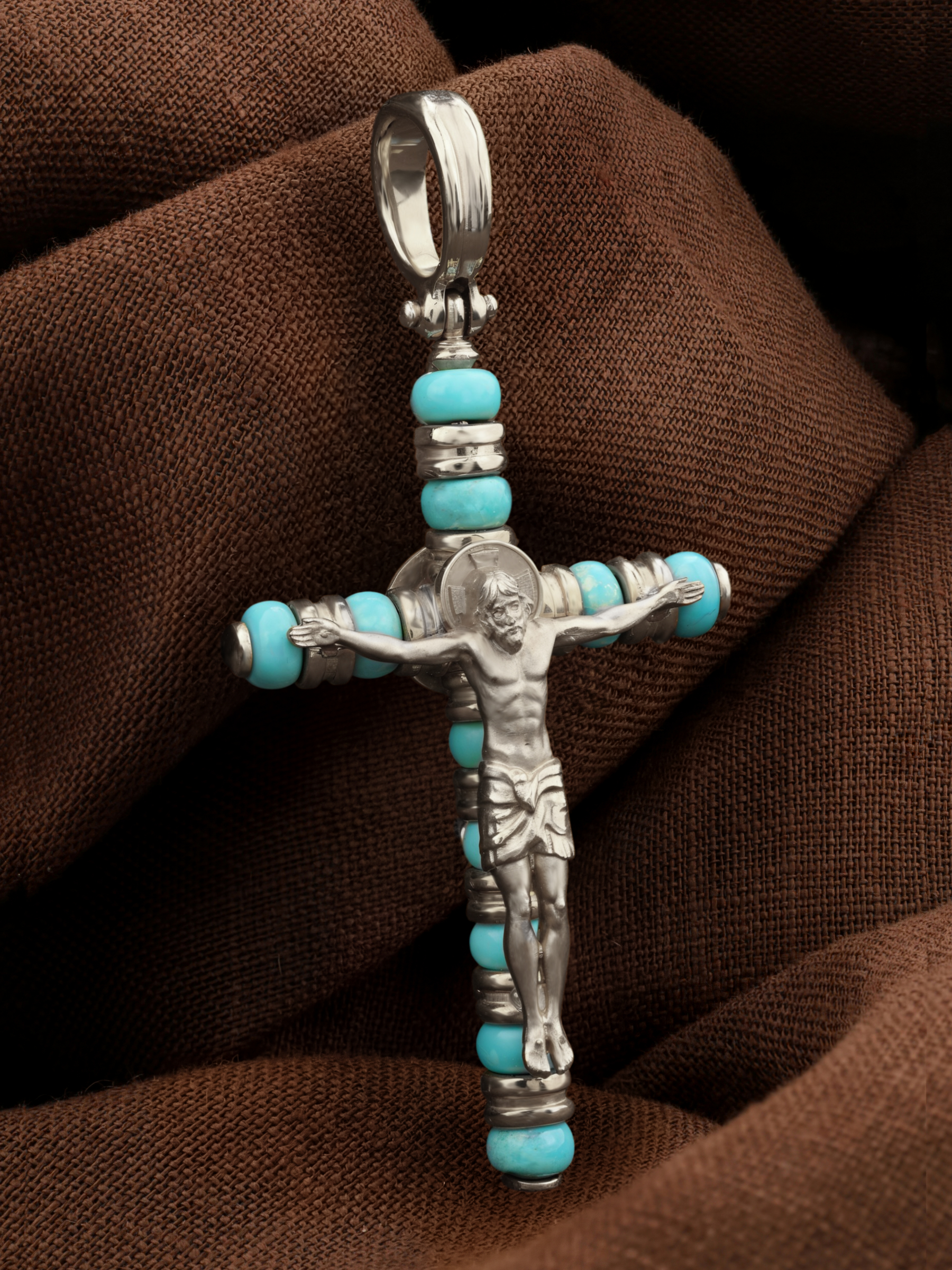 На лицевой стороне креста изображено Распятие Господа и Спасителя нашего Иисуса Христа. Своими крестными страданиями Господь смыл наши грехи, покрыл наш долг перед Богом или, на языке Писания, нас «искупил». В Голгофе сокрыта непостижимая тайна бесконечной правды и любви Бога. Крест стал символом победы добра над злом, жизни над смертью, напоминанием бесконечной Божьей любви, предметом радости. Воплотившийся Сын Божий Своею кровью освятил крест и сделал его проводником Своей благодати, источником освящения верующих. Господь сказал: кто хочет идти за Мною, отвергнись себя, и возьми крест свой, и следуй за Мною. (Мк. 8: 34). На православном кресте Христос не умирает, а свободно простирает руки, ладони Иисуса открыты, будто он хочет обнять все человечество, даря им свою любовь и открывая путь к вечной жизни.