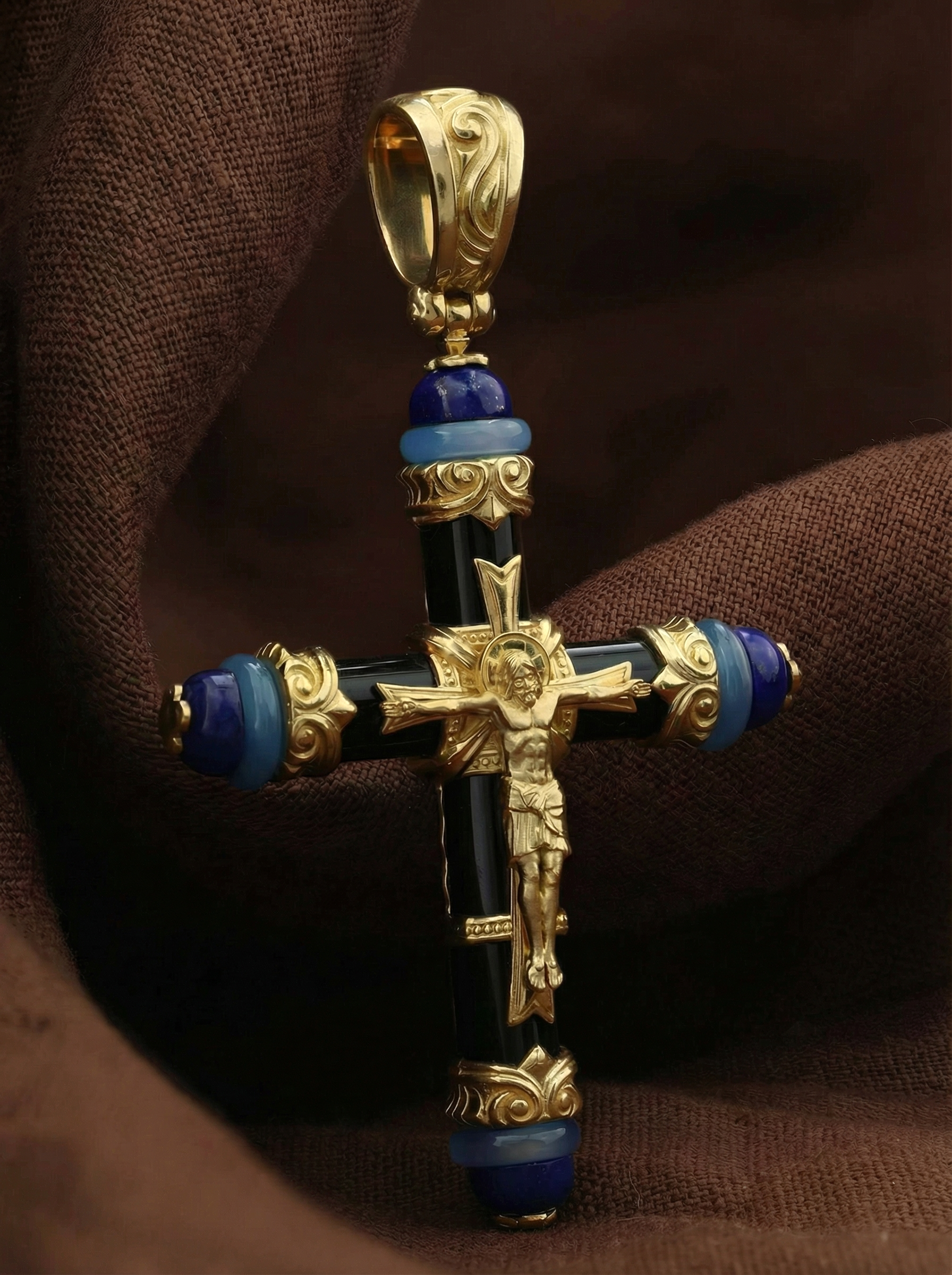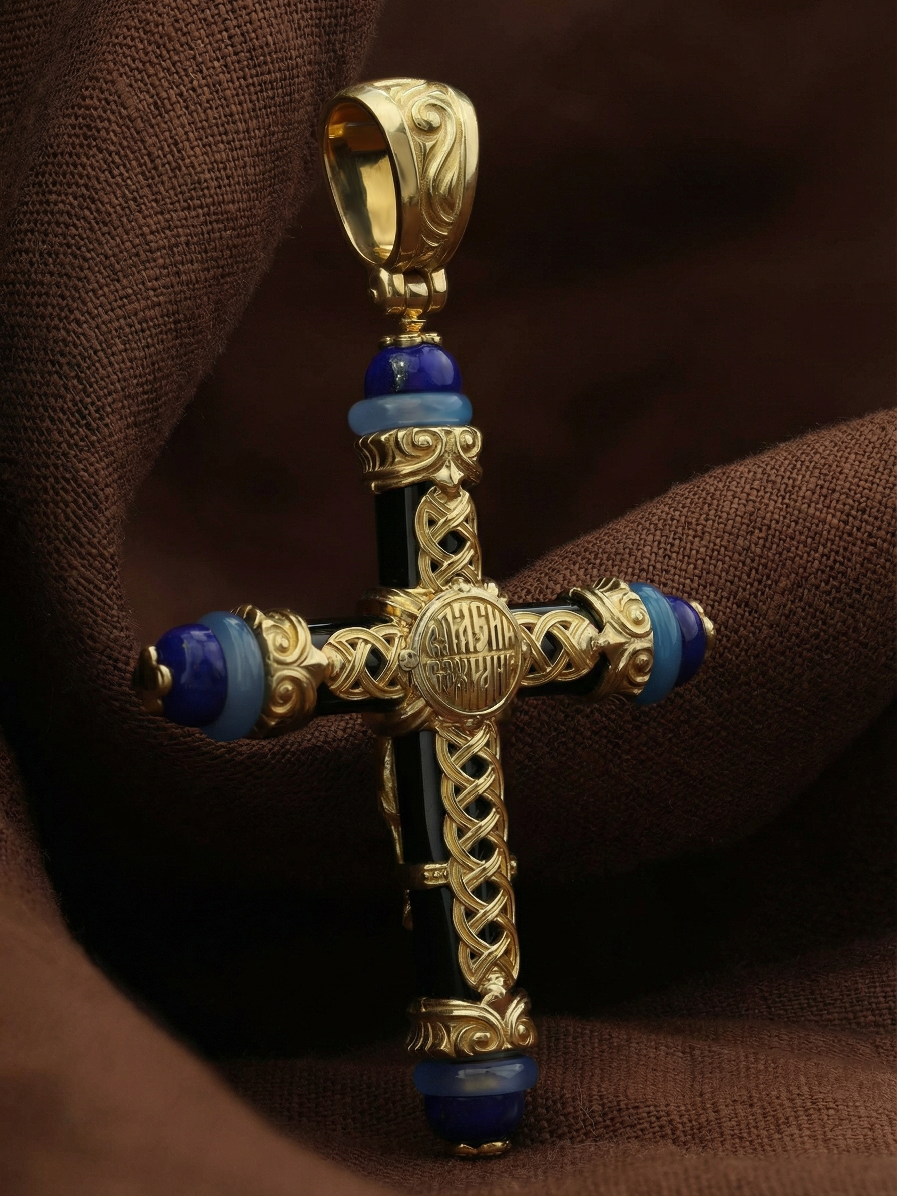 Крест из лимонного золота c ониксом, агатом и лазуритом