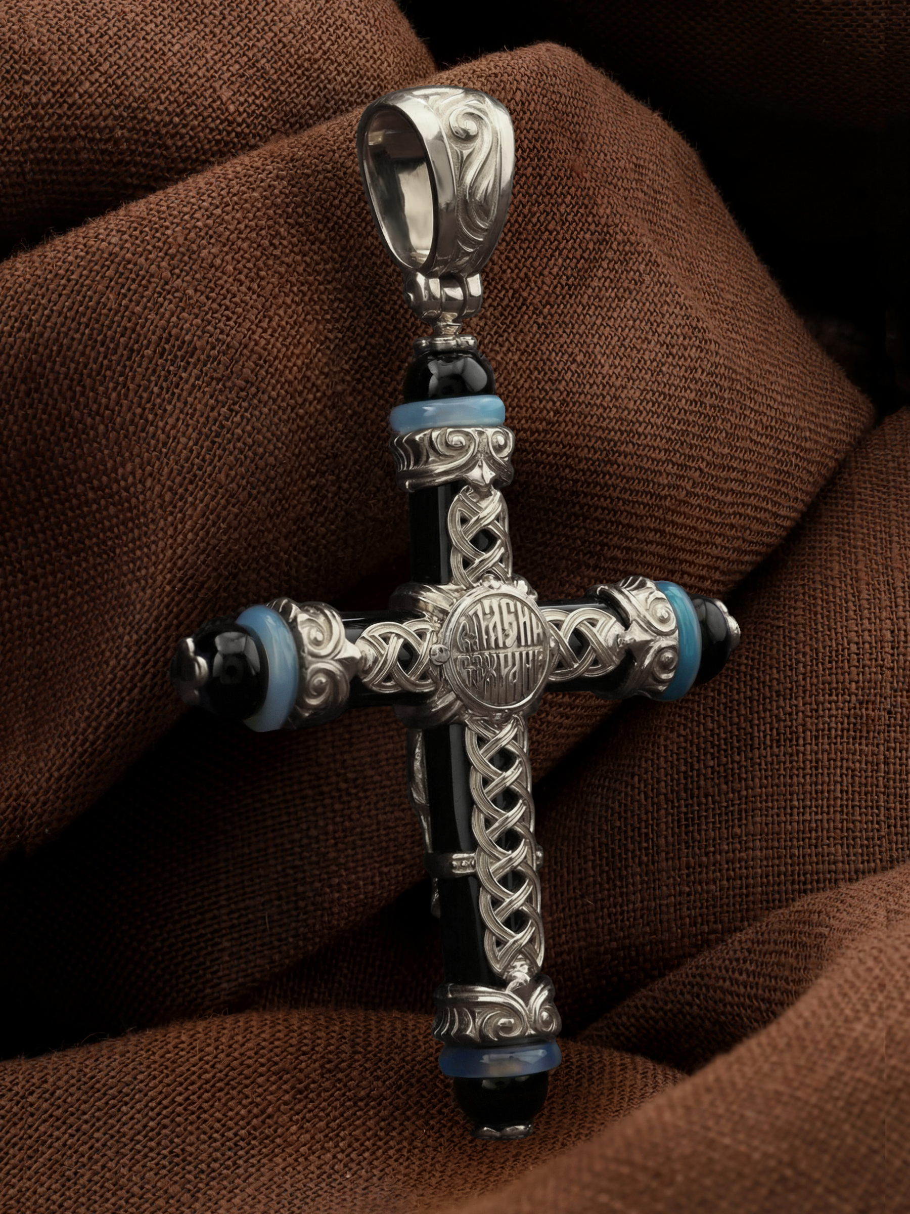 Крест из белого золота c ониксом и агатом