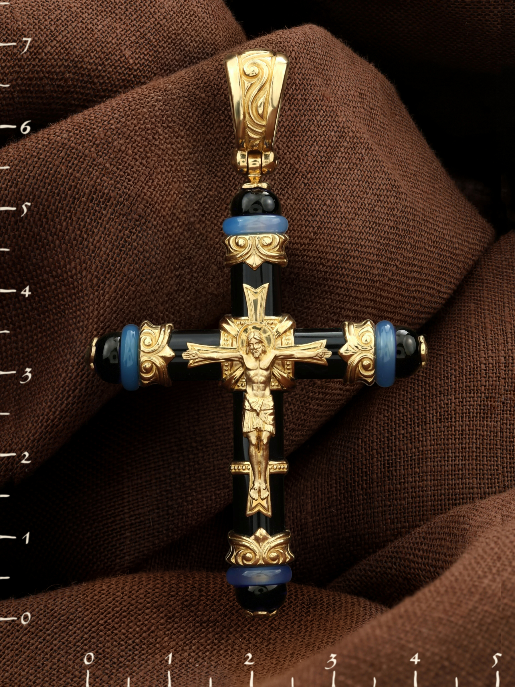 На лицевой стороне креста изображено Распятие Господа и Спасителя нашего Иисуса Христа. Своими крестными страданиями Господь смыл наши грехи, покрыл наш долг перед Богом или, на языке Писания, нас «искупил». В Голгофе сокрыта непостижимая тайна бесконечной правды и любви Бога. Крест стал символом победы добра над злом, жизни над смертью, напоминанием бесконечной Божьей любви, предметом радости. Воплотившийся Сын Божий Своею кровью освятил крест и сделал его проводником Своей благодати, источником освящения верующих. Христос в Своей Божественной любви, над которой смерть не властна и которая, страдая, и не страдает в обычном смысле, простирает к людям со Креста Свои объятия, в которые призывается и привлекается весь мир. Поэтому Тело Его не висит, а торжественно покоится на Кресте.