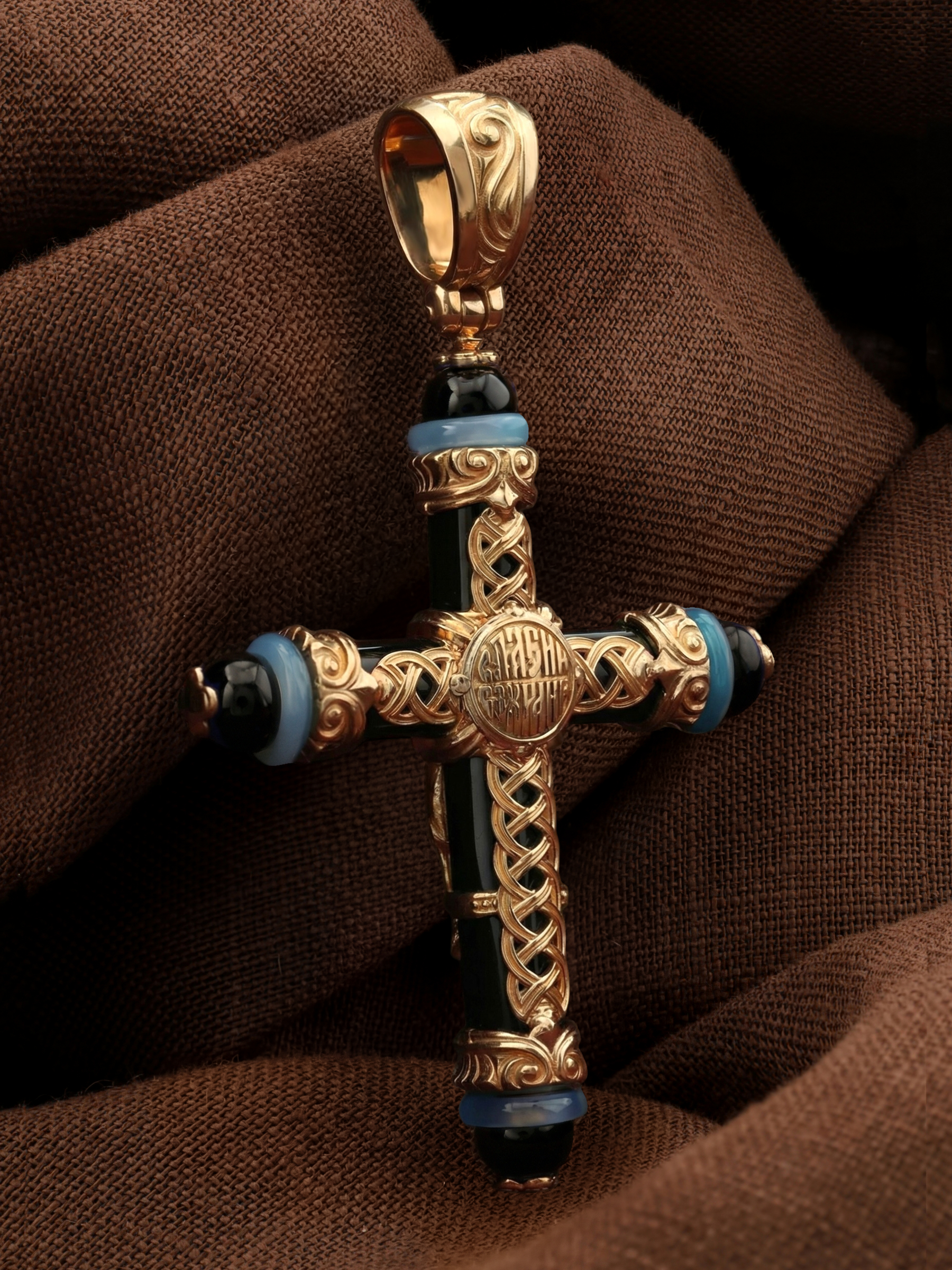 На оборотной стороне креста написана молитва: «Спаси и сохрани». Крест украшен орнаментом.