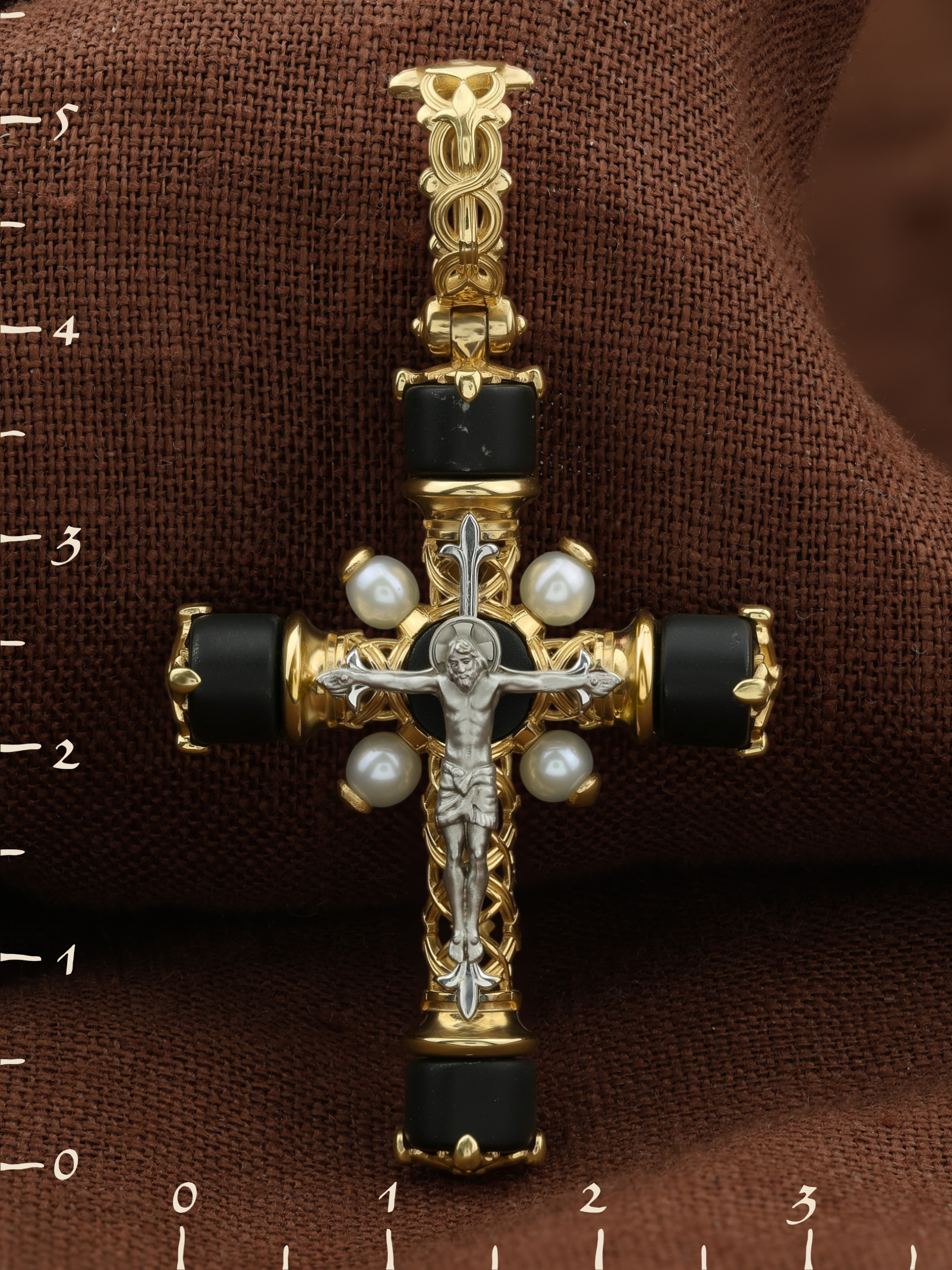 На лицевой стороне креста изображено Распятие Господа и Спасителя нашего Иисуса Христа. Своими крестными страданиями Господь смыл наши грехи, покрыл наш долг перед Богом или, на языке Писания, нас «искупил». В Голгофе сокрыта непостижимая тайна бесконечной правды и любви Бога. Крест стал символом победы добра над злом, жизни над смертью, напоминанием бесконечной Божьей любви, предметом радости. Воплотившийся Сын Божий Своею кровью освятил крест и сделал его проводником Своей благодати, источником освящения верующих. Господь сказал: кто хочет идти за Мною, отвергнись себя, и возьми крест свой, и следуй за Мною. (Мк. 8: 34). На православном кресте Христос не умирает, а свободно простирает руки, ладони Иисуса открыты, будто он хочет обнять все человечество, даря им свою любовь и открывая путь к вечной жизни.