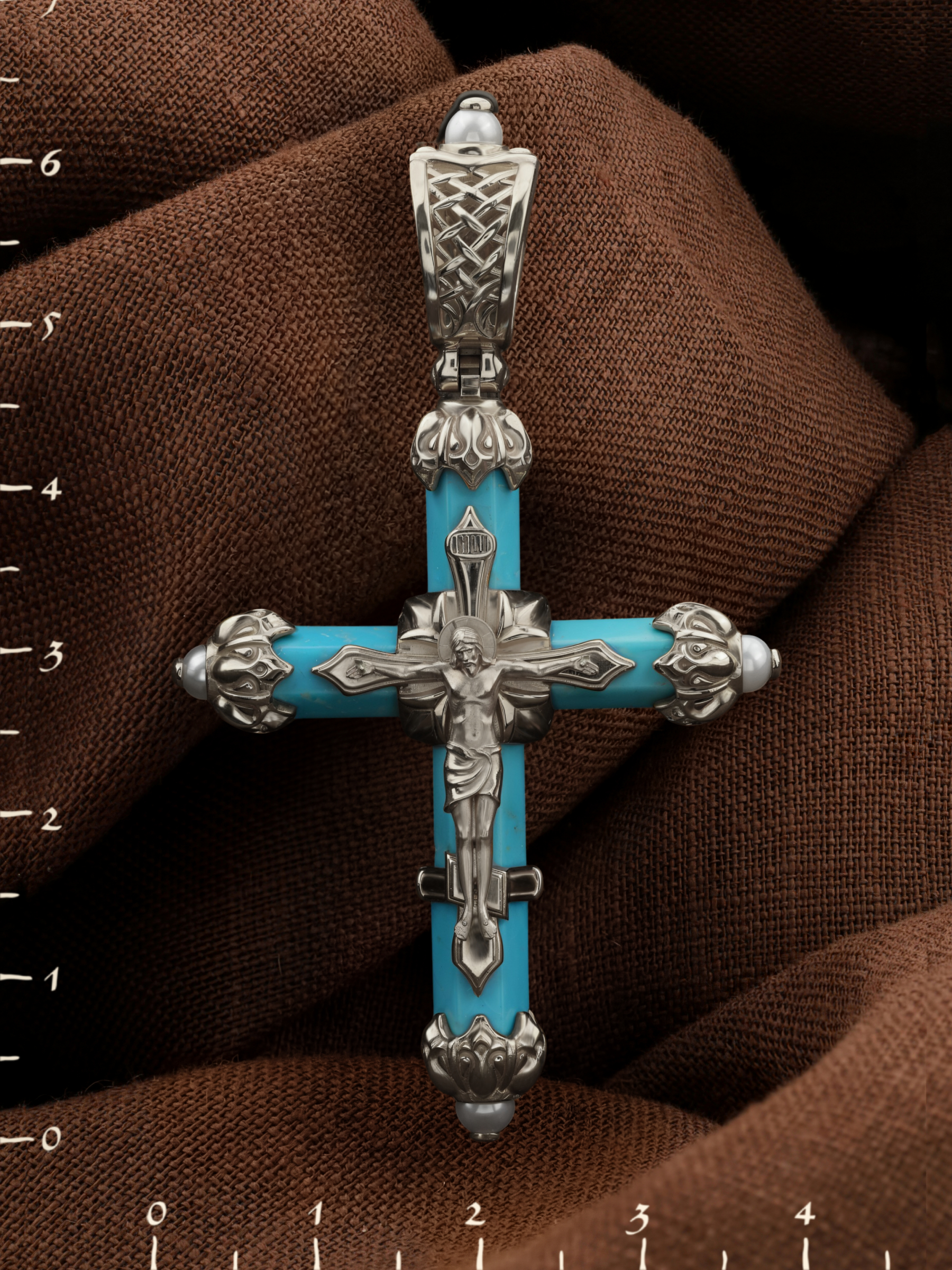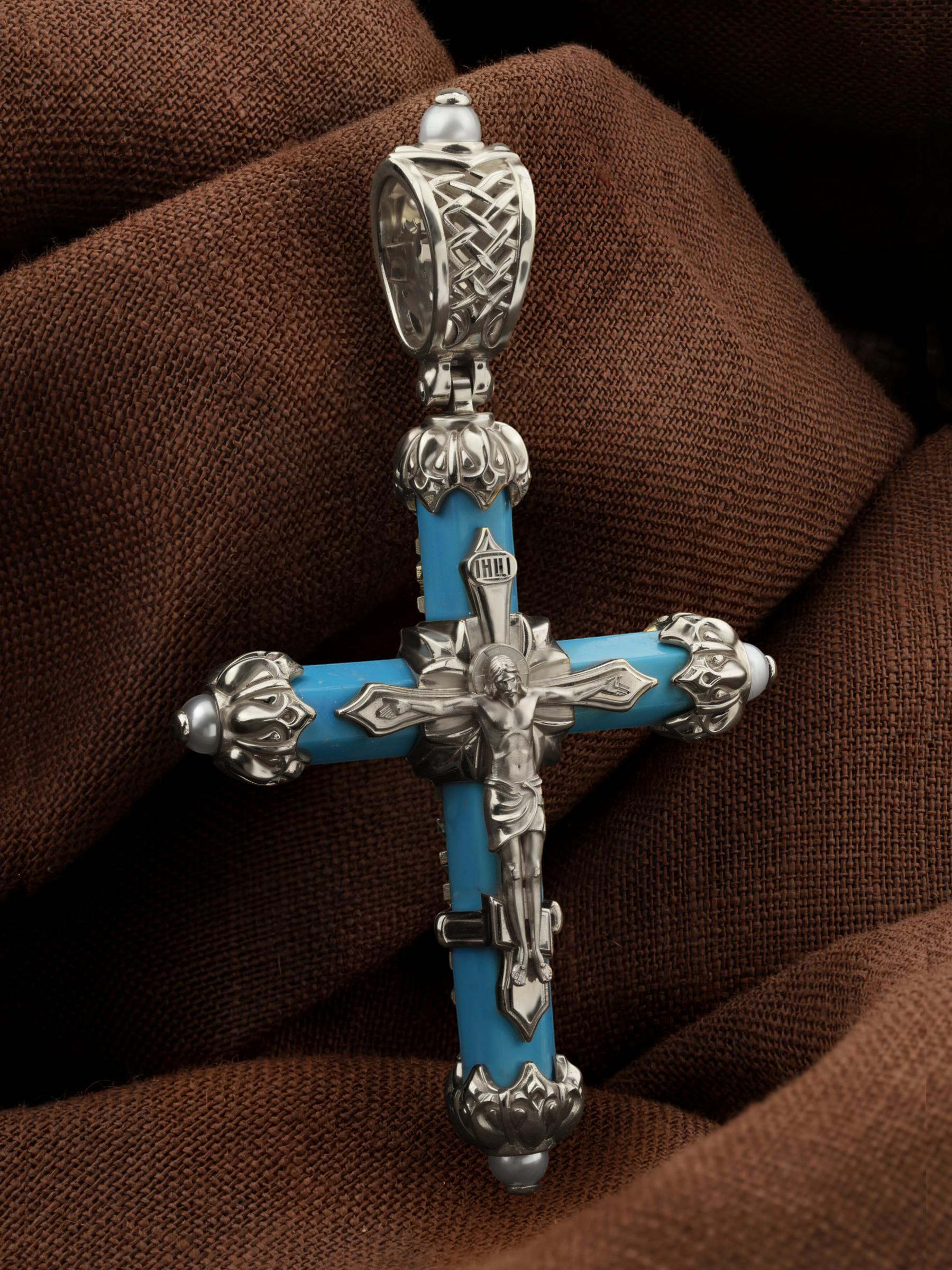 На лицевой стороне креста изображено Распятие Господа и Спасителя нашего Иисуса Христа. Своими крестными страданиями Господь смыл наши грехи, покрыл наш долг перед Богом или, на языке Писания, нас «искупил». В Голгофе сокрыта непостижимая тайна бесконечной правды и любви Бога. Крест стал символом победы добра над злом, жизни над смертью, напоминанием бесконечной Божьей любви, предметом радости. Воплотившийся Сын Божий Своею кровью освятил крест и сделал его проводником Своей благодати, источником освящения верующих. Господь сказал: кто хочет идти за Мною, отвергнись себя, и возьми крест свой, и следуй за Мною. (Мк. 8: 34). На православном кресте Христос не умирает, а свободно простирает руки, ладони Иисуса открыты, будто он хочет обнять все человечество, даря им свою любовь и открывая путь к вечной жизни.