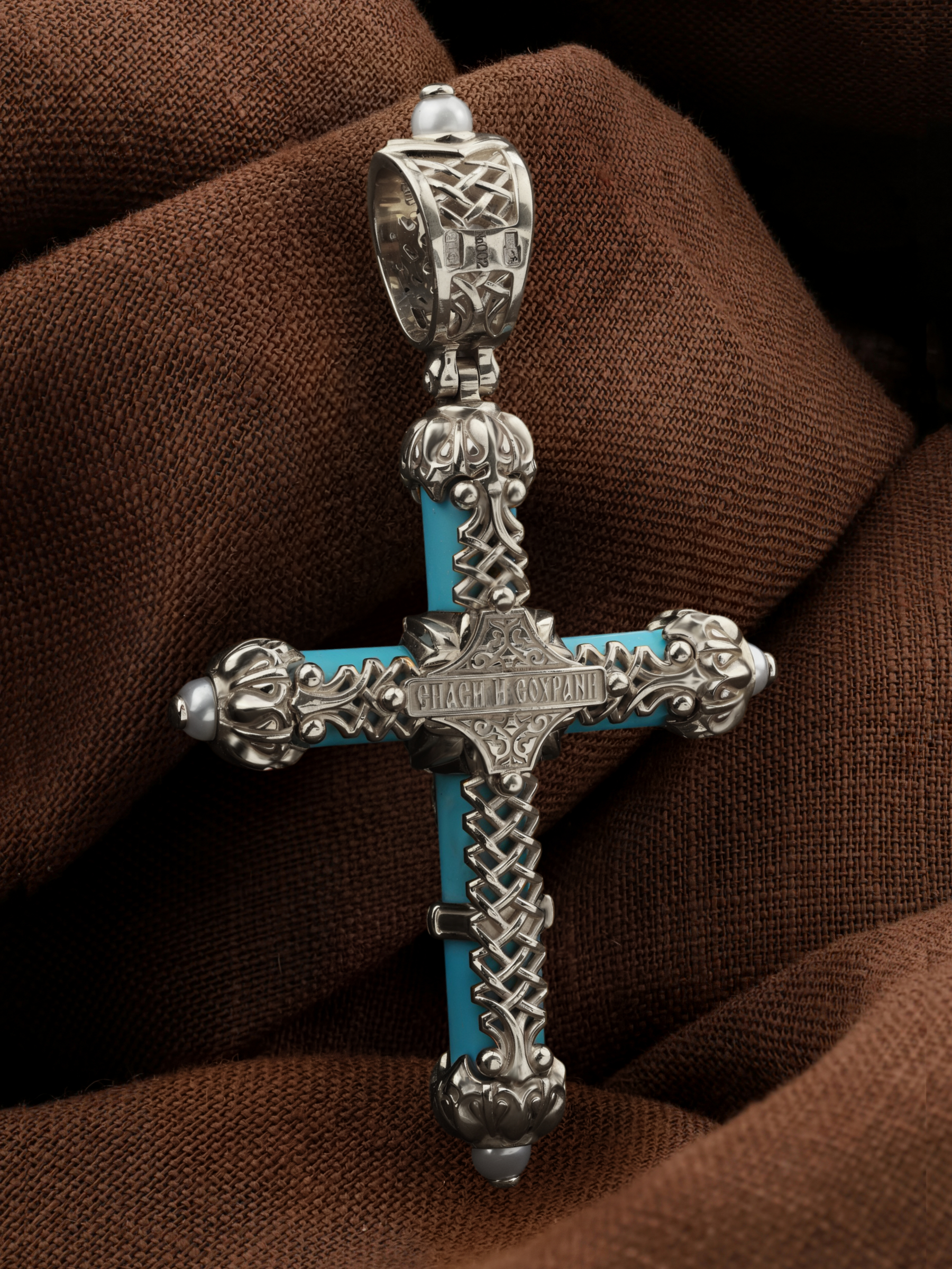 В центральной части оборотной стороны креста помещена молитва: «Спаси и сохрани».