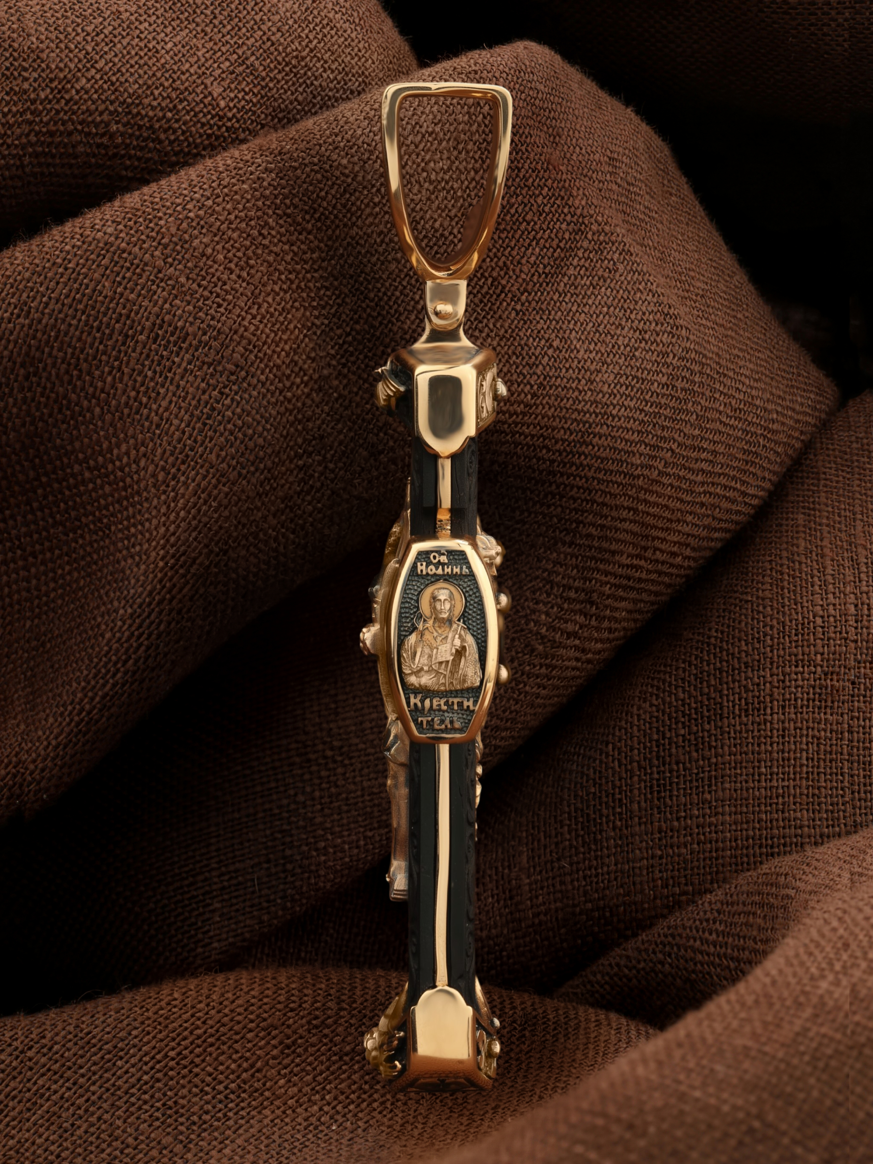 На торце изделия с левой стороны помещена икона Святого Николая Чудотворца — самый почитаемый в Православной Церкви, которого еще называют Николай Угодник за то, что он угодил своей жизнью Богу. Николай Чудотворец, помощник в делах, покровитель учащихся, утешитель обиженных и нуждающихся, целитель самых страшных и тяжелых недугов, предстатель и молитвенник за людей перед Богом. Также Святитель Николай Чудотворец известен своими молитвами за путешественников, когда непрестанный ветер и бушующие волны утихают и корабль заходит в спокойную гавань. На торце изделия с правой стороны — икона Святого Иоанна Крестителя. Святой Иоанн был последним пророком Израиля. Он призывал к покаянию, предвозвещая приближение Царствия Небесного (Мф. 3, 2), и удостоился стать Крестителем Христа. Иисус Христос говорит о нем: «Сей есть о котором написано: «Вот, Я посылаю Ангела Моего пред лицем Твоим, который приготовит путь Твой пред Тобою» (Лк. 7, 27). И еще: «Из рожденных женами нет ни одного пророка больше Иоанна Крестителя» (Лк. 7, 28).