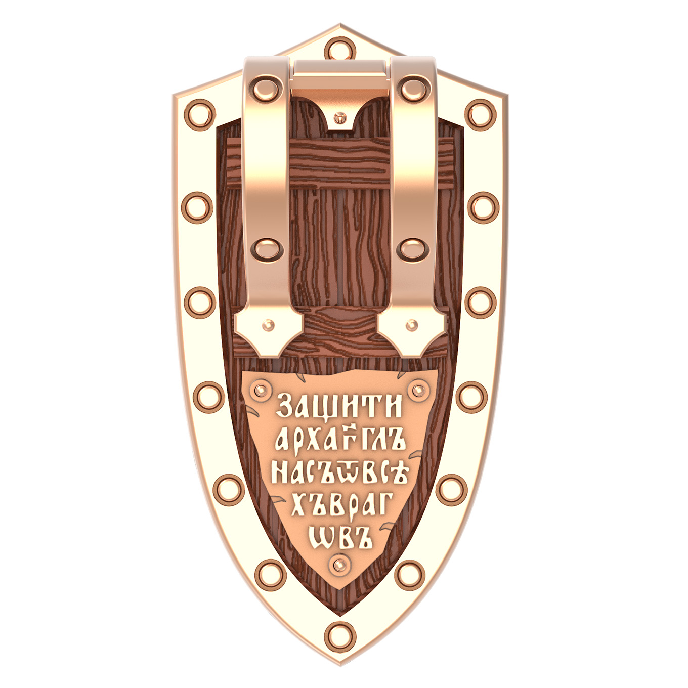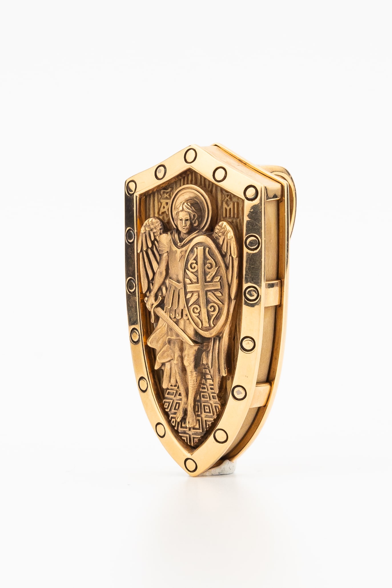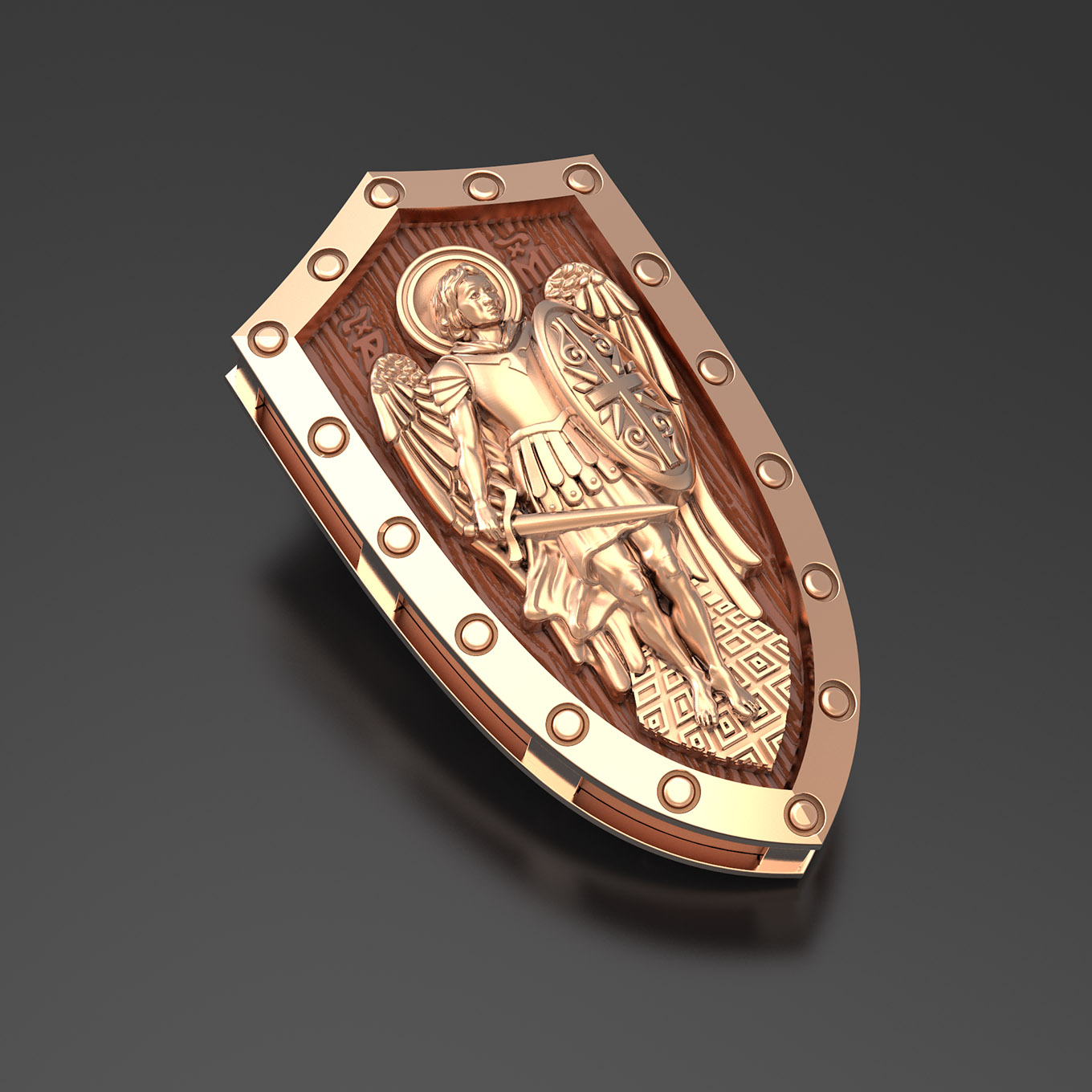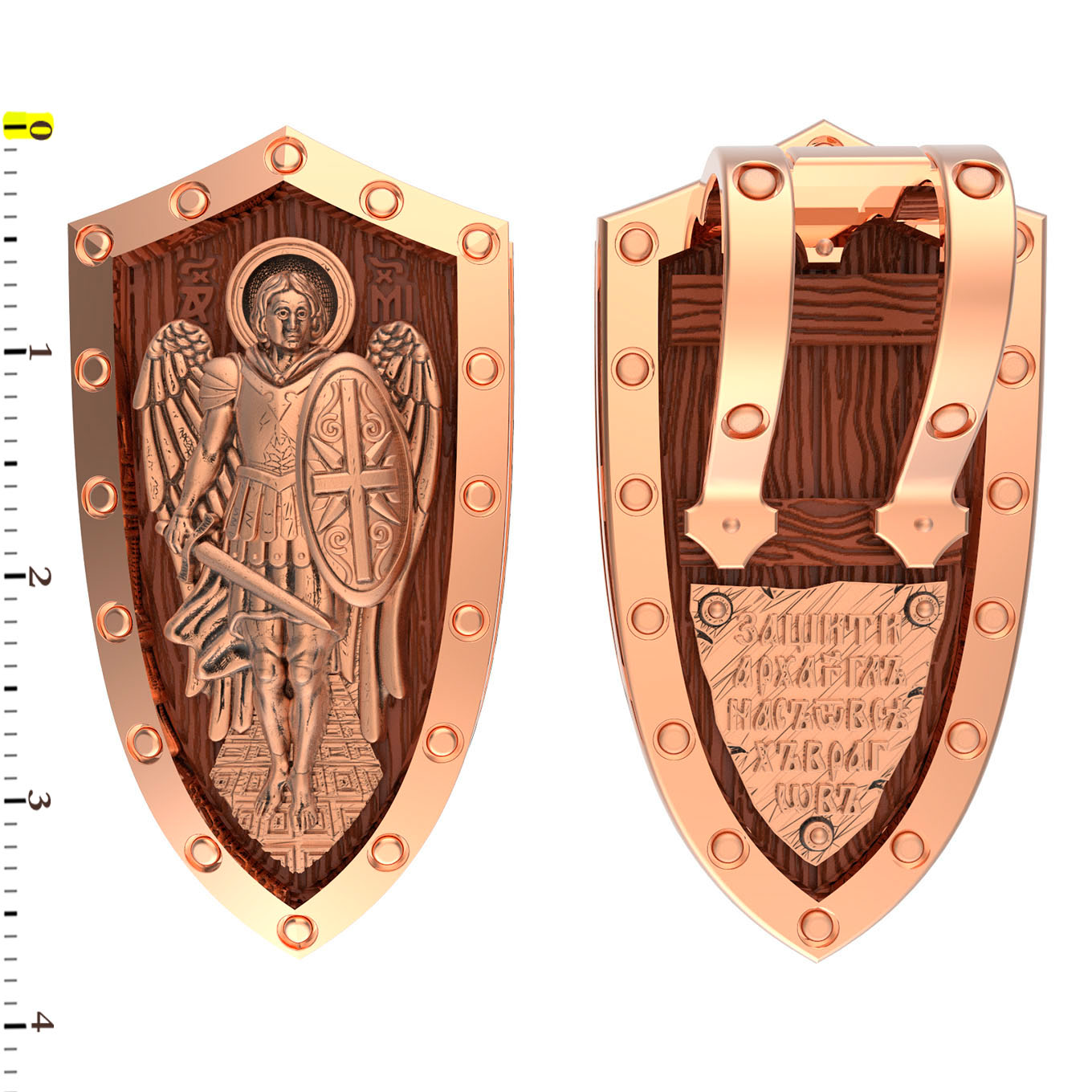 На лицевой стороне образка изображение Архангела Михаила — верного служителя Божия, который низринул с Неба возгордившегося денницу с другими павшими духами. В Православии его называют Архистратигом, что означает глава святого воинства Ангелов и Архангелов. Образок сделан в виде воинского щита. Архангел Михаил изображен в воинственном виде с огненным мечом в правой руке и щитом в левой. Архангел почитается как покровитель воинов и всех верных Богу и ведущих борьбу против сил зла, борец против ересей, а также защитник душ умерших, страж райских врат. С древних времен прославлен своими чудесами Архангел Михаил на Руси. Примеров явления и помощи Архистратига Михаила в русской истории бессчетно. Архангел Михаил не перестает ратоборствовать за славу Творца и Господа всяческих, за дело спасения рода человеческого, за церковь и чад ее. И, согласно, Откровению Иоанна Богослова во время последней битвы небесных и дьявольских сил Михаил и его ангелы опять низвергнут Люцифера вместе с его войском: «Михаил и Ангелы его воевали против дракона, и дракон и ангелы его воевали [против них], но не устояли, и не нашлось уже для них места на небе. И низвержен был великий дракон, древний змий, называемый диаволом и сатаною, обольщающий всю вселенную, низвержен на землю, и ангелы его низвержены с ним» (Откр.12:7−9).