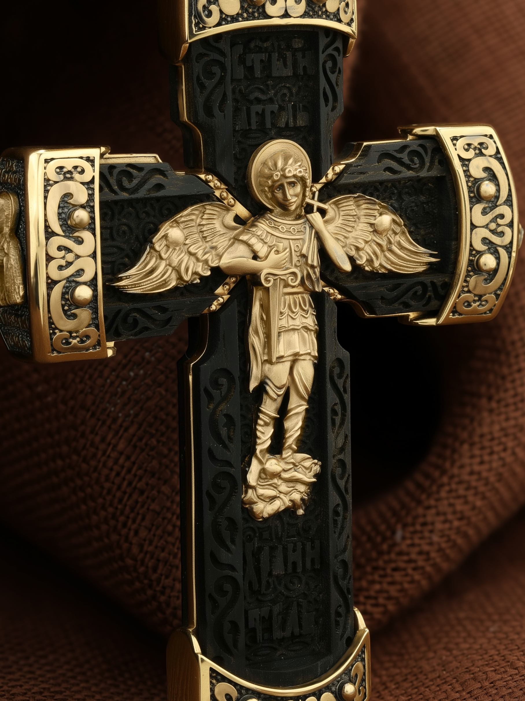 В центре оборота креста изображен Ангела Хранителя с традиционными атрибутами в руках: крестом, которым он осеняет человека, и мечом для прогнания бесов. По Православному учению, каждому, принявшему святое крещение, дается Господом Ангел Хранитель, который сопровождает человека всю его жизнь, помогая в добрых делах и охраняя от нападок злых духов. Святые отцы утверждают, что только верующий человек имеет рядом с собой Ангела Хранителя: «Тем, которые сподобились крещения и возносятся на высоту добродетелей, даны от Бога Ангелы, заботящиеся о них и содействующие им. В этом уверяет нас Господь, когда говорит, что есть Ангелы Хранители у всякого, кто верует в Него» (преп. Анастасий Синаит). Но Ангел Хранитель пребывает с христианином, если только мы не прогоним его греховными делами, поскольку «как дым разгоняет пчел, так и грех прогоняет от нас Ангела Хранителя» (свт. Василий Великий). Но и после завершения земного пути Ангел Хранитель не покидает христианина, а помогает душе преодолеть воздушные мытарства на пути в Царство Небесное.