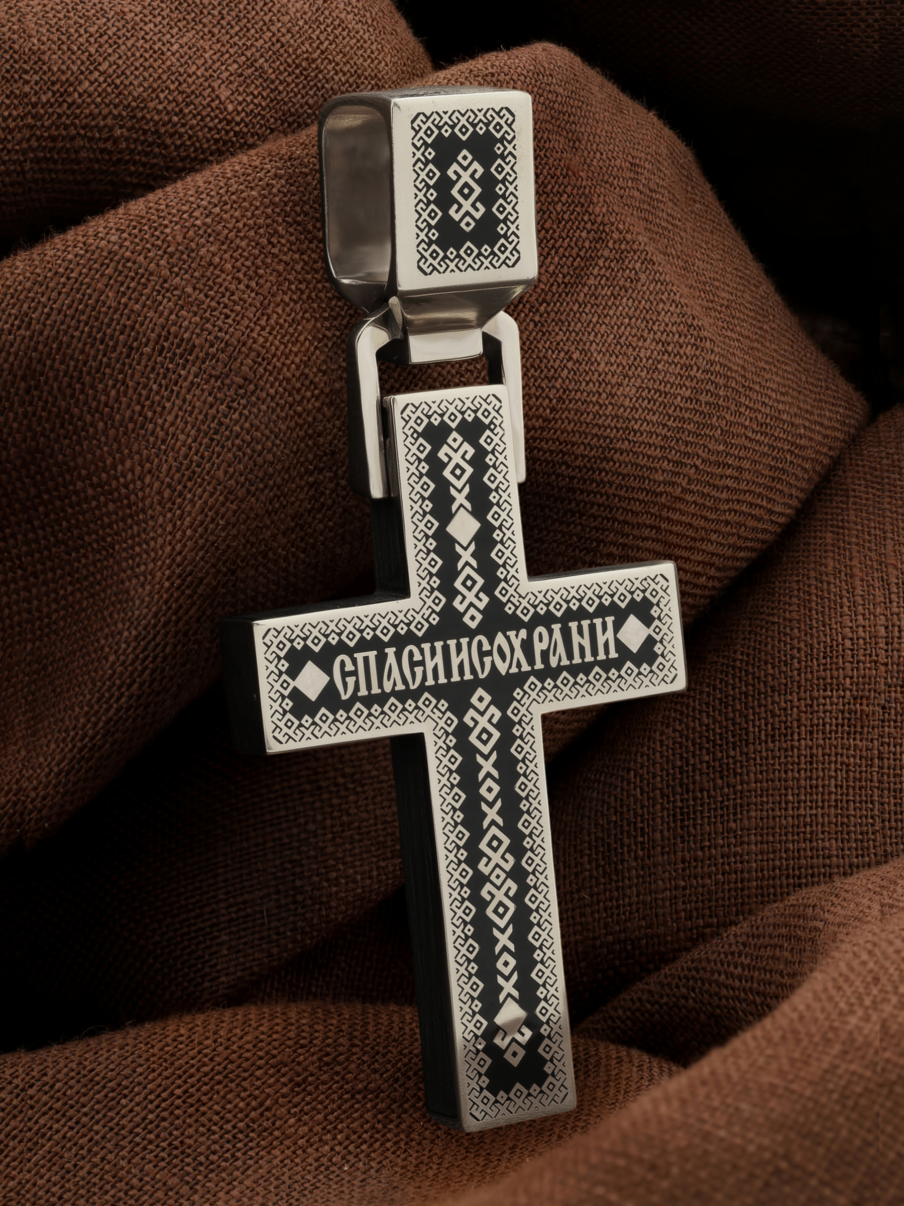 В центрально части оборотной стороны креста написана молитва: «Спаси и сохрани».