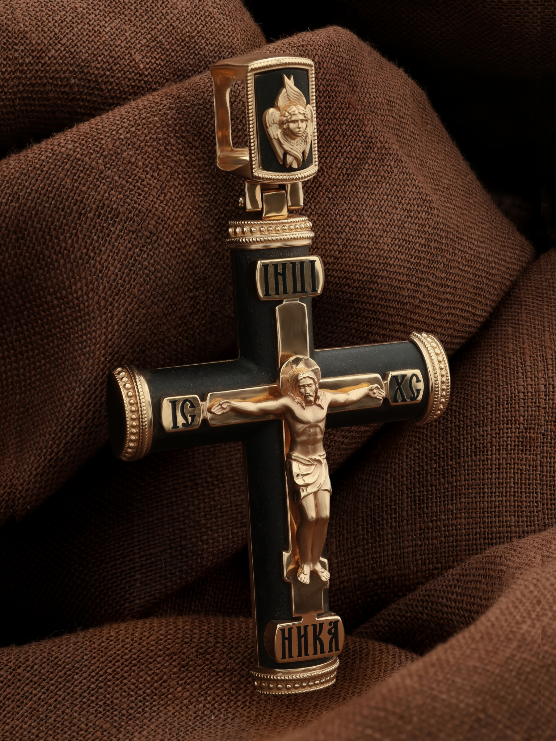 На лицевой стороне креста изображено Распятие Господа и Спасителя нашего Иисуса Христа. Своими крестными страданиями Господь смыл наши грехи, покрыл наш долг перед Богом или, на языке Писания, нас «искупил». В Голгофе сокрыта непостижимая тайна бесконечной правды и любви Бога. Крест стал символом победы добра над злом, жизни над смертью, напоминанием бесконечной Божьей любви, предметом радости. Воплотившийся Сын Божий Своею кровью освятил крест и сделал его проводником Своей благодати, источником освящения верующих. Христос в Своей Божественной любви, над которой смерть не властна и которая, страдая, и не страдает в обычном смысле, простирает к людям со Креста Свои объятия, в которые призывается и привлекается весь мир. Поэтому Тело Его не висит, а торжественно покоится на Кресте.