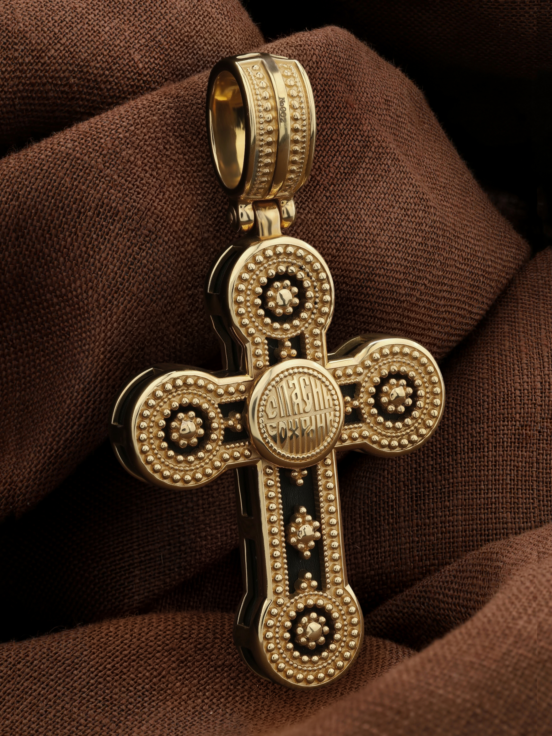 В центрально части оборотной стороны креста написана молитва: «Спаси и сохрани».