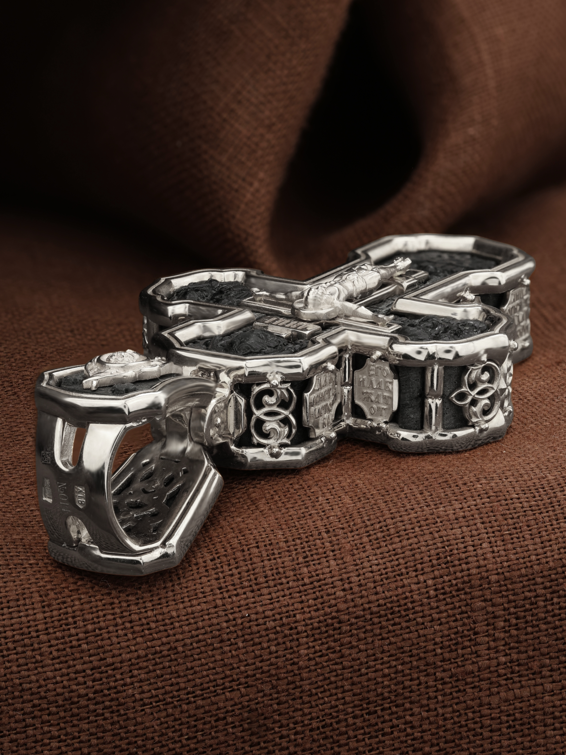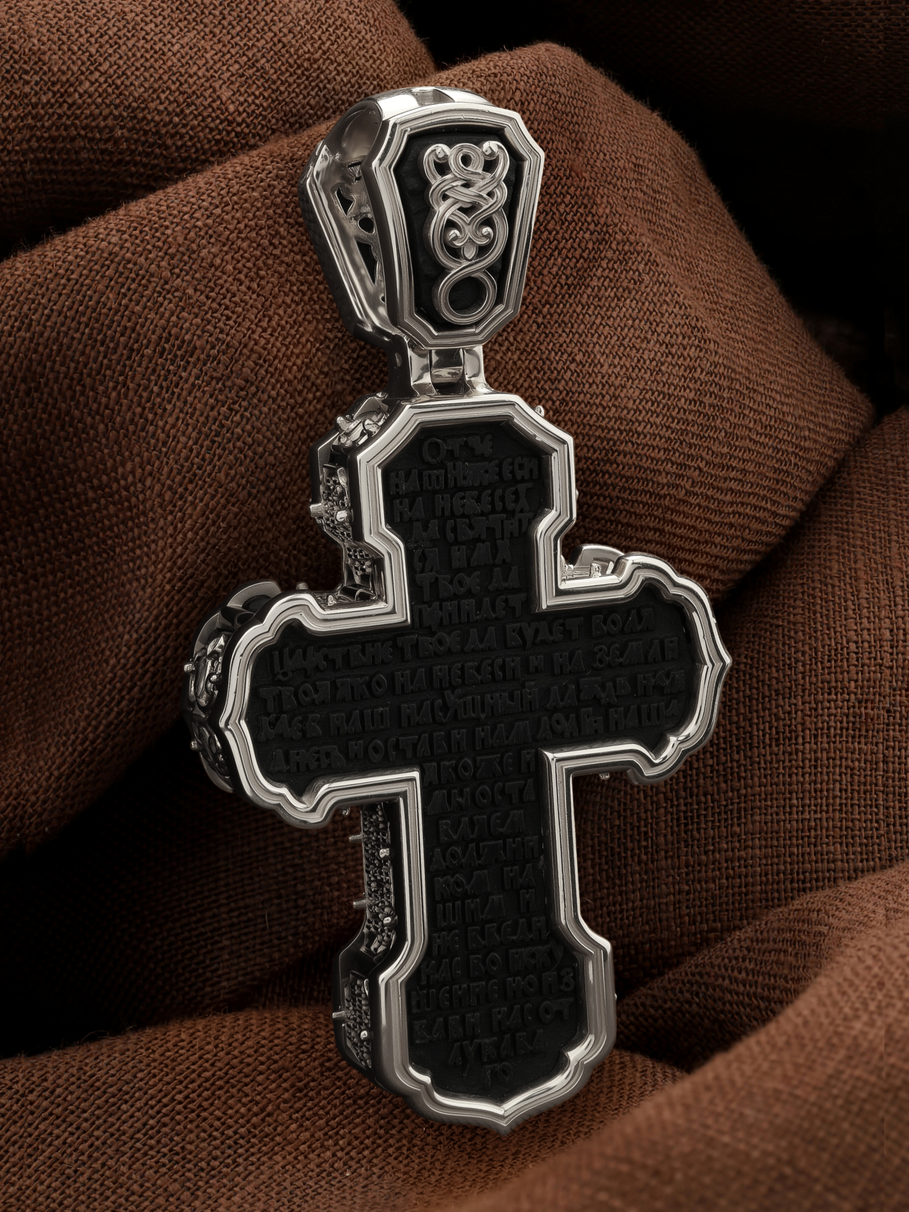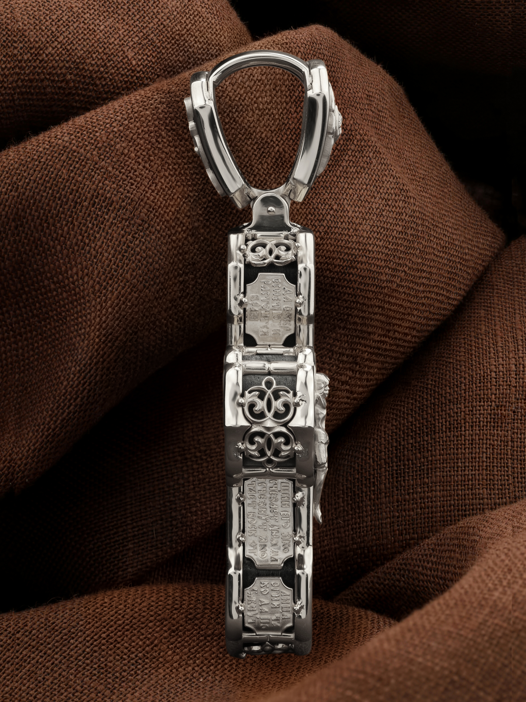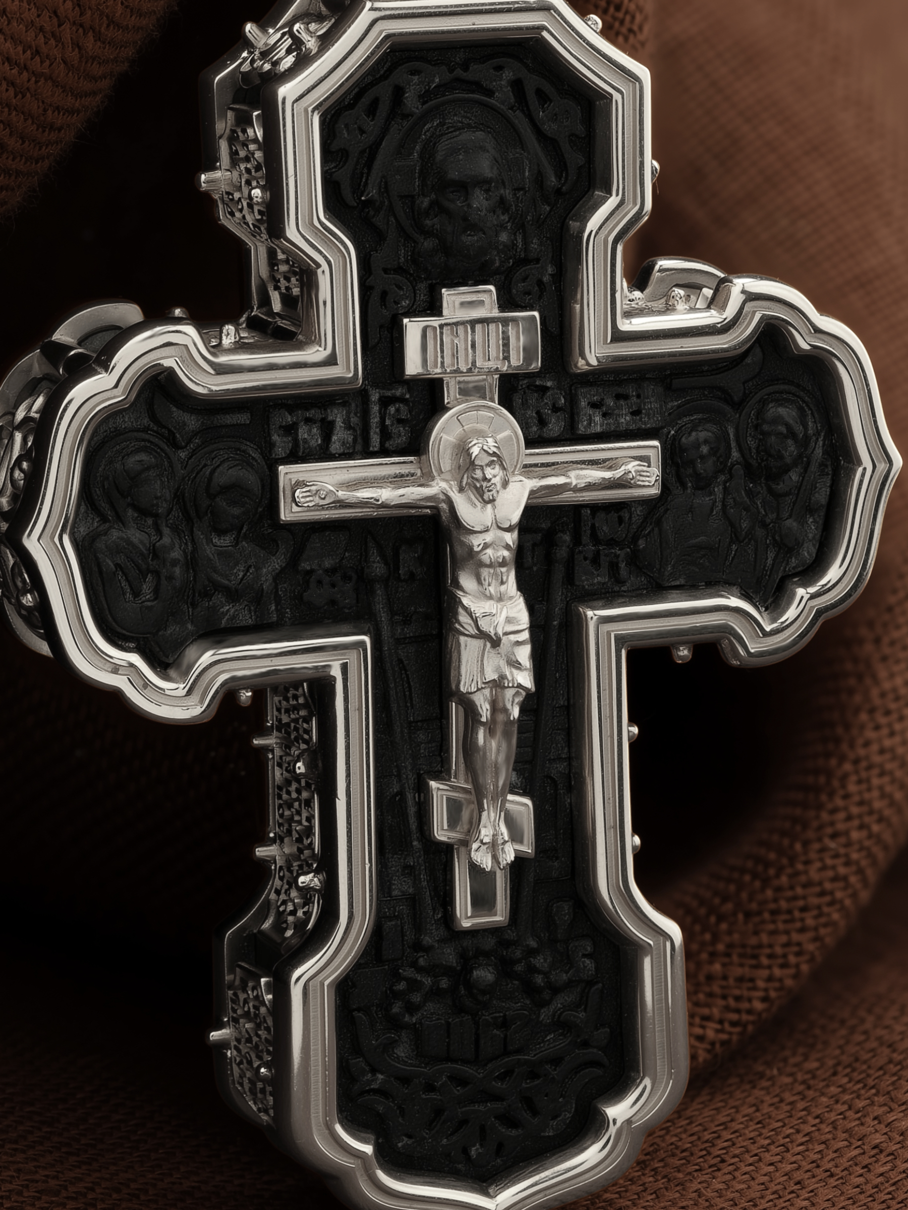 На лицевой стороне креста изображено Распятие Господа и Спасителя нашего Иисуса Христа. Крест- символ спасения и искупления рода человеческого, знамение победы над смертью и адом. Иисус Христос, как искупительная жертва освобождения человечества от власти греха, умер крестной смертью и в третий день воскрес. На верхней табличке, выше головы Иисуса, расположена надпись, составленная Понтием Пилатом — «IНЦI». Она означает «Иисус Назорей, Царь Иудейский». Надпись «IС» « ХС» означает Иисус Христос и помещается на разных сторонах поперечной (большой) перекладины креста. Рядом расположена надпись «Сын Божий». Выше Распятия изображен Нерукотворный образ Господа и Спасителя нашего Иисуса Христа. Слева от Распятия — Пресвятая Богородица и святая мироносица Мария Магдалина с крестом в руке. Справа — апостол и евангелист Иоанн Богослов, один из ближайших учеников Иисуса Христа и сотник Лонгин с крестом в правой руке и копьем — в левой. За крестом высится Иерусалимская стена. Крест стоит на горе камней, символизирующих Голгофу. В ее основании различается череп — это голова Адама. Вдоль креста изображены копие сотника Лонгина и трость с губкой и буквы «К» и «Т». Надпись «МЛРБ» — «место лобное рай бысть» означает, что место лобное стало раем и помещаются в нижней части креста. Рядом — слово «НИКА», что означает «победитель». На православном кресте Христос не умирает, а свободно простирает руки, ладони Иисуса открыты, будто он хочет обнять все человечество, даря им свою любовь и открывая путь к вечной жизни. На кулонном кольце изображен шестикрылый Серафим.