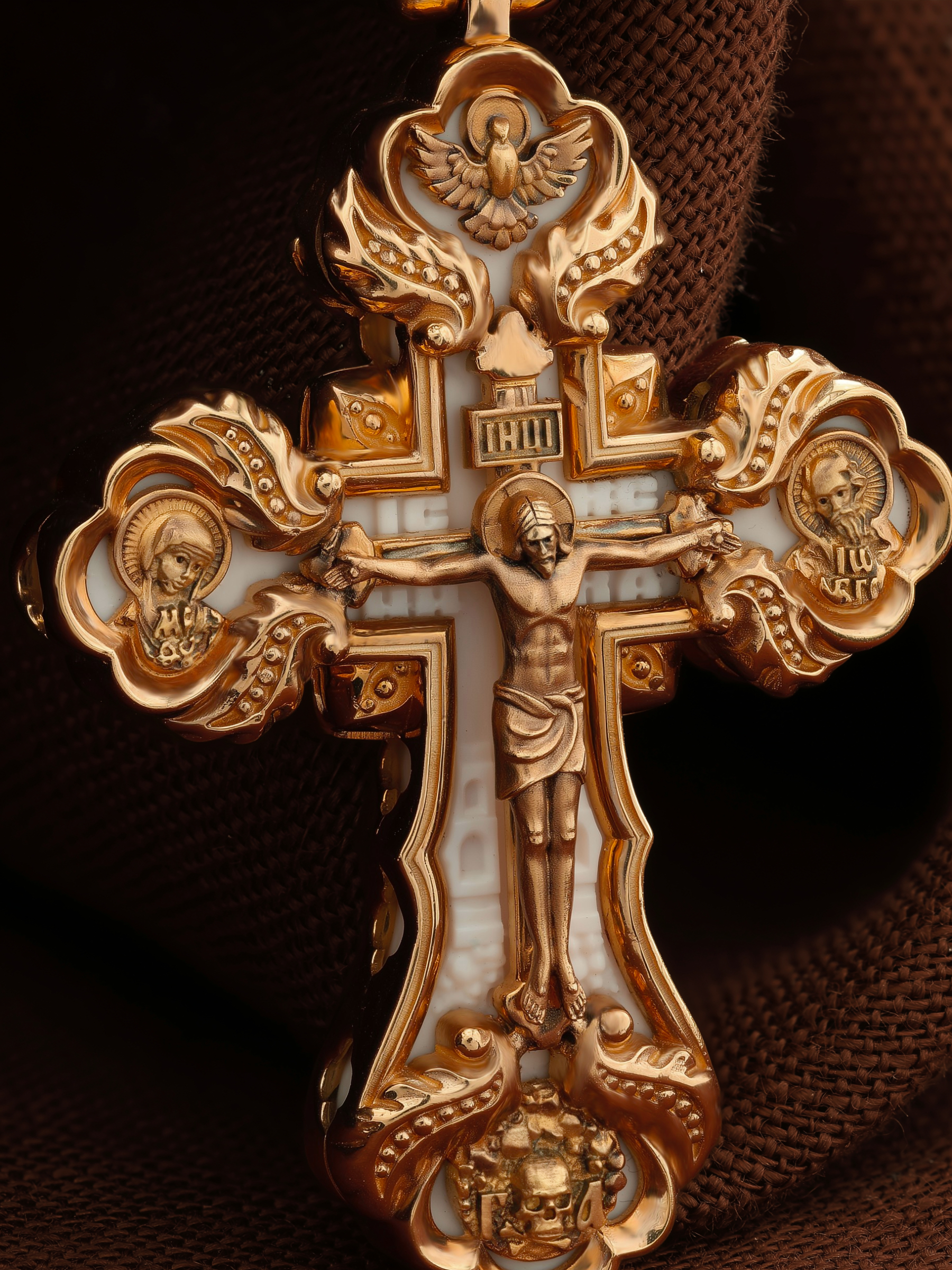 На лицевой стороне креста изображено Распятие Господа и Спасителя нашего Иисуса Христа. Крест- символ спасения и искупления рода человеческого, знамение победы над смертью и адом. Иисус Христос, как искупительная жертва освобождения человечества от власти греха, умер крестной смертью и в третий день воскрес. На верхней табличке, выше головы Иисуса, расположена надпись, составленная Понтием Пилатом — «ИНЦИ». Она означает «Иисус Назорей, Царь Иудейский». Над перекладиной написано сокращенно имя Спасителя «IC» «XC» — Иисус Христос. Ниже перекладины написано слово «НИКА» (греч. — Победитель). Крест стоит на горе камней, символизирующих Голгофу. В ее основании различается череп и надписи «Г.А.» — это голова Адама. Слева от Распятия помещен лик Пречистой Богородицы, скорой помощницы и заступницы рода Христианского. Слева изображен апостол и евангелист Иоанн Богослов, один из ближайших учеников Иисуса Христа. Над Распятием — изображение Духа Святого в виде голубя, сходящего с Небес. На кулонном кольце помещен крест.