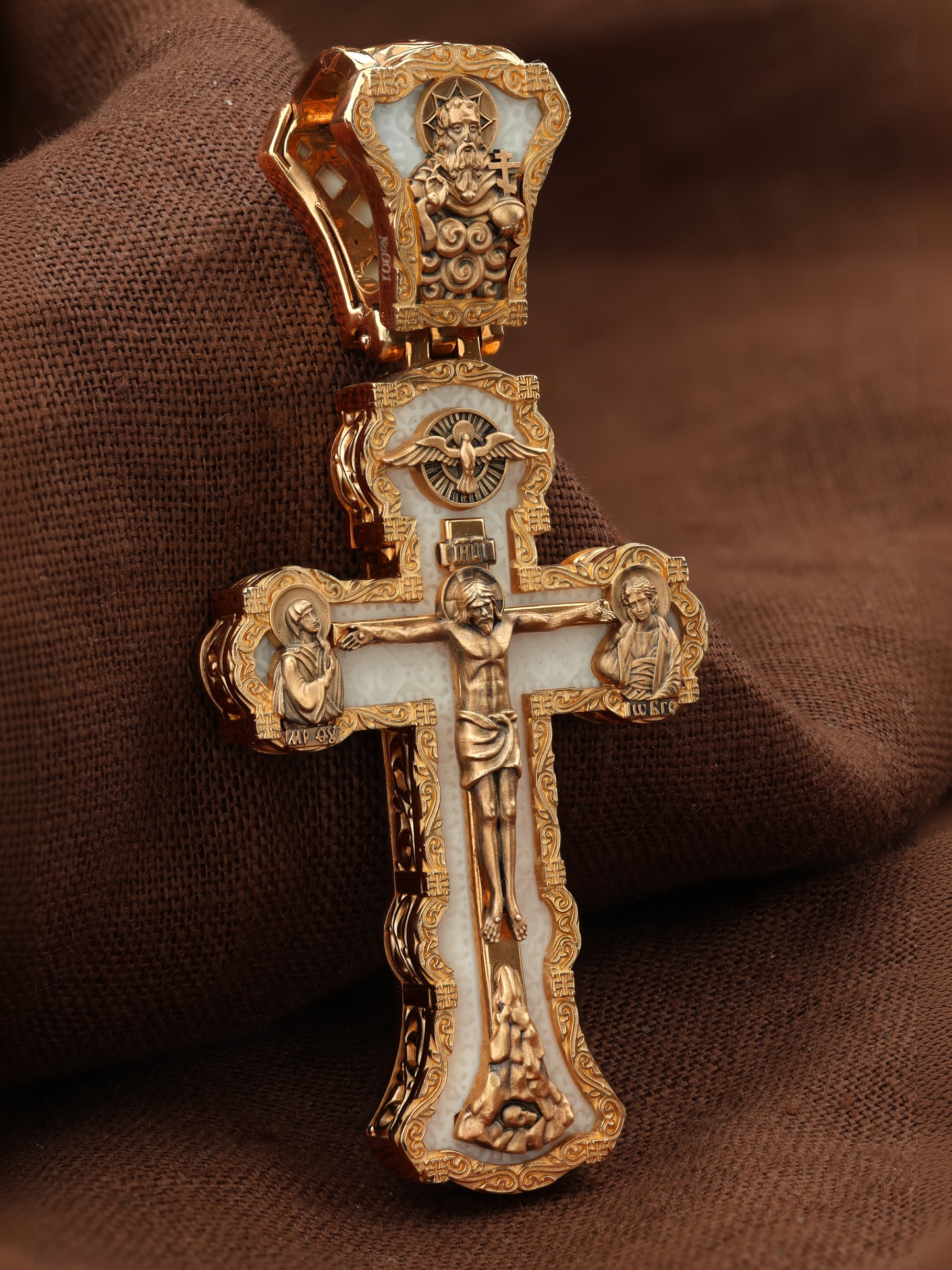 На лицевой стороне креста изображено Распятие Господа и Спасителя нашего Иисуса Христа. Христос, подвергнутый на кресте мучительной казни, своими страданиями искупил нас от древнего греха и даровал нам жизнь вечную. Без Распятия не было бы Воскресения Христова, и поэтому Крест из орудия казни обратился в святыню, в которой действует Благодать Божия. Через крестную жертву Бог раскрывает нам Свою безмерную любовь и призывает к ответной любви. На верхней табличке, выше головы Иисуса, расположена надпись, составленная Понтием Пилатом на трех языках — «IНЦI». Она означает «Иисус Назорей, Царь Иудейский». Надпись «IС ХС» означает Иисус Христос и помещается на разных сторонах поперечной (большой) перекладины креста. Крест стоит на горе камней, символизирующих Голгофу. В ее основании различается череп– это голова Адама. У Креста стоят оплакивающие Господа Божия Матерь и апостол Иоанн Богослов. Из всех апостолов об одном лишь Иоанне Богослове говорится, что он стоял на Голгофе у креста Спасителя, не заботясь о собственной безопасности. Он услышал обращенные к Ней с высоты Креста слова Распятого Господа: «Жено, се сын Твой» и к нему: «Се Мати твоя». С этого времени Иоанн взял Матерь Божию к себе, и Она жила в его доме до самой смерти. Над Распятием — изображение Духа Святого в виде голубя, сходящего с Небес. На кулонном кольце изображен Бог Отец.