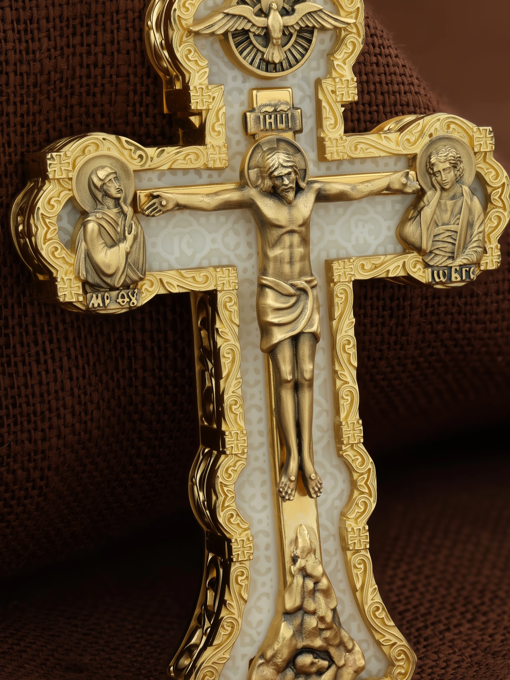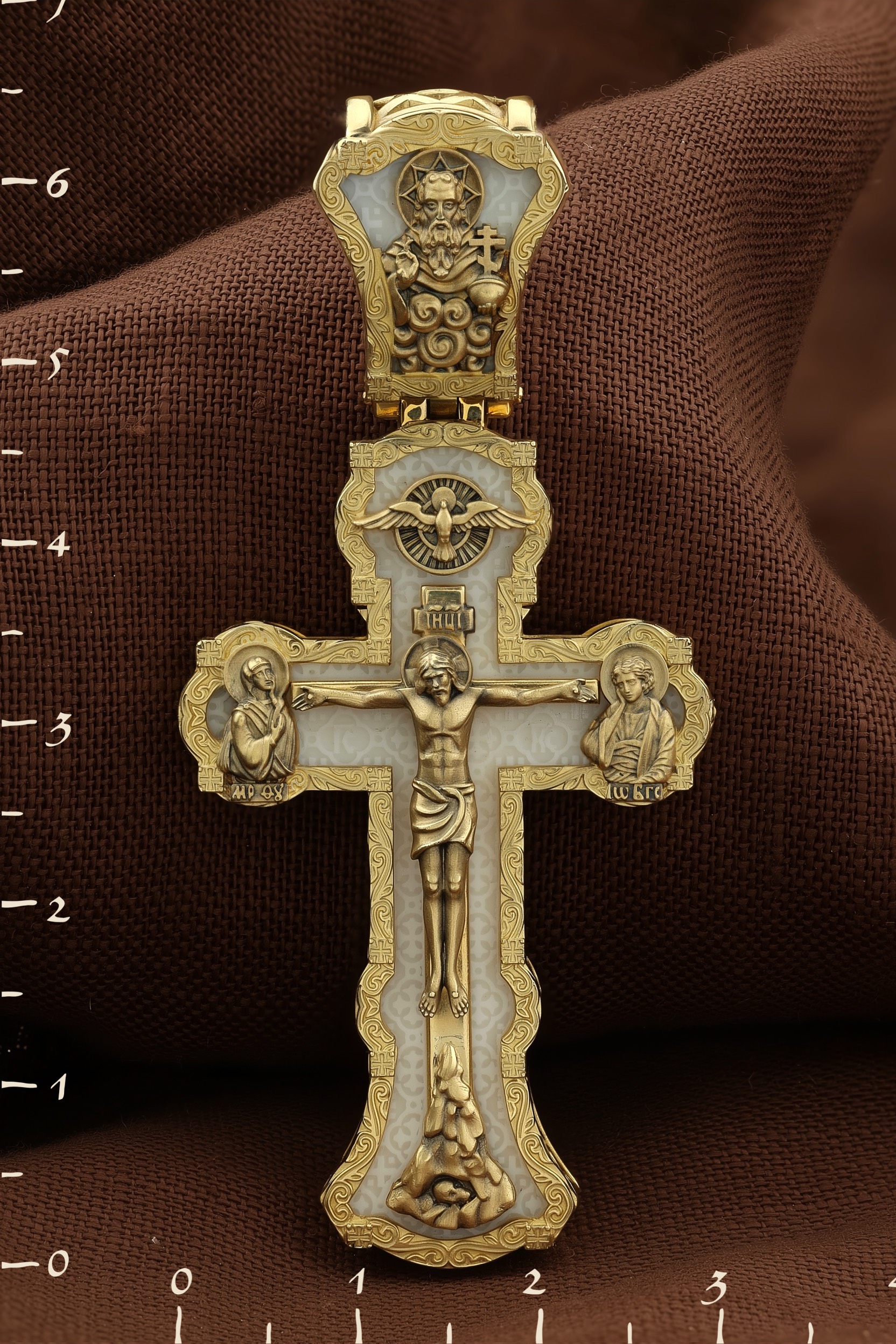 На лицевой стороне креста изображено Распятие Господа и Спасителя нашего Иисуса Христа. Христос, подвергнутый на кресте мучительной казни, своими страданиями искупил нас от древнего греха и даровал нам жизнь вечную. Без Распятия не было бы Воскресения Христова, и поэтому Крест из орудия казни обратился в святыню, в которой действует Благодать Божия. Через крестную жертву Бог раскрывает нам Свою безмерную любовь и призывает к ответной любви. На верхней табличке, выше головы Иисуса, расположена надпись, составленная Понтием Пилатом на трех языках — «IНЦI». Она означает «Иисус Назорей, Царь Иудейский». Надпись «IС ХС» означает Иисус Христос и помещается на разных сторонах поперечной (большой) перекладины креста. Крест стоит на горе камней, символизирующих Голгофу. В ее основании различается череп– это голова Адама. У Креста стоят оплакивающие Господа Божия Матерь и апостол Иоанн Богослов. Из всех апостолов об одном лишь Иоанне Богослове говорится, что он стоял на Голгофе у креста Спасителя, не заботясь о собственной безопасности. Он услышал обращенные к Ней с высоты Креста слова Распятого Господа: «Жено, се сын Твой» и к нему: «Се Мати твоя». С этого времени Иоанн взял Матерь Божию к себе, и Она жила в его доме до самой смерти. Над Распятием — изображение Духа Святого в виде голубя, сходящего с Небес. На кулонном кольце изображен Бог Отец.