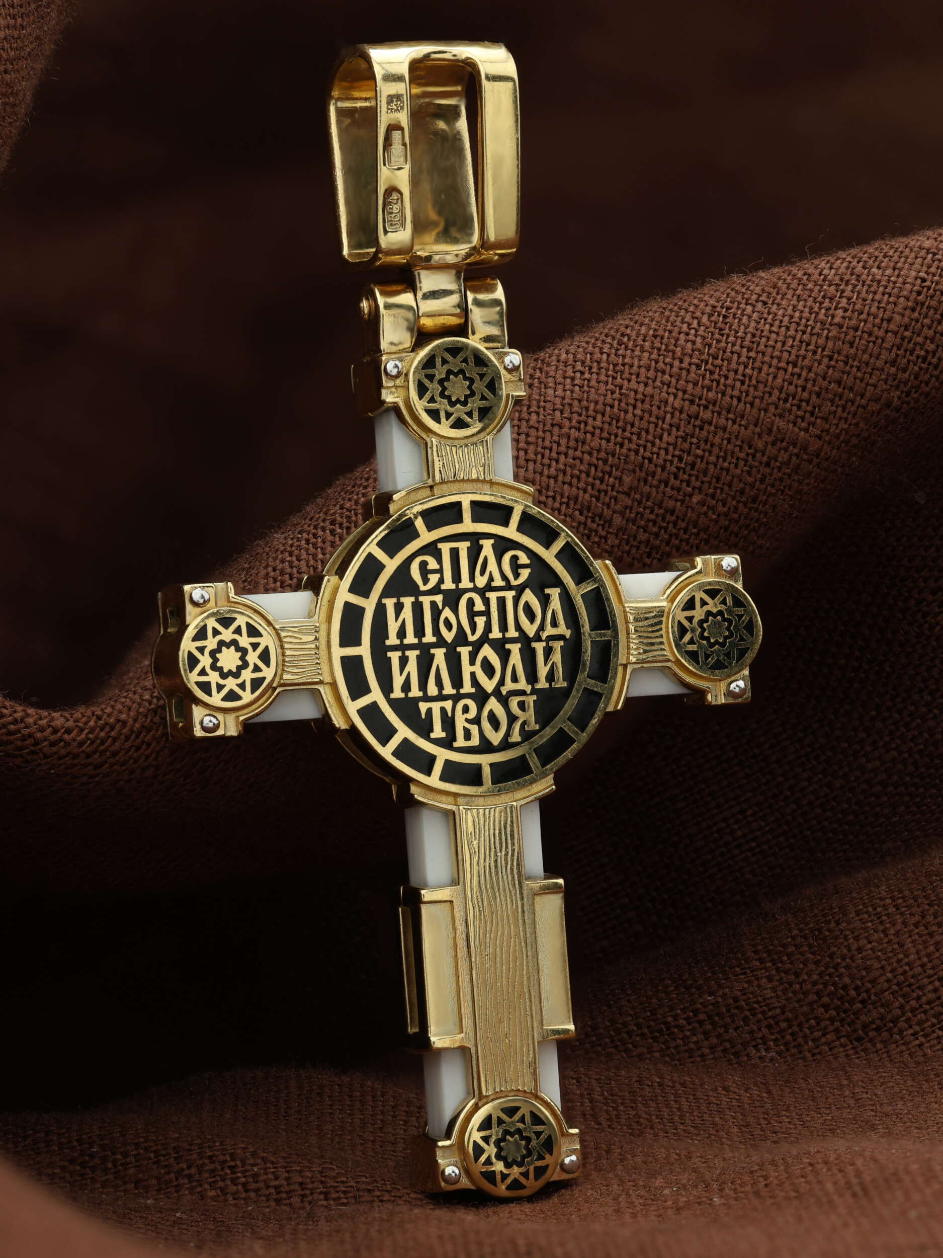 На лицевой стороне креста изображено Распятие Господа и Спасителя нашего Иисуса Христа. Христос, подвергнутый на кресте мучительной казни, своими страданиями искупил нас от древнего греха и даровал нам жизнь вечную. Без Распятия не было бы Воскресения Христова, и поэтому Крест из орудия казни обратился в святыню, в которой действует Благодать Божия. В Голгофе сокрыта непостижимая тайна бесконечной правды и любви Бога. Крест стал символом победы добра над злом, жизни над смертью, напоминанием бесконечной Божьей любви, предметом радости. Воплотившийся Сын Божий Своею кровью освятил крест и сделал его проводником Своей благодати, источником освящения верующих. Через крестную жертву Бог раскрывает нам Свою безмерную любовь и призывает к ответной любви. Над вершиной Распятия помещена надпись «Царь Славы». На верхней табличке, выше головы Иисуса, расположена надпись, составленная Понтием Пилатом — «IНЦI». Она означает «Иисус Назорей, Царь Иудейский». Надпись «IС ХС» означает Иисус Христос помещается на разных сторонах поперечной перекладины креста. Рядом помещены словосочетание «СЫН БОЖИЙ», что означает божественную природу Иисуса Христа и надпись –«НИКА», что означает победитель. Надпись «Г.А.» — голова Адама, грехи которого Христос омыл Своею Кровью, размещена под подножием креста. На православном кресте Христос не умирает, а свободно простирает руки, ладони Иисуса открыты, будто он хочет обнять все человечество, даря им свою любовь и открывая путь к вечной жизни. На кулонном кольце помещен крест Константина — монограмма, известная как «Хи-Ро» («хи» и «ро» — первые две буквы имени Христа по-гречески). Монограмма стала первым общепринятым символом христианства — как знак победы и спасения.