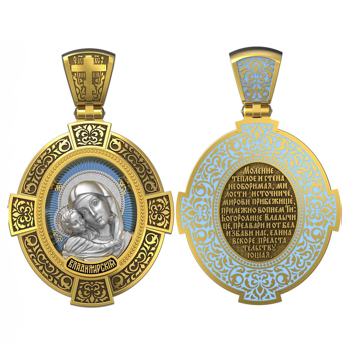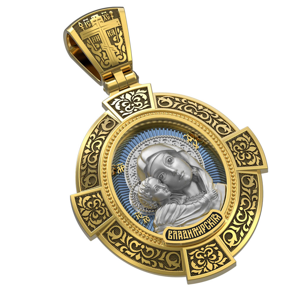 На лицевой стороне образка изображена Владимирская икона Божией Матери — одна из самых чтимых святынь Русской православной церкви. По преданию, икона была написана Святым апостолом и евангелистом Лукой во время земной жизни Богородицы. Дева Мария, увидев Свое изображение, молвила: «Отныне ублажат Мя вси роди. Благодать Рождшегося от Меня и Моя с сим образом да будет». Образ написан в лирическом иконографическом типе «Умиление». Младенец припал щекой к щеке Матери и тянется к ней правой рукой, другой нежно обнимая за шею. Икона вплоть до V века находилась в Иерусалиме, затем была перевезена в Византию. На Русь икона была привезена в 1131 г. За прошедшие столетия святыня неоднократно переезжала из Владимира в Москву и обратно, не раз спасая страну от захватчиков. Русская Православная Церковь установила троекратное празднование Владимирской иконе Божьей Матери. Каждый из дней празднования связан с избавлением русского народа от порабощения иноплеменниками по молитвам ко Пресвятой Богородице. В последующие века у иконы происходили многие важные исторические события: подписание актов, принятие присяги значимых государственных деятелей и возведение на престол. На кулонном кольце изображен Спас Нерукотворный — образ Господа и Спасителя нашего Иисуса Христа, чудесно отпечатавшийся на плате, котором Христос вытер свой лик.