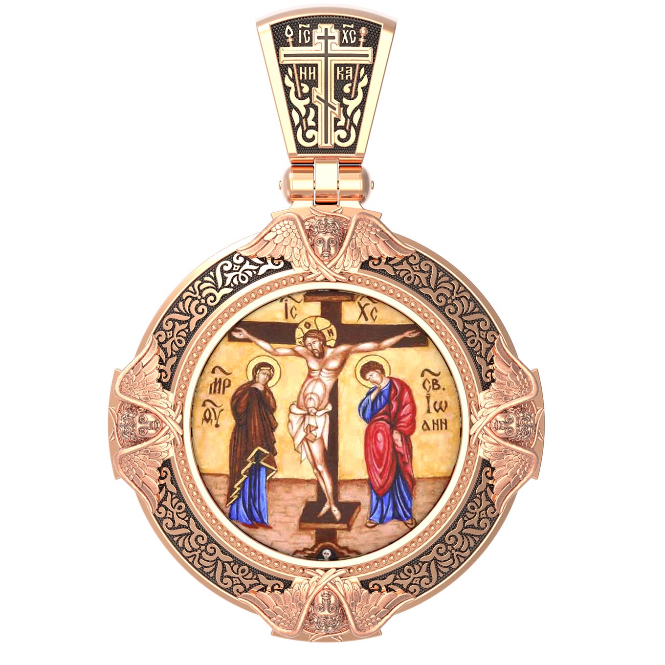 На лицевой стороне образка изображено Распятие Господа и Спасителя нашего Иисуса Христа. Своими крестными страданиями Господь смыл наши грехи, покрыл наш долг перед Богом или, на языке Писания, нас «искупил». В Голгофе сокрыта непостижимая тайна бесконечной правды и любви Бога. Крест стал символом победы добра над злом, жизни над смертью, напоминанием бесконечной Божьей любви, предметом радости. Воплотившийся Сын Божий Своею кровью освятил крест и сделал его проводником Своей благодати, источником освящения верующих. На верхней табличке, выше головы Иисуса, расположена надпись, составленная Понтием Пилатом — «IНЦI». Она означает «Иисус Назорей, Царь Иудейский». Ниже перекладины написано сокращенно имя Спасителя «IC» «XC» — Иисус Христос. Крест стоит на горе камней, символизирующих Голгофу. Под подножием Креста изображена покоящаяся голова (череп) Адама. Слева от Распятия стоят оплакивающие Господа Пресвятая Богородица и святая мироносица Мария Клеопова. Справа — апостол и евангелист Иоанн Богослов, один из ближайших учеников Иисуса Христа и сотник Лонгин с крестом в правой руке и копьем — в левой. По преданию, увидя, что они горько плачут, Иисус сказал Матери Своей: «Жено! Се сын Твой!» Потом сказал ученику Иоанну: «Се мати твоя». С этого времени Иоанн взял Матерь Божию к себе, и Она жила в его доме до самой смерти.