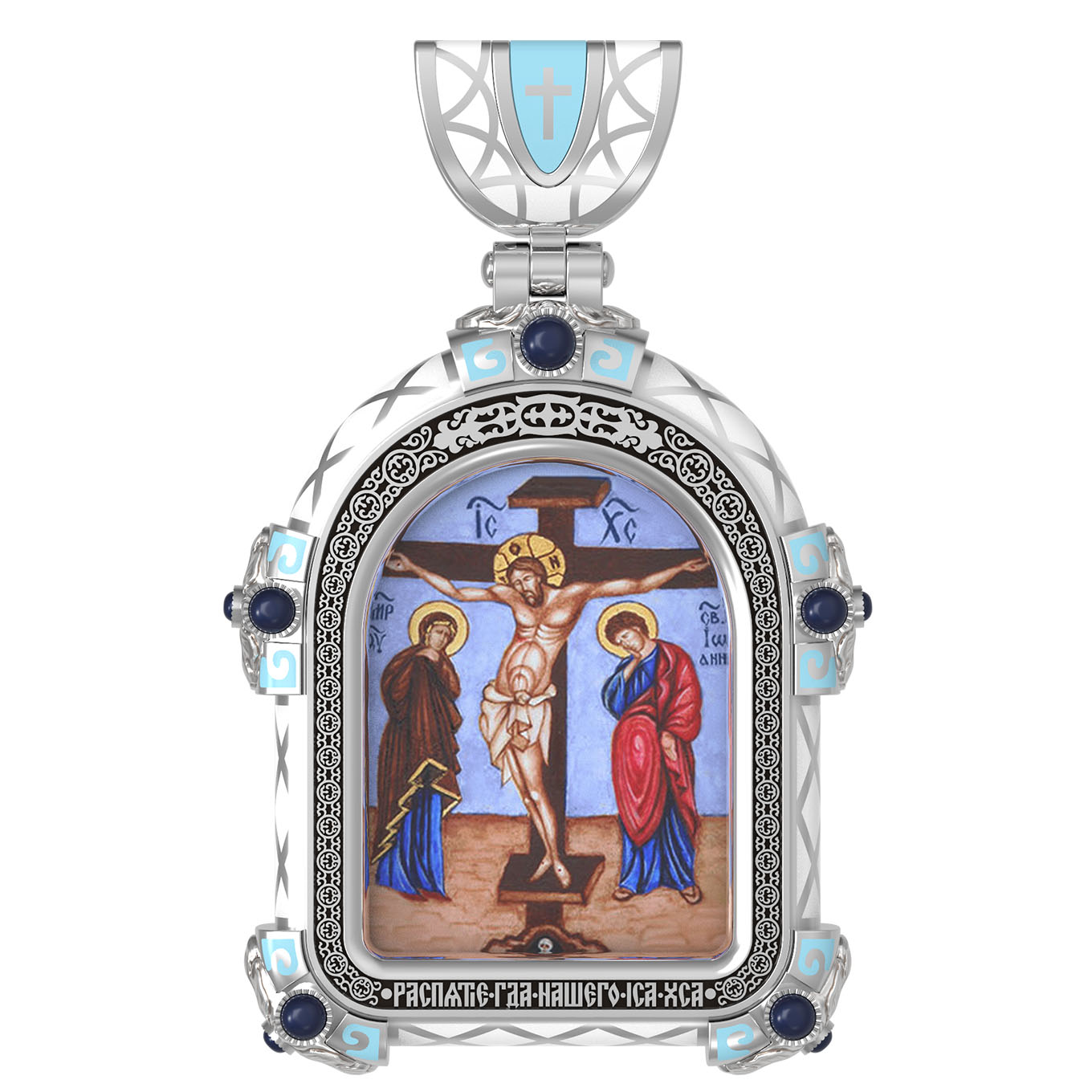 На лицевой стороне образка изображено Распятие Господа и Спасителя нашего Иисуса Христа. Своими крестными страданиями Господь смыл наши грехи, покрыл наш долг перед Богом или, на языке Писания, нас «искупил». В Голгофе сокрыта непостижимая тайна бесконечной правды и любви Бога. Крест стал символом победы добра над злом, жизни над смертью, напоминанием бесконечной Божьей любви, предметом радости. Воплотившийся Сын Божий Своею кровью освятил крест и сделал его проводником Своей благодати, источником освящения верующих. На верхней табличке, выше головы Иисуса, расположена надпись, составленная Понтием Пилатом — «IНЦI». Она означает «Иисус Назорей, Царь Иудейский». Ниже перекладины написано сокращенно имя Спасителя «IC» «XC» — Иисус Христос. Крест стоит на горе камней, символизирующих Голгофу. Под подножием Креста изображена покоящаяся голова (череп) Адама. Слева от Распятия стоят оплакивающие Господа Пресвятая Богородица и святая мироносица Мария Клеопова. Справа — апостол и евангелист Иоанн Богослов, один из ближайших учеников Иисуса Христа и сотник Лонгин с крестом в правой руке и копьем — в левой. По преданию, увидя, что они горько плачут, Иисус сказал Матери Своей: «Жено! Се сын Твой!» Потом сказал ученику Иоанну: «Се мати твоя». С этого времени Иоанн взял Матерь Божию к себе, и Она жила в его доме до самой смерти.