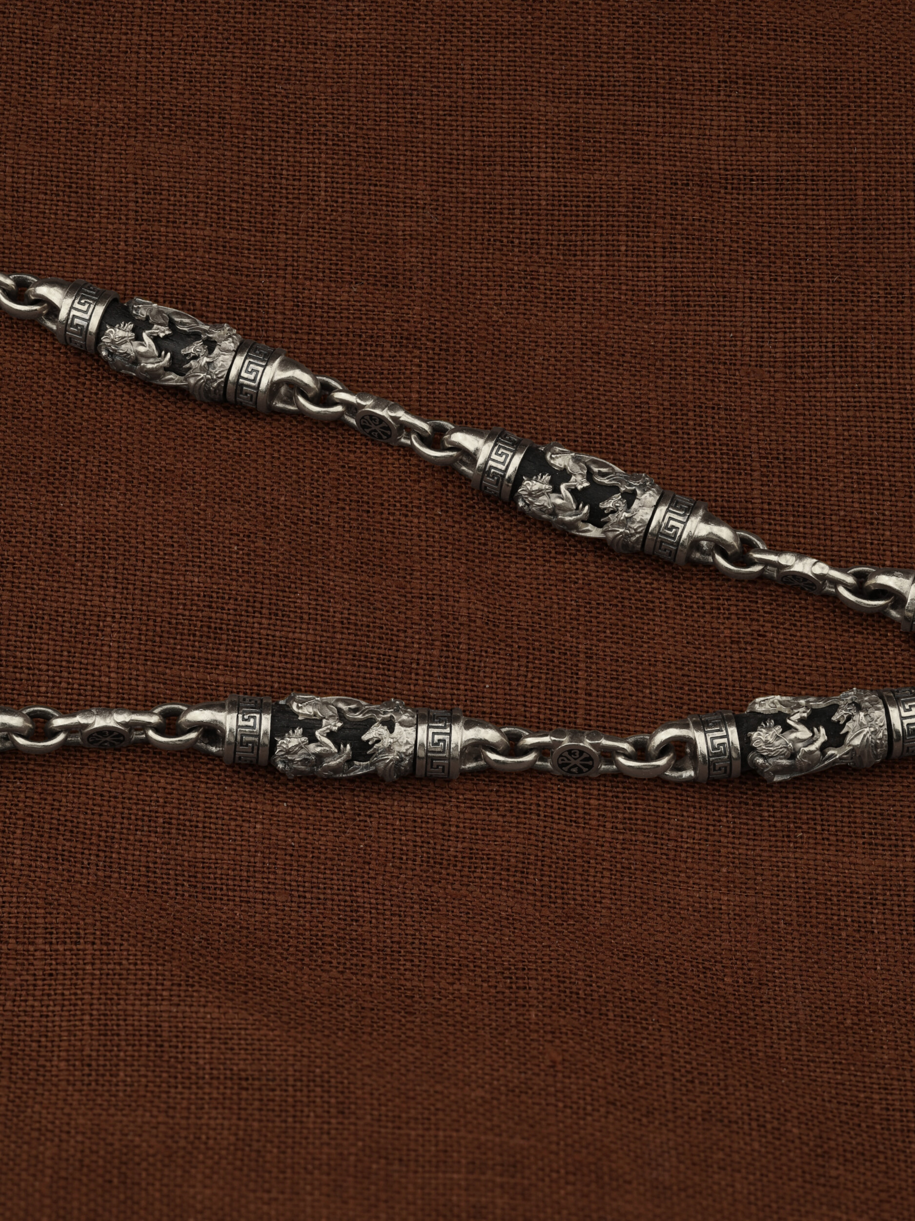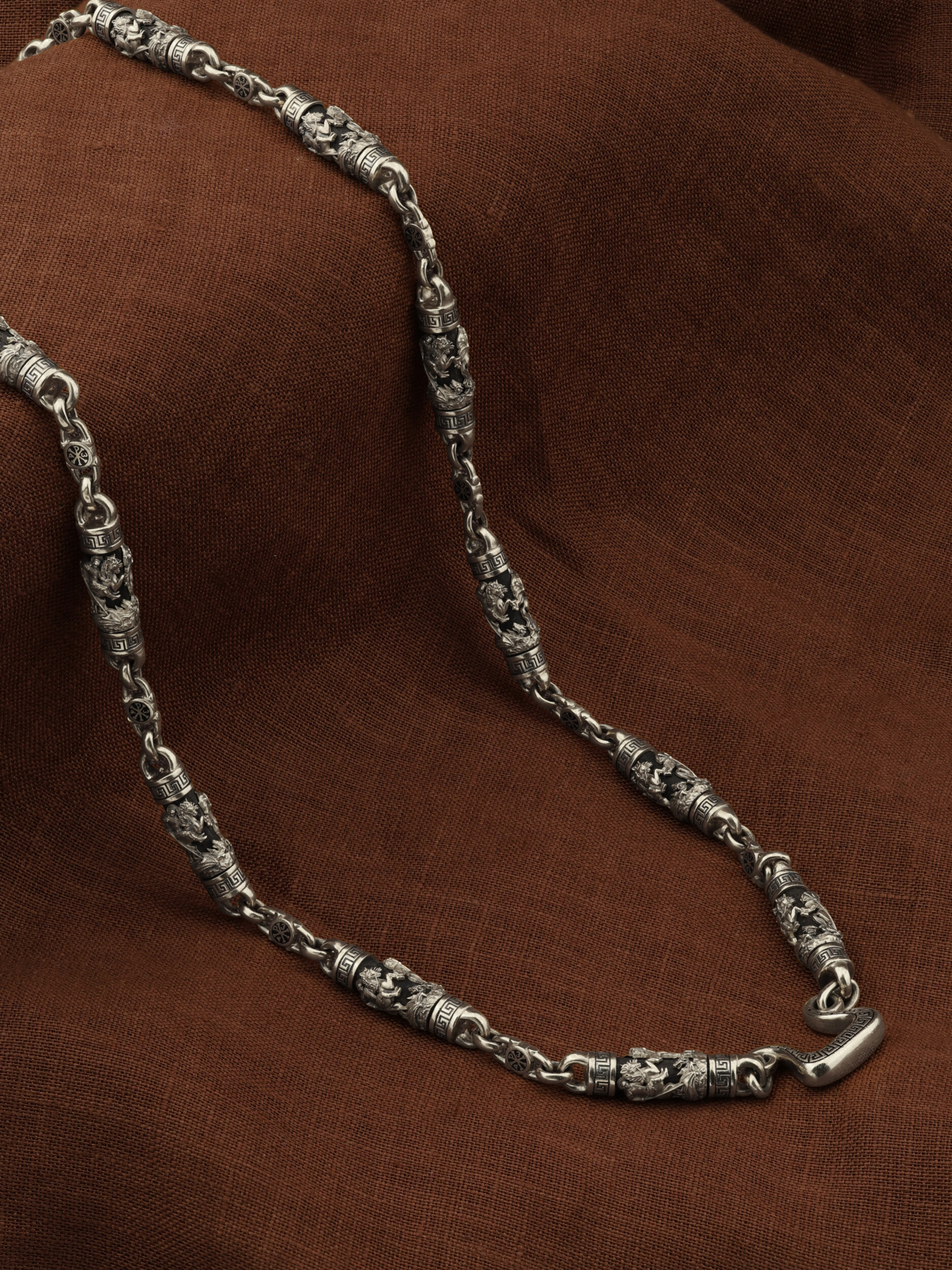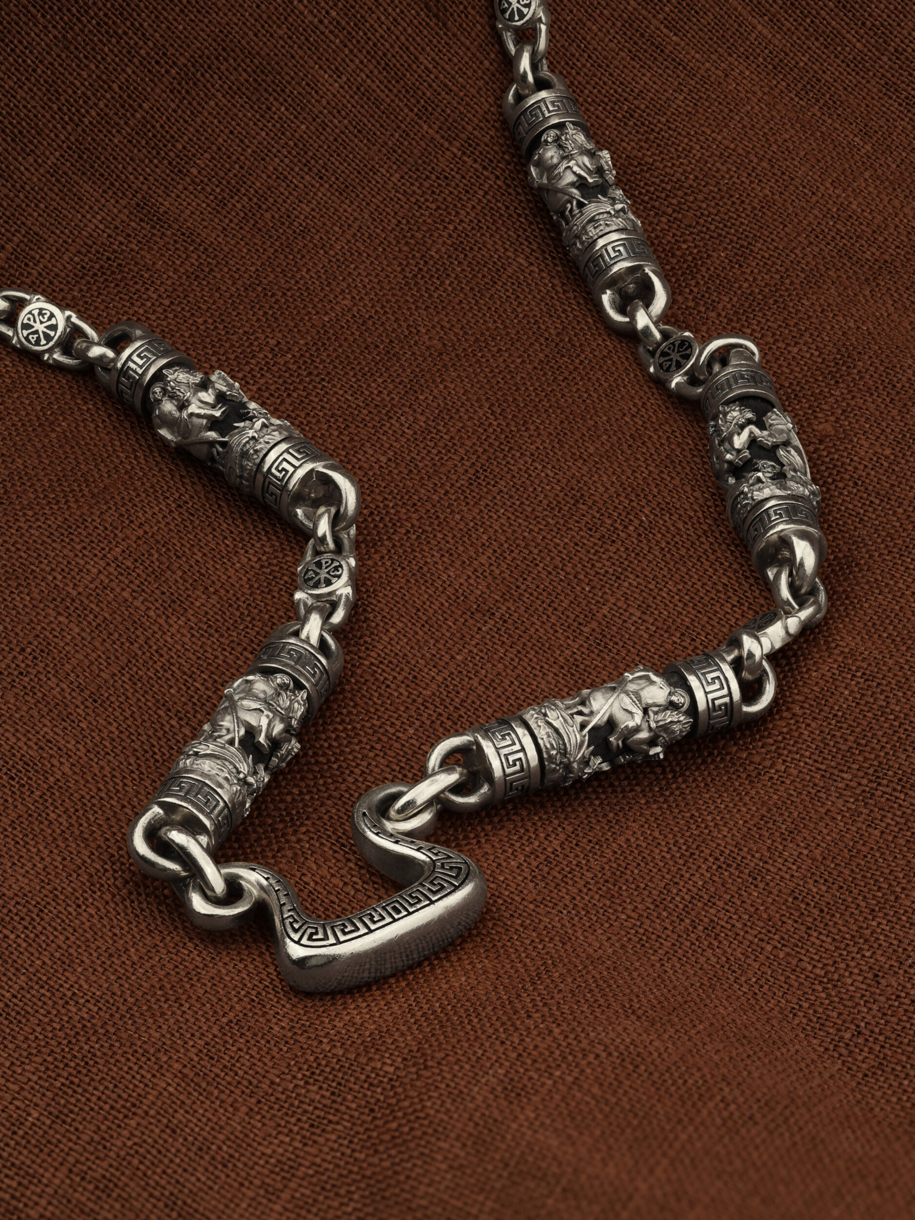 На звеньях цепи изображена Хризма — монограмма имени Христа, которая состоит из двух начальных греческих букв имени — Х (хи) и Р (ро), скрещённых между собой. По краям монограммы помещены греческие буквы a и w. Такое употребление этих букв восходит к тексту Апокалипсиса: «Аз есмь Альфа и Омега, начало и конец, говорит Господь, Который есть и был и грядет, Вседержитель.» (Откр. 1:8; см. также Откр. 22:13). Также на звеньях цепи помещено изображен святого великомученика Георгия Победоносца — одного из самых почитаемых и удивительных святых. Георгий родился в Каппадокии (Малая Азия) в семье богатых и знатных горожан. Юношей поступил на службу к римскому императору Диоклетиану, за отличное знание военного дела и проявленную в боях и походах храбрость был приближен к императору и удостоен высокого воинского звания. Во время начавшихся гонений на христиан, перешел на сторону гонимых и, отвергнув человеческий страх, стал ярым проповедником учения Христа. Мучители подвергли опального воеводу жесточайшим восьмидневным пыткам и казнили его (обезглавили) в возрасте около тридцати лет в 303 году. На Руси он известен как Юрий или Егорий, заступник для верующих, чья жизнь имеет какое-либо отношение к военным делам, помощник в крестьянском труде. На цепи Георгий изображен как воитель, сидящий на вздыбленном коне и поражающий копьем огнедышащего змея. Змей символизирует собою сатанинские силы. Молитвами вознесенными к Всевышнему и своей непреклонной верой он смог одолеть чудовище. Святой убил змея, спас царскую дочь, принесенную в жертву, и жителей города, их души от влияния дьявола, породив в них надежду и веру в Господа, призывая людей принять христианскую веру. Цепь украшена орнаментом.