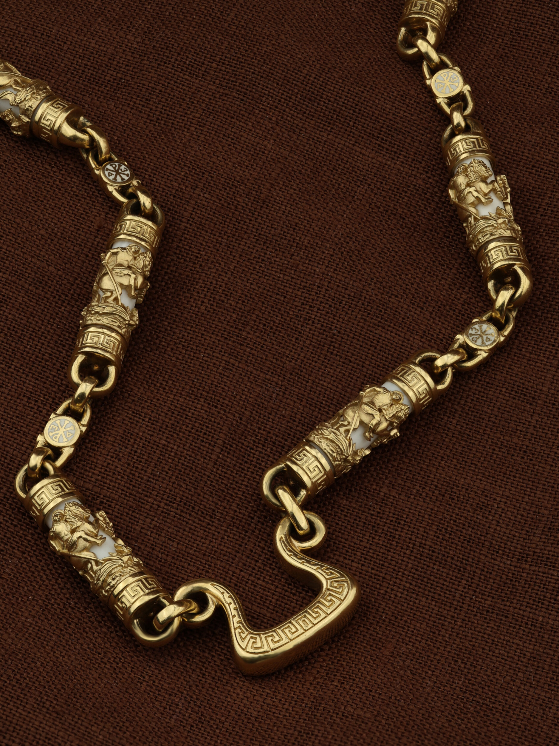 На звеньях цепи изображена Хризма — монограмма имени Христа, которая состоит из двух начальных греческих букв имени  — Х (хи) и Р (ро), скрещённых между собой. По краям монограммы помещены греческие буквы a и w. Такое употребление этих букв восходит к тексту Апокалипсиса: «Аз есмь Альфа и Омега, начало и конец, говорит Господь, Который есть и был и грядет, Вседержитель.» (Откр. 1:8; см. также Откр. 22:13). Также на звеньях цепи помещено изображен святого великомученика Георгия Победоносца — одного из самых почитаемых и удивительных святых. Георгий родился в Каппадокии (Малая Азия) в семье богатых и знатных горожан. Юношей поступил на службу к римскому императору Диоклетиану, за отличное знание военного дела и проявленную в боях и походах храбрость был приближен к императору и удостоен высокого воинского звания. Во время начавшихся гонений на христиан, перешел на сторону гонимых и, отвергнув человеческий страх, стал ярым проповедником учения Христа. Мучители подвергли опального воеводу жесточайшим восьмидневным пыткам и казнили его (обезглавили) в возрасте около тридцати лет в 303 году. На Руси он известен как Юрий или Егорий, заступник для верующих, чья жизнь имеет какое-либо отношение к военным делам, помощник в крестьянском труде. На цепи Георгий изображен как воитель, сидящий на вздыбленном коне и поражающий копьем огнедышащего змея. Змей символизирует собою сатанинские силы. Молитвами вознесенными к Всевышнему и своей непреклонной верой он смог одолеть чудовище. Святой убил змея, спас царскую дочь, принесенную в жертву, и жителей города, их души от влияния дьявола, породив в них надежду и веру в Господа, призывая людей принять христианскую веру. Цепь украшена орнаментом.