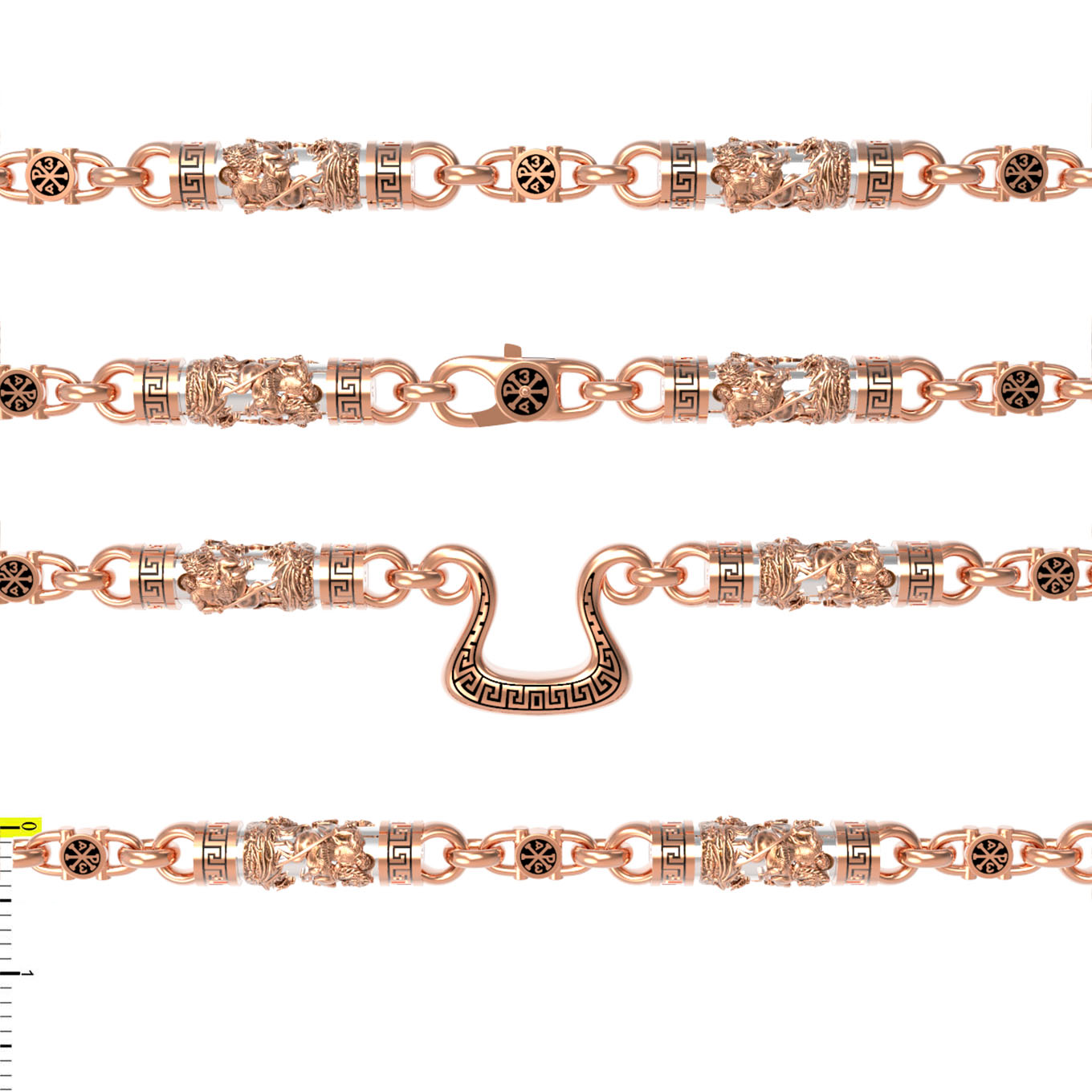 На звеньях цепи изображена Хризма — монограмма имени Христа, которая состоит из двух начальных греческих букв имени — Х (хи) и Р (ро), скрещённых между собой. По краям монограммы помещены греческие буквы a и w. Такое употребление этих букв восходит к тексту Апокалипсиса: «Аз есмь Альфа и Омега, начало и конец, говорит Господь, Который есть и был и грядет, Вседержитель.» (Откр. 1:8; см. также Откр. 22:13). Также на звеньях цепи помещено изображен святого великомученика Георгия Победоносца — одного из самых почитаемых и удивительных святых. Георгий родился в Каппадокии (Малая Азия) в семье богатых и знатных горожан. Юношей поступил на службу к римскому императору Диоклетиану, за отличное знание военного дела и проявленную в боях и походах храбрость был приближен к императору и удостоен высокого воинского звания. Во время начавшихся гонений на христиан, перешел на сторону гонимых и, отвергнув человеческий страх, стал ярым проповедником учения Христа. Мучители подвергли опального воеводу жесточайшим восьмидневным пыткам и казнили его (обезглавили) в возрасте около тридцати лет в 303 году. На Руси он известен как Юрий или Егорий, заступник для верующих, чья жизнь имеет какое-либо отношение к военным делам, помощник в крестьянском труде. На цепи Георгий изображен как воитель, сидящий на вздыбленном коне и поражающий копьем огнедышащего змея. Змей символизирует собою сатанинские силы. Молитвами вознесенными к Всевышнему и своей непреклонной верой он смог одолеть чудовище. Святой убил змея, спас царскую дочь, принесенную в жертву, и жителей города, их души от влияния дьявола, породив в них надежду и веру в Господа, призывая людей принять христианскую веру. Цепь украшена орнаментом.