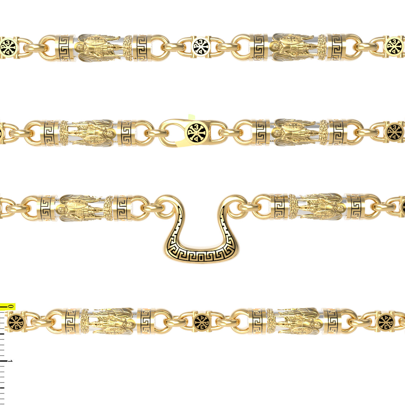 На звеньях цепи изображена Хризма — монограмма имени Христа, которая состоит из двух начальных греческих букв имени — Х (хи) и Р (ро), скрещённых между собой. По краям монограммы помещены греческие буквы a и w. Такое употребление этих букв восходит к тексту Апокалипсиса: «Аз есмь Альфа и Омега, начало и конец, говорит Господь, Который есть и был и грядет, Вседержитель.» (Откр. 1:8; см. также Откр. 22:13). Также на звеньях изображен Святой Ангел-Хранитель в виде прекрасного юноши держащего в правой руке мечь, а в левой — щит. Ангел-Хранитель — это Ангел приставляемый Богом к человеку при крещении для охраны и помощи в добрых делах. Он невидимо находится при человеке на протяжении всей его жизни, если человек сохраняет в себе любовь к Богу и истинную веру перед Ним. Ангел-Xранитель делают для нас все, что служит к истинному нашему благу и спасению. Невидимо пребывая при нас постоянно, он, руководствуя нас ко спасению, не только по нашему желанию таинственно наставляет нас на все доброе и полезное, не только возносит наши молитвы к Богу, но еще и сам от себя охраняют и защищают нас от врагов видимых и невидимых и ходатайствует за нас пред Богом. Ангел-Хранитель так любит нас, как никто на земле любить не может. Одного лишь каждому из нас он желает — спасения души; к этому он направляет все свои заботы. И если видит нас также заботящимися о спасении, радуется, если же видит нас пребывающими в нерадении о душе своей, скорбит. Но и самый великий грешник может примириться со своим Ангелом-Хранителем посредством искреннего раскаяния в грехах и оставления их навсегда. В таком случае, по слову Писания, великая радость бывает для всех ангелов на небесах (Лк. 15:10). Цепь украшена орнаментом.