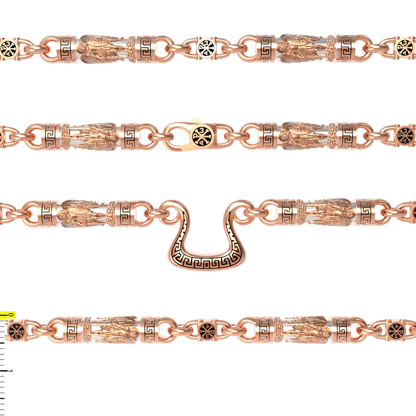 На звеньях цепи изображена Хризма — монограмма имени Христа, которая состоит из двух начальных греческих букв имени — Х (хи) и Р (ро), скрещённых между собой. По краям монограммы помещены греческие буквы a и w. Такое употребление этих букв восходит к тексту Апокалипсиса: «Аз есмь Альфа и Омега, начало и конец, говорит Господь, Который есть и был и грядет, Вседержитель.» (Откр. 1:8; см. также Откр. 22:13). Также на звеньях изображен Святой Ангел-Хранитель в виде прекрасного юноши держащего в правой руке мечь, а в левой — щит. Ангел-Хранитель — это Ангел приставляемый Богом к человеку при крещении для охраны и помощи в добрых делах. Он невидимо находится при человеке на протяжении всей его жизни, если человек сохраняет в себе любовь к Богу и истинную веру перед Ним. Ангел-Xранитель делают для нас все, что служит к истинному нашему благу и спасению. Невидимо пребывая при нас постоянно, он, руководствуя нас ко спасению, не только по нашему желанию таинственно наставляет нас на все доброе и полезное, не только возносит наши молитвы к Богу, но еще и сам от себя охраняют и защищают нас от врагов видимых и невидимых и ходатайствует за нас пред Богом. Ангел-Хранитель так любит нас, как никто на земле любить не может. Одного лишь каждому из нас он желает — спасения души; к этому он направляет все свои заботы. И если видит нас также заботящимися о спасении, радуется, если же видит нас пребывающими в нерадении о душе своей, скорбит. Но и самый великий грешник может примириться со своим Ангелом-Хранителем посредством искреннего раскаяния в грехах и оставления их навсегда. В таком случае, по слову Писания, великая радость бывает для всех ангелов на небесах (Лк. 15:10). Цепь украшена орнаментом.