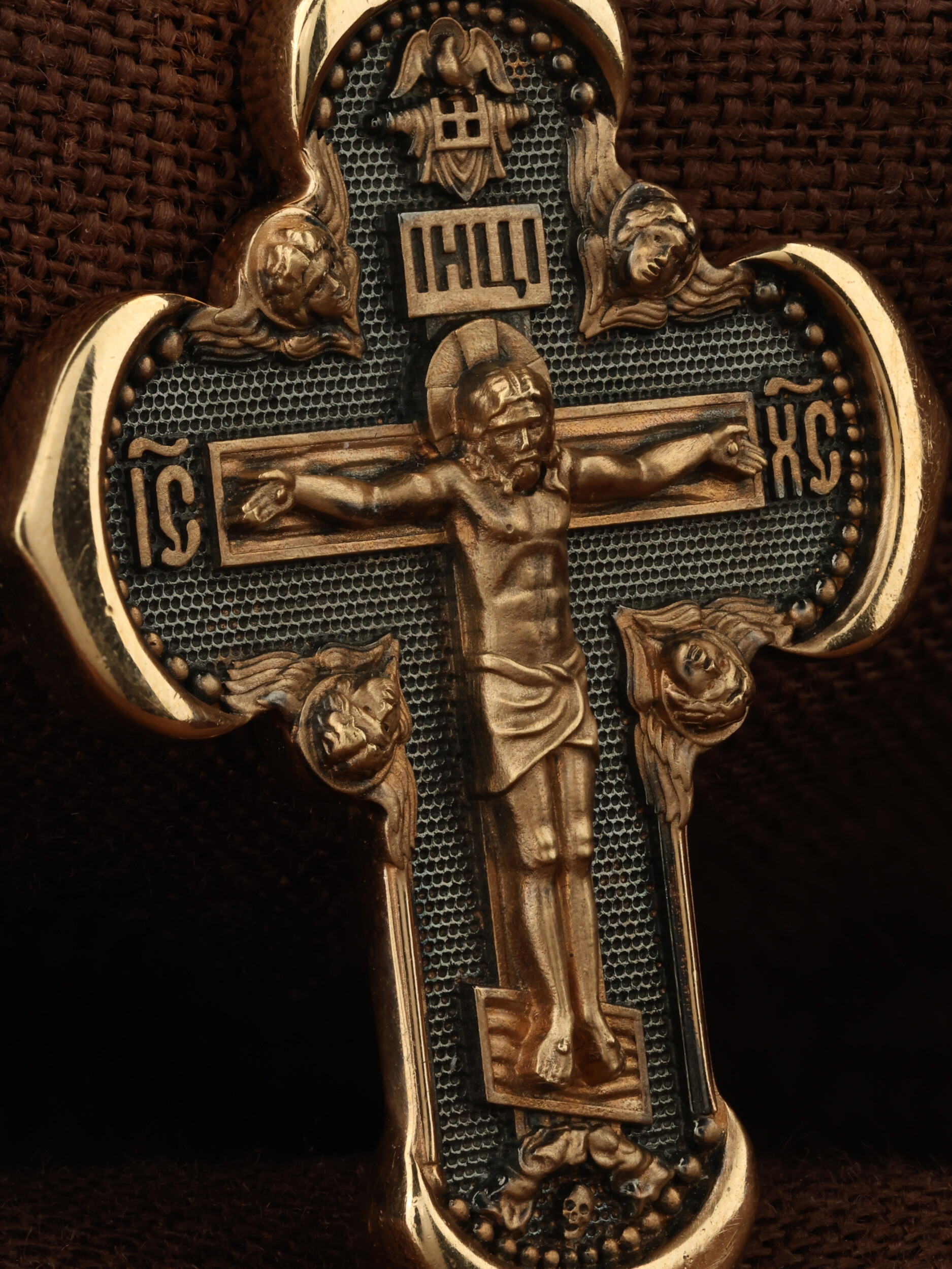 Под подножием Креста изображена покоящаяся голова (череп) Адама. Вокруг Распятия помещены изображения На лицевой стороне креста изображено Распятие Господа и Спасителя нашего Иисуса Христа. Крест- символ спасения и искупления рода человеческого, знамение победы над смертью и адом. Иисус Христос, как искупительная жертва освобождения человечества от власти греха, умер крестной смертью и в третий день воскрес. На верхней табличке, выше головы Иисуса, расположена надпись, составленная Понтием Пилатом — «IНЦI». Она означает «Иисус Назорей, Царь Иудейский». Надпись «IС» « ХС» означает Иисус Христос и помещается на разных сторонах поперечной перекладины креста. Возвышение, на котором стоит Крест, символизирует гору Голгофу, на которой произошло Распятие. Ангелов Серафимов. На кулонном кольце изображен Нерукотворный образ Господа и Спасителя нашего Иисуса Христа, чудесно отпечатавшийся на плате, котором Христос вытер свой лик.