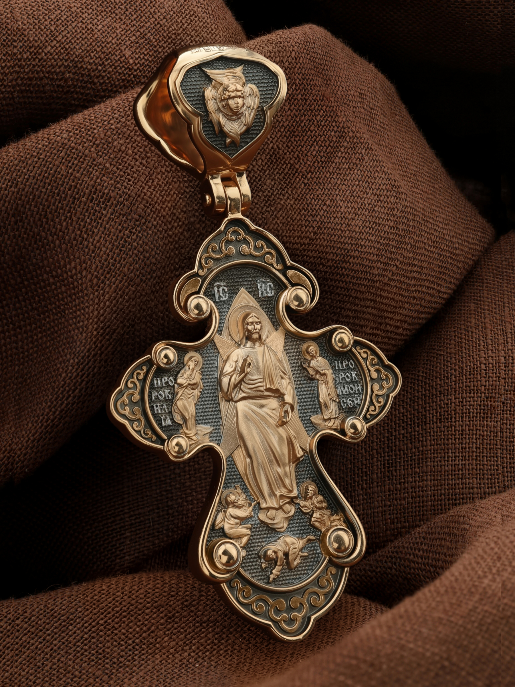 На оборотной стороне креста изображена икона «Преображение Господне». Иисус Христос вместе со своими учениками Петром, Яковом и Иоанном взошел на гору Фавор для молитвы. Пока Господь молился, ученики заснули, а проснувшись увидели, что Иисус преобразился — «лицо Его просияло, а одежды сделались ослепительно белыми». Рядом с Сыном Божьим они увидели ветхозаветных пророков — Моисея и Илию, которые беседовали с Ним о грядущих искупительных страданиях. Увидев такую картину, апостолов охватила неземная благодать, они захотели, чтобы это состояние продолжалось все время. А через некоторое время сверху сошло облако, которое скрыло Иисуса, Илию и Моисея от взора учеников и они услышали из облака Божий глас: « Сей есть Сын Мой возлюбленный, в Котором Мое благоволение. Его слушайте!» (Мф. 17,1−13). В страхе и почтении Петр, Иоанн и Иаков повалились на землю. Вскоре к ним подошел Иисус Христос в своей обычной одежде и сказал им, чтобы больше никто из людей, до Его Воскрешения, не знал о том, что произошло на этой горе. На кулонном кольце изображен парящий голубь — символ Святого Духа и Его благодати.