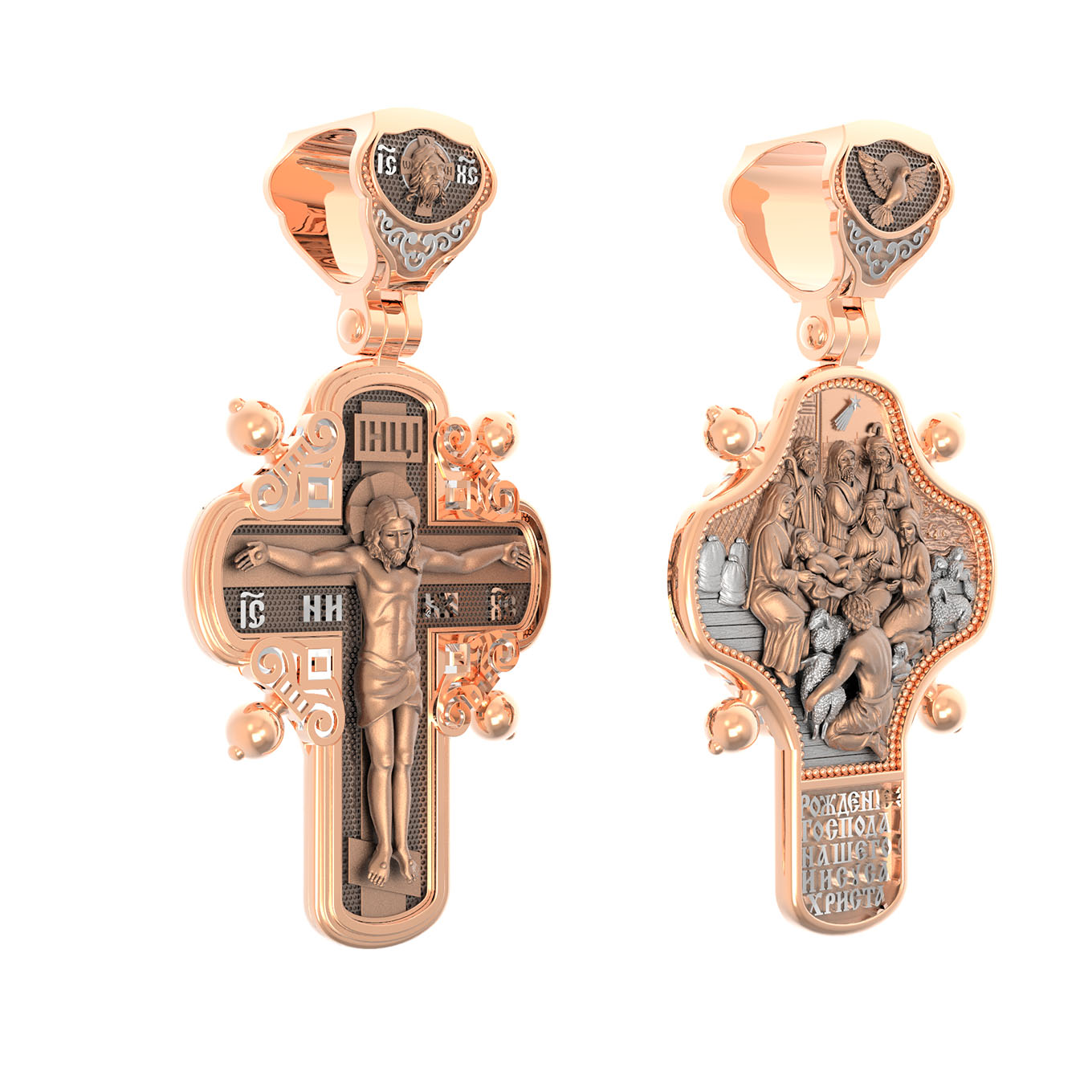 На оборотной стороне креста помещено изображение иконы «Рождество Христово». Господь Иисус Христос родился от Пресвятой Девы Марии в царствование императора Августа в городе Вифлееме. Как раз в это время Август повелел сделать всенародную перепись по всей своей империи, согласно которой каждый житель Палестины должен был идти в тот город, к которому испокон веков принадлежал его род. Пресвятая Богородица и праведный Иосиф, как происходившие от рода Давидова, должны были идти в Вифлеем (город Давида), чтобы внести свои имена в список подданных кесаря: «Пошел также и Иосиф из Галилеи, из города Назарета, в Иудею, в город Давидов, называемый Вифлеем, потому что он был из дома и рода Давидова, записаться с Мариею, обрученною ему женою, которая была беременна. Когда же они были там, наступило время родить Ей; и родила Сына своего Первенца, и спеленала Его, и положила Его в ясли, потому что не было им места в гостинице» (Лк.2:4−7).После рождения Спасителя на поле близ Вифлеема простым пастухам явились ангелы, благовествовавшие о пришествии в мир Христа песней славословия Господу: «Слава в вышних Богу, и на земли мир, в человецех благоволение!». Они повелели пастырям идти поклониться Младенцу. В это же время к Рожденному с дарами из дальних стран — златом, ливаном и смирной — пришли волхвы, которых к яслям Богомладенца привела воссиявшая в небе новая звезда. На кулонном кольце изображен Дух Святой в виде голубя сходящего с небес.