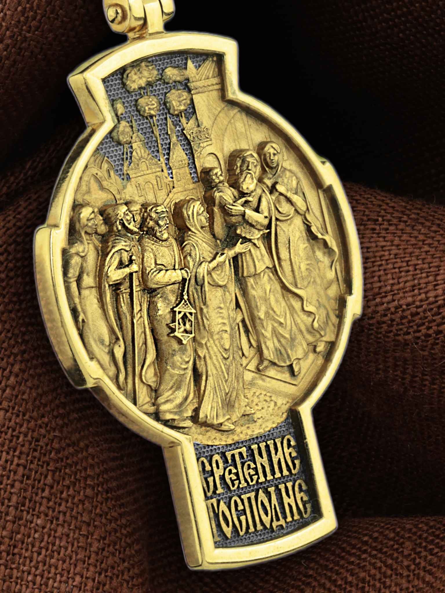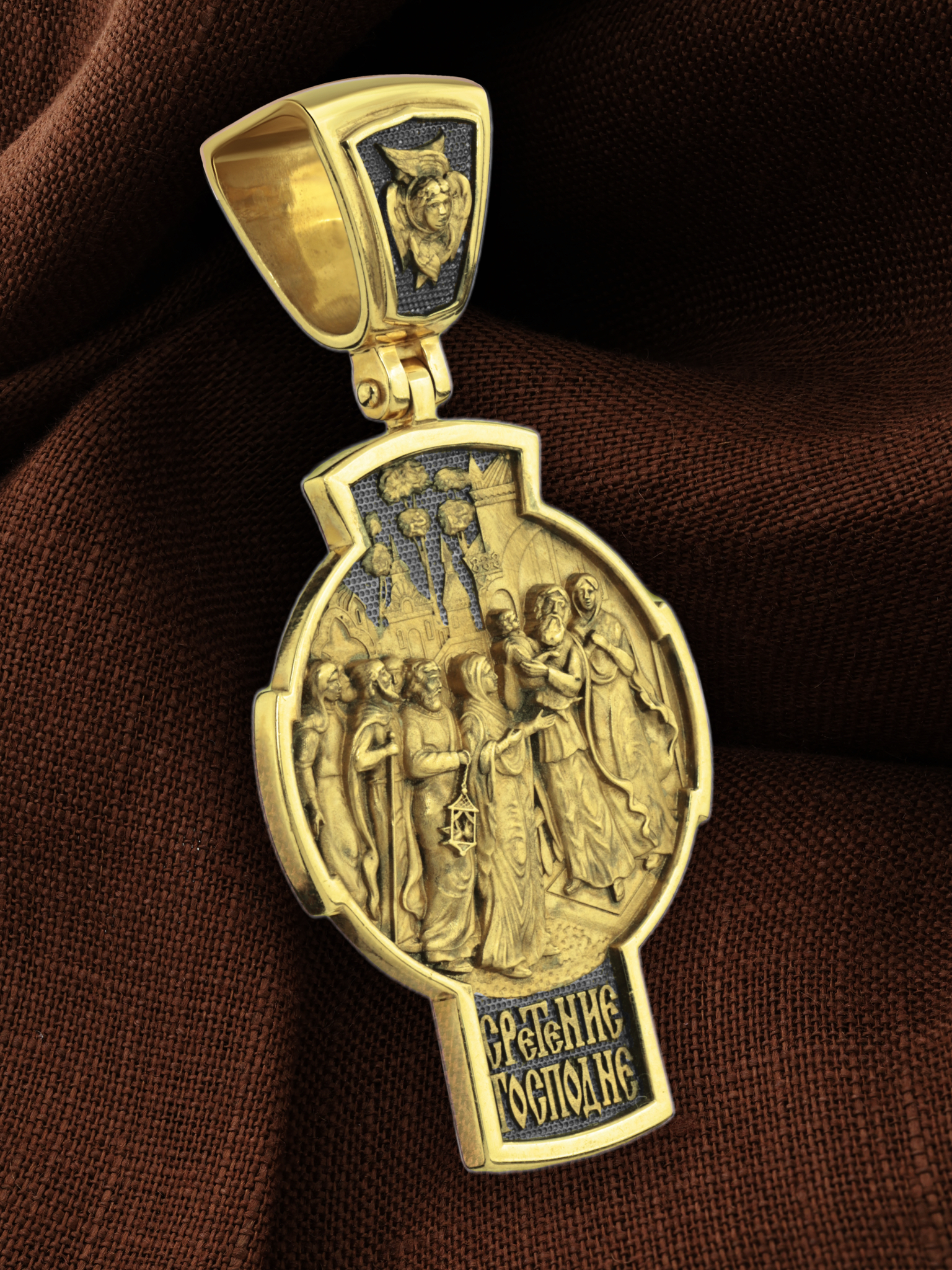 На оборотной стороне креста изображена икона Сретение Господне. В сороковой день по рождении Богомладенец был принесен в Иерусалимский храм. В это время жил в Иерусалиме праведный старец Симеон. Ему было откровение, что он не умрет, пока не увидит Христа Спасителя. По внушению свыше благочестивый старец пришел в храм в то время, когда Пресвятая Богородица и праведный Иосиф принесли туда Младенца Иисуса, чтобы исполнить законный обряд. Богоприимец Симеон взял Богомладенца на руки и, благословив Бога, изрек пророчество о Спасителе мира: «Ныне отпускаешь раба Твоего, Владыка, по слову Твоему, с миром, ибо видели очи мои спасение Твое, которое Ты уготовал пред лицем всех народов, свет к просвещению язычников и славу народа Твоего Израиля» (Лк. 2: 29–32). Пресвятой Деве праведный Симеон сказал: «Се, лежит Сей на падение и на восстание многих в Израиле и в предмет пререканий, и Тебе Самой оружие пройдет душу, да откроются помышления многих сердец». В храме была также 84-летняя вдовица Анна, пророчица, дочь Фануилова, которая постом и молитвой служила Богу в храме день и ночь. Она «славила Господа и говорила о Богомладенце всем, ожидавшим избавления в Иерусалиме». На кулонном кольце изображен шестикрылый Ангел — Серафим.