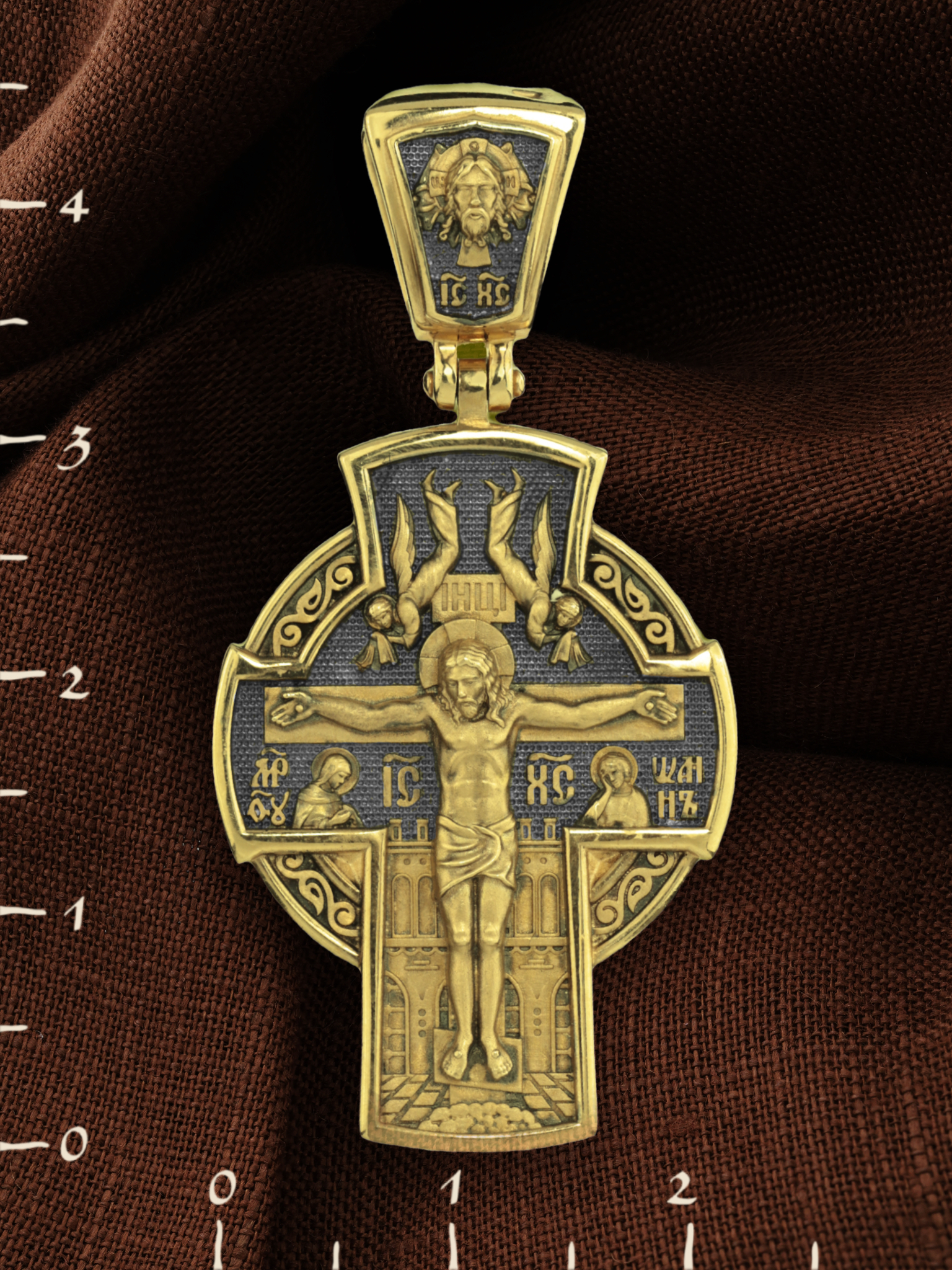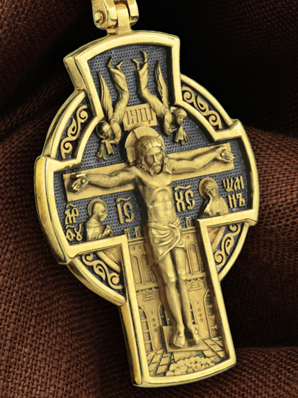 На лицевой стороне креста изображено Распятие Господа и Спасителя нашего Иисуса Христа, отдавшего Себя на смерть, для искупления грехов мира. Крест является символом жертвенной любви всеблагого Бога к падшим людям, всепобеждающим духовным оружием христиан, основанием и средоточием церковной жизни. Верхняя перекладина символизирует титло — табличку, на которой, согласно Евангелию, было начертано: Иисус Назорей Царь Иудейский (IНЦI). Надпись «IC» «ХC», означает Иисус Христос, помещается ниже поперечной перекладины креста. Слева от Распятия изображена Пресвятая Богородица, справа — апостол и евангелист Иоанн Богослов, один из ближайших учеников Иисуса Христа. За крестом высится Иерусалимская стена, в знак того, что Господь был распят вне стен города. Возвышение, на котором стоит Крест, символизирует гору Голгофу, на которой произошло Распятие. На кулонном кольце изображен Нерукотворный образ Господа и Спасителя нашего Иисуса Христа, чудесно отпечатавшийся на плате, которым Христос вытер свой лик.