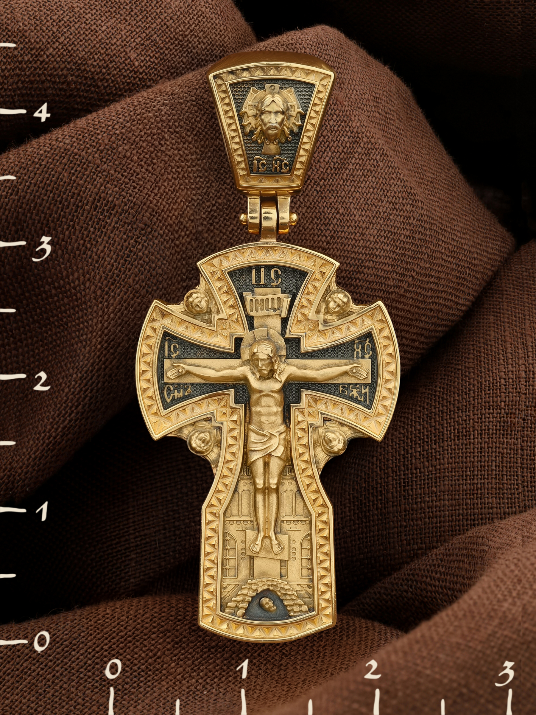 На лицевой стороне креста изображено Распятие Господа и Спасителя нашего Иисуса Христа, отдавшего Себя на смерть, для искупления грехов мира. Крест является символом жертвенной любви Всеблагого Бога к падшим людям, всепобеждающим духовным оружием христиан, основанием и средоточием церковной жизни. Господь сказал: кто хочет идти за Мною, отвергнись себя, и возьми крест свой, и следуй за Мною. (Мк. 8: 34). Над Распятием помещена надпись «Царь Славы». На верхней табличке, выше головы Иисуса, расположена надпись, составленная Понтием Пилатом — «IНЦI». Она означает «Иисус Назорей, Царь Иудейский». Надпись «IC» «ХC», означает Иисус Христос, помещается на разных сторонах поперечной перекладины креста. Рядом расположена надпись «Сын Божий». За крестом высится Иерусалимская стена, в знак того, что Господь был распят вне стен города. Возвышение, на котором стоит Крест, символизирует гору Голгофу, на которой произошло Распятие. Под подножием Креста изображена покоящаяся голова (череп) Адама. На кулонном кольце изображен Нерукотворный образ Господа и Спасителя нашего Иисуса Христа, чудесно отпечатавшийся на плате, которым Христос вытер свой лик.