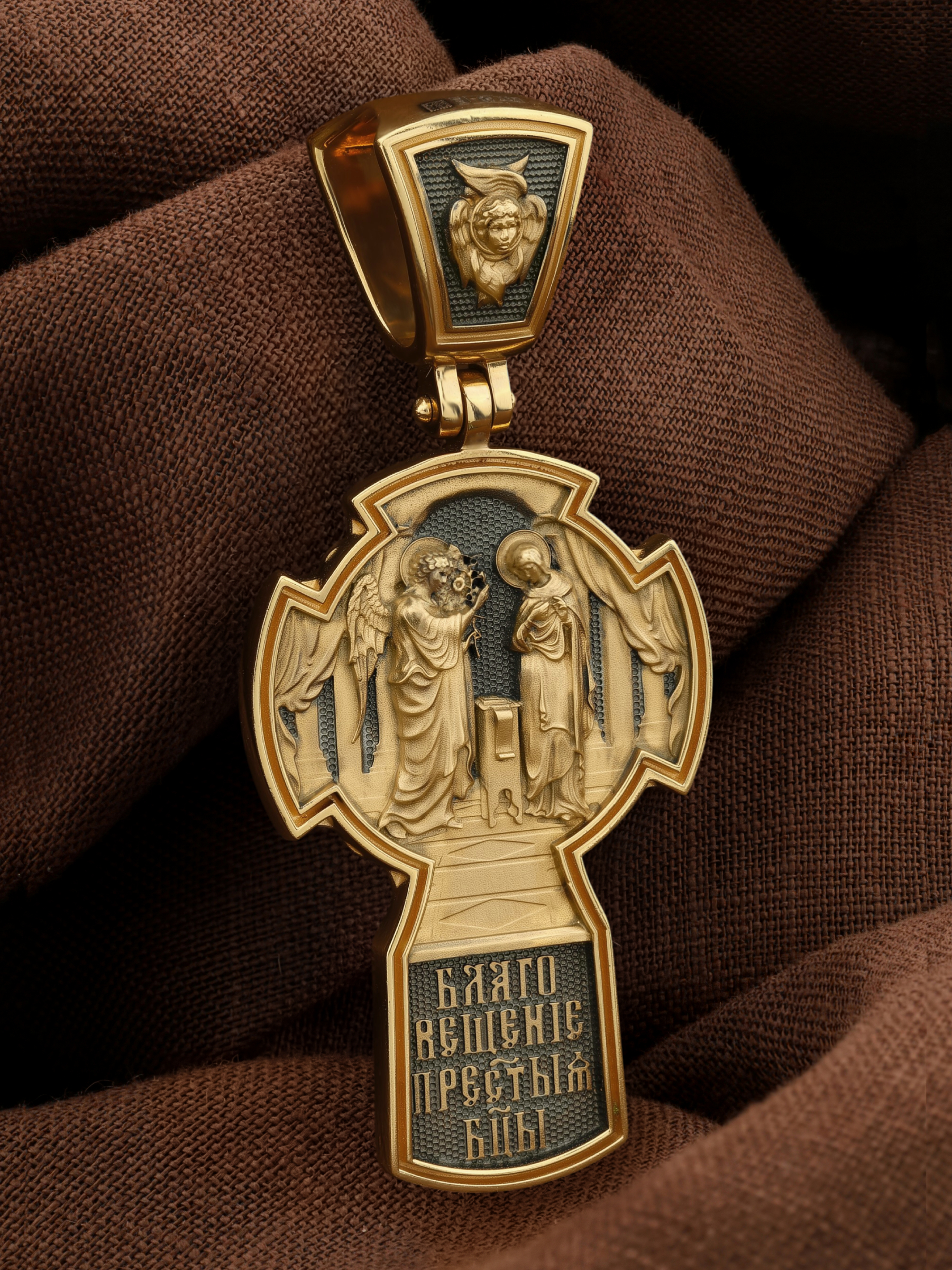 На оборотной стороне креста изображена икона «Благовещение Пресвятой Богородицы». Как нам повествует Священное Писание, Архангел Гавриил послан был от Бога в город Назарет к Пресвятой Деве Марии с радостной вестью, что Господь избрал Ее быть Матерью Спасителя мира. Ангел сказал: «Радуйся благодатная! Господь с Тобою! Благословенна Ты между женами». Мария cмутилась от слов Ангела и думала: что значит это приветствие? Ангел же продолжал говорить Ей: «не бойся, Мария, ибо Ты обрела благодать у Бога. И вот, Ты родишь Сына и наречешь имя Ему Иисус. Он будет велик, и назовется сыном Всевышнего, и Царству Его не будет конца…» На кулонном кольце изображен Ангел Серафим.