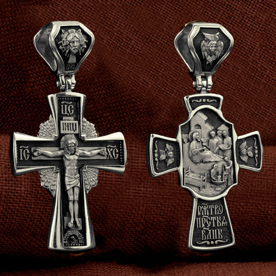 На оборотной стороне креста изображена икона Рождество Пресвятой Богородицы. Согласно церковному Преданию, Пресвятая Дева Мария родилась в небольшом галилейском городе Назарете. Родителями Её были праведные Иоаким и Анна. Супруги были бездетны, но не теряли надежды, что Господь может разрешить неплодство Анны даже в её преклонном возрасте. Они горячо молились и просили Господа даровать им дитя, которое обещали посвятить Богу для служения в храме. И Господь услышал их молитвы: Праведная Анна зачала и разрешилась дочерью Марией — будущей Пресвятой Богородицей. На кулонном кольце изображен шестикрылый Ангел — Серафим.