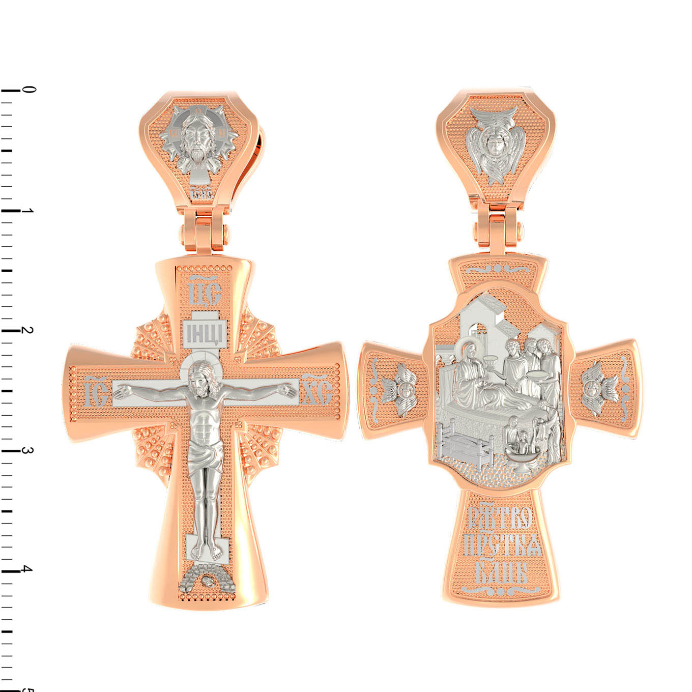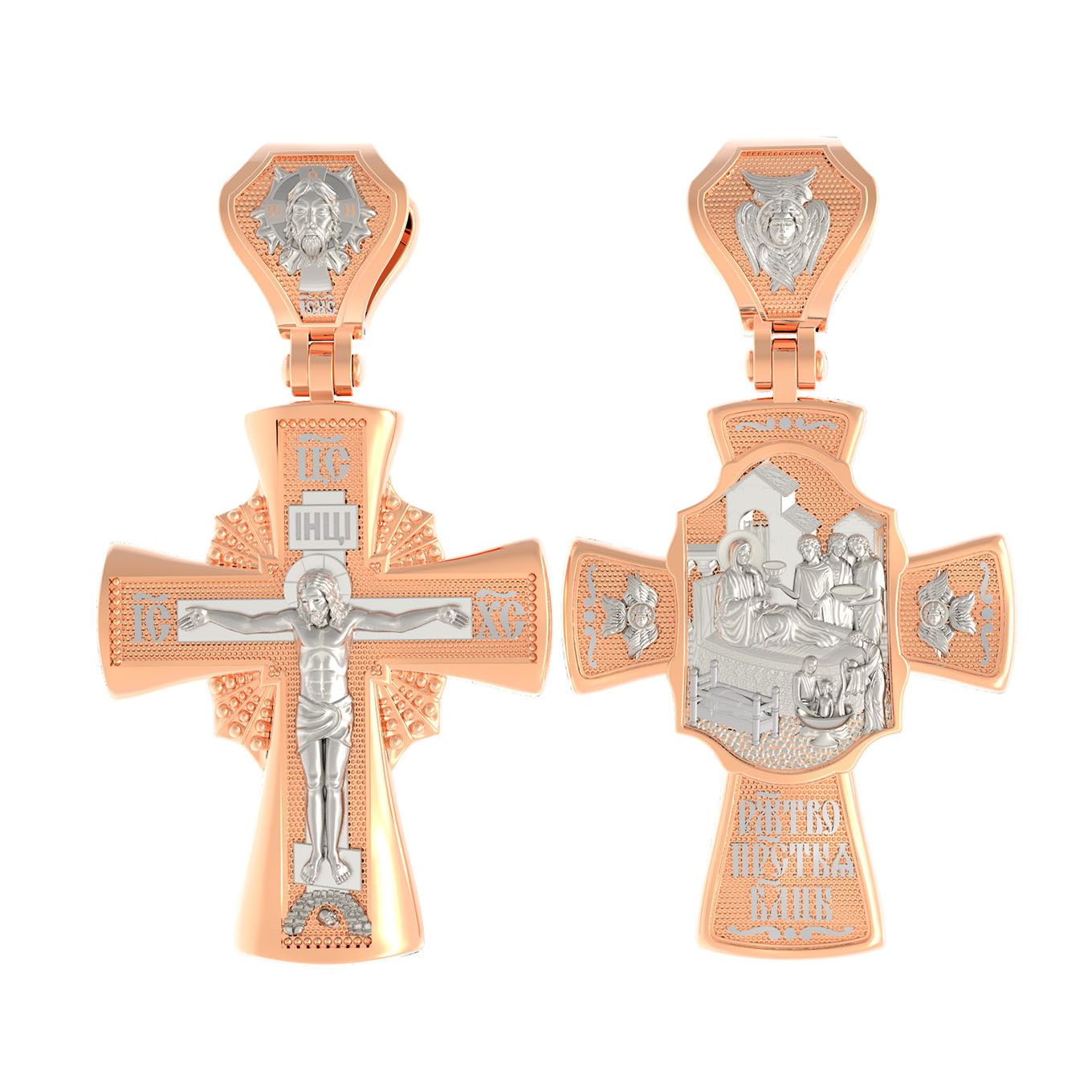 На лицевой стороне креста изображено Распятие Господа и Спасителя нашего Иисуса Христа, отдавшего Себя на смерть, для искупления грехов мира. Крест является символом жертвенной любви Всеблагого Бога к падшим людям, всепобеждающим духовным оружием христиан, основанием и средоточием церковной жизни. Господь сказал: кто хочет идти за Мною, отвергнись себя, и возьми крест свой, и следуй за Мною. (Мк. 8: 34). Над Распятием помещена надпись «Царь Славы». На верхней табличке, выше головы Иисуса, расположена надпись, составленная Понтием Пилатом — «IНЦI». Она означает «Иисус Назорей, Царь Иудейский». Надпись «IC» «ХC», означает Иисус Христос, помещается на разных сторонах поперечной перекладины креста. Возвышение, на котором стоит Крест, символизирует гору Голгофу, на которой произошло Распятие. Под подножием Креста изображена покоящаяся голова (череп) Адама. На кулонном кольце изображен Нерукотворный образ Господа и Спасителя нашего Иисуса Христа, чудесно отпечатавшийся на плате, которым Христос вытер свой лик. Ниже надпись — «IC» «ХC».