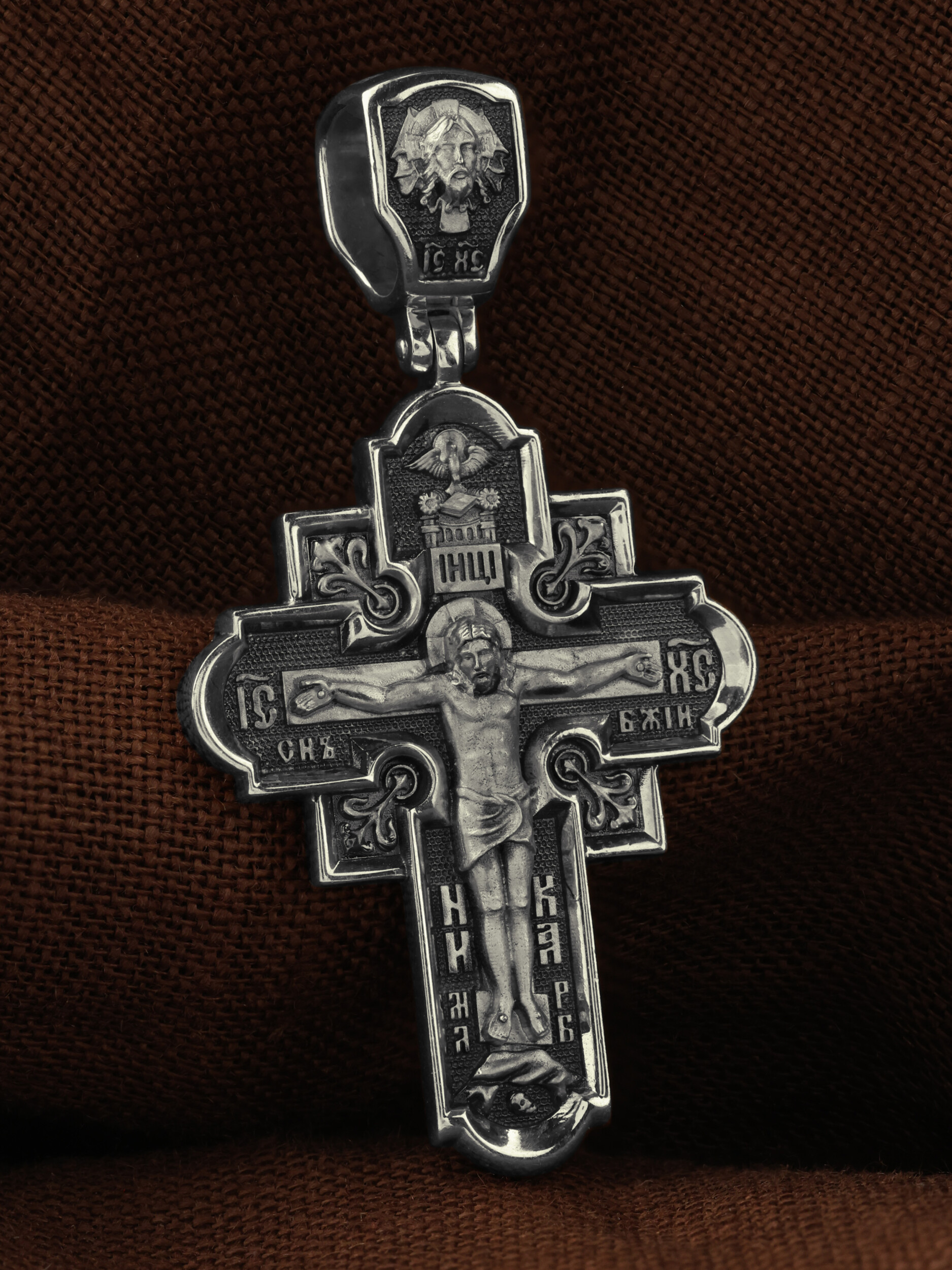 На лицевой стороне креста изображено Распятие Господа и Спасителя нашего Иисуса Христа. Крест- символ спасения и искупления рода человеческого, знамение победы над смертью и адом. Иисус Христос, как искупительная жертва освобождения человечества от власти греха, умер крестной смертью и в третий день воскрес. Верхняя перекладина символизирует титло — табличку, на которой, согласно Евангелию, было начертано: Иисус Назорей Царь Иудейский (IНЦI). Надпись «IC» «ХC», означает Иисус Христос, помещается на разных сторонах поперечной перекладины креста. Ниже перекладины расположено словосочетание «СЫН БОЖИЙ», что означает божественную природу Иисуса Христа. Надпись «МЛРБ» — «место лобное рай бысть» означает, что место лобное стало раем и помещаются в нижней части креста. Рядом — слово «НИКА», что означает «победитель». Возвышение, на котором стоит Крест, символизирует гору Голгофу, на которой произошло Распятие. Под подножием Креста изображена покоящаяся голова (череп) Адама. На кулонном кольце изображен Нерукотворный образ Господа и Спасителя нашего Иисуса Христа, чудесно отпечатавшийся на плате, которым Христос вытер свой лик. Ниже надпись — «IC» «ХC».