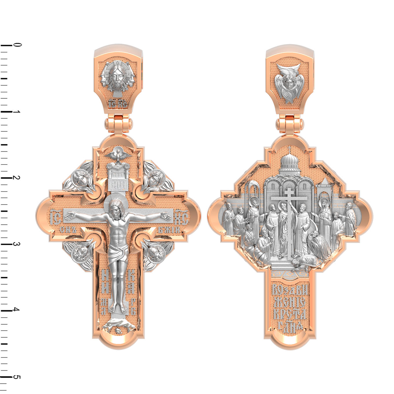 На оборотной стороне креста изображена икона Воздвижение Честного и Животворящего Креста Господня. Равноапостольный царь Константин пожелал построить храмы Божии на священных для христиан местах в Палестине и найти Крест, на котором был распят Спаситель. Исполнить желание царя взялась, с великою радостью, его мать, св. равноапостольная царица Елена. Крест был обретен в 326 году около горы Голгофы в Иерусалиме. C VII века с этим днём стали соединять память о возвращении Животворящего Креста из Персии византийским императором Ираклием (629). Праздник называется Воздвижением Креста, потому что и при обретении, и при возвращении Креста патриарх Макарий поднимал (Воздвигал) крест три раза, чтобы все могли его видеть. Народ же, видя Крест Спасителя, кланялся и восклицал: «Господи, помилуй!». Св. равноапостольные цари Константин и Елена, над местом страданий, погребения и воскресения Иисуса Христа построили обширный и великолепный храм в честь Воскресения Христова. На кулонном кольце изображен шестикрылый Ангел — Серафим.