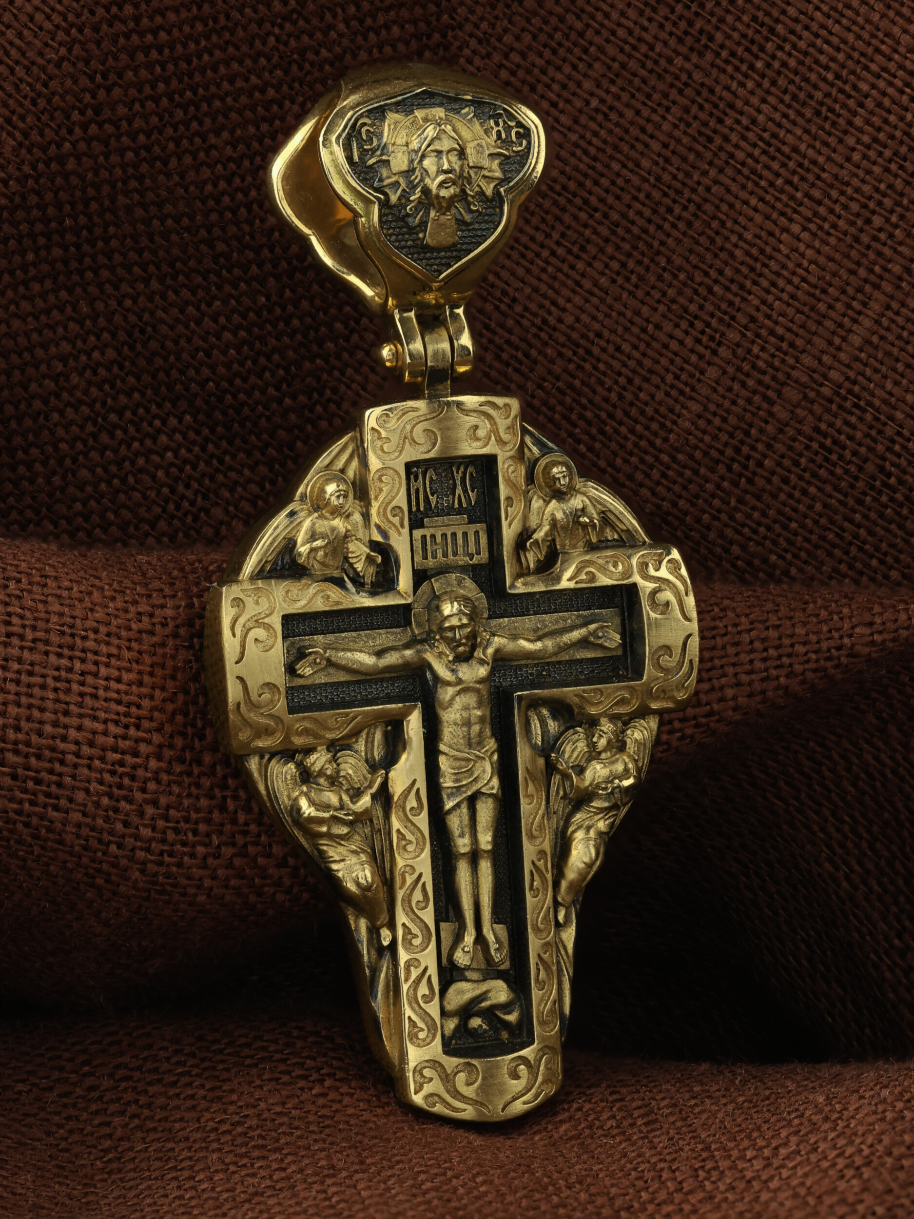 На лицевой стороне креста изображено Распятие Господа и Спасителя нашего Иисуса Христа, отдавшего Себя на смерть, для искупления грехов мира. Крест является символом жертвенной любви Всеблагого Бога к падшим людям, всепобеждающим духовным оружием христиан, основанием и средоточием церковной жизни. Господь сказал: кто хочет идти за Мною, отвергнись себя, и возьми крест свой, и следуй за Мною. (Мк. 8: 34). Над Распятием помещена надпись «IC» «ХC», означает Иисус Христос. На верхней табличке, выше головы Иисуса, расположена надпись, составленная Понтием Пилатом — «IНЦI». Она означает «Иисус Назорей, Царь Иудейский». Возвышение, на котором стоит Крест, символизирует гору Голгофу, на которой произошло Распятие. Под подножием Креста изображена покоящаяся голова (череп) Адама. У Креста изображены Ангелы. На кулонном кольце изображен Нерукотворный образ Господа и Спасителя нашего Иисуса Христа, чудесно отпечатавшийся на плате, которым Христос вытер свой лик. Ниже надпись — «IC» «ХC».