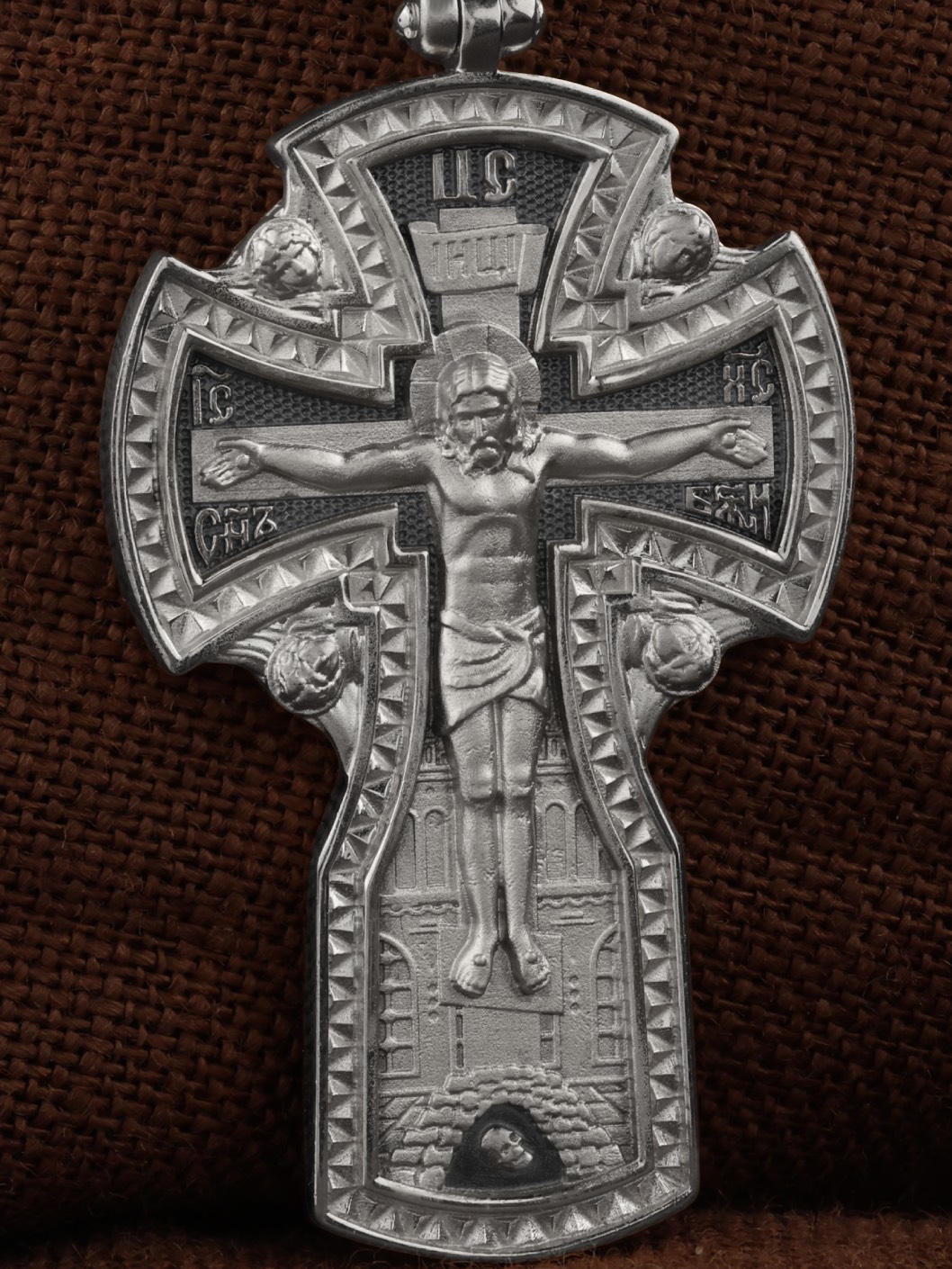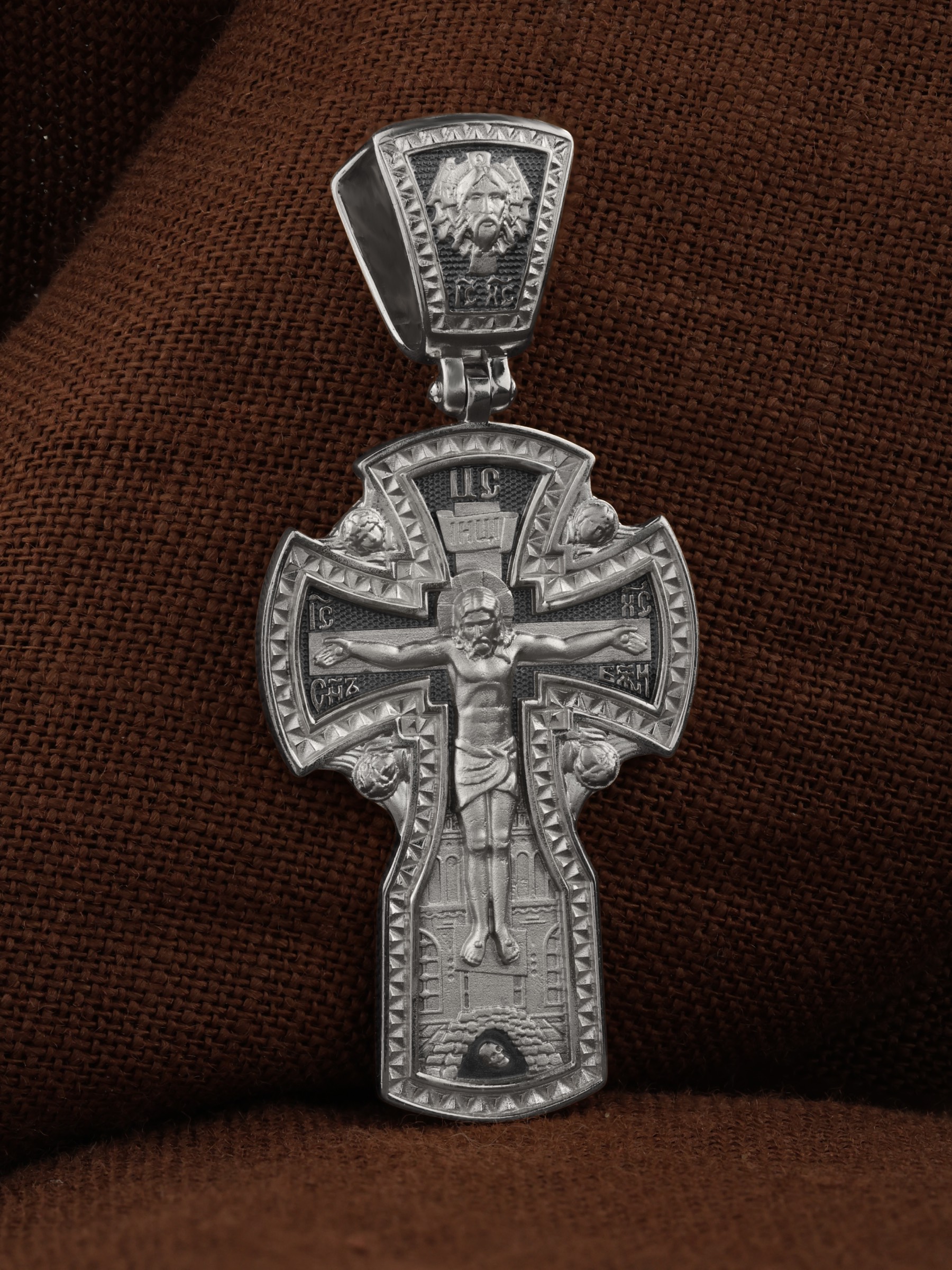 На лицевой стороне креста изображено Распятие Господа и Спасителя нашего Иисуса Христа, отдавшего Себя на смерть, для искупления грехов мира. Крест является символом жертвенной любви Всеблагого Бога к падшим людям, всепобеждающим духовным оружием христиан, основанием и средоточием церковной жизни. Господь сказал: кто хочет идти за Мною, отвергнись себя, и возьми крест свой, и следуй за Мною. (Мк. 8: 34). Над Распятием помещена надпись «Царь Славы». На верхней табличке, выше головы Иисуса, расположена надпись, составленная Понтием Пилатом — «IНЦI». Она означает «Иисус Назорей, Царь Иудейский». Надпись «IC» «ХC», означает Иисус Христос, помещается на разных сторонах поперечной перекладины креста. Рядом расположена надпись «Сын Божий». За крестом высится Иерусалимская стена, в знак того, что Господь был распят вне стен города. Возвышение, на котором стоит Крест, символизирует гору Голгофу, на которой произошло Распятие. Под подножием Креста изображена покоящаяся голова (череп) Адама. На кулонном кольце изображен Нерукотворный образ Господа и Спасителя нашего Иисуса Христа, чудесно отпечатавшийся на плате, которым Христос вытер свой лик.