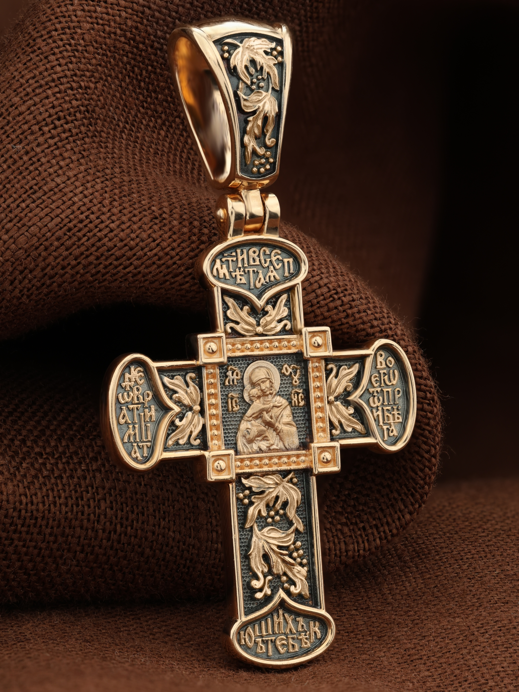 В центре оборотной стороне креста помещен образ Владимирской иконы Божией Матери — один из самых чтимых святынь Русской православной церкви. По преданию, икона была написана Святым апостолом и евангелистом Лукой во время земной жизни Богородицы. Дева Мария, увидев Свое изображение, молвила: «Отныне ублажат Мя вси роди. Благодать Рождшегося от Меня и Моя с сим образом да будет». Образ написан в лирическом иконографическом типе «Умиление». Младенец припал щекой к щеке Матери и тянется к ней правой рукой, другой нежно обнимая за шею. Икона Владимирской Божией Матери вплоть до V века находилась в Иерусалиме, затем была перевезена в Византию. На Русь икона была привезена в 1131 г. За прошедшие столетия святыня неоднократно переезжала из Владимира в Москву и обратно, не раз спасая страну от захватчиков. Русская Православная Церковь установила троекратное празднование Владимирской иконе Божией Матери. Каждый из дней празднования связан с избавлением русского народа от порабощения иноплеменниками по молитвам ко Пресвятой Богородице. В последующие века у иконы происходили многие важные исторические события: подписание актов, принятие присяги значимых государственных деятелей и возведение на престол. Вокруг образа, по сторонам Креста, написана молитва: «Мати Всепетая, не отврати лица Твоего от прибегающих к Тебе». Оборотная сторона креста украшена растительным орнаментом.