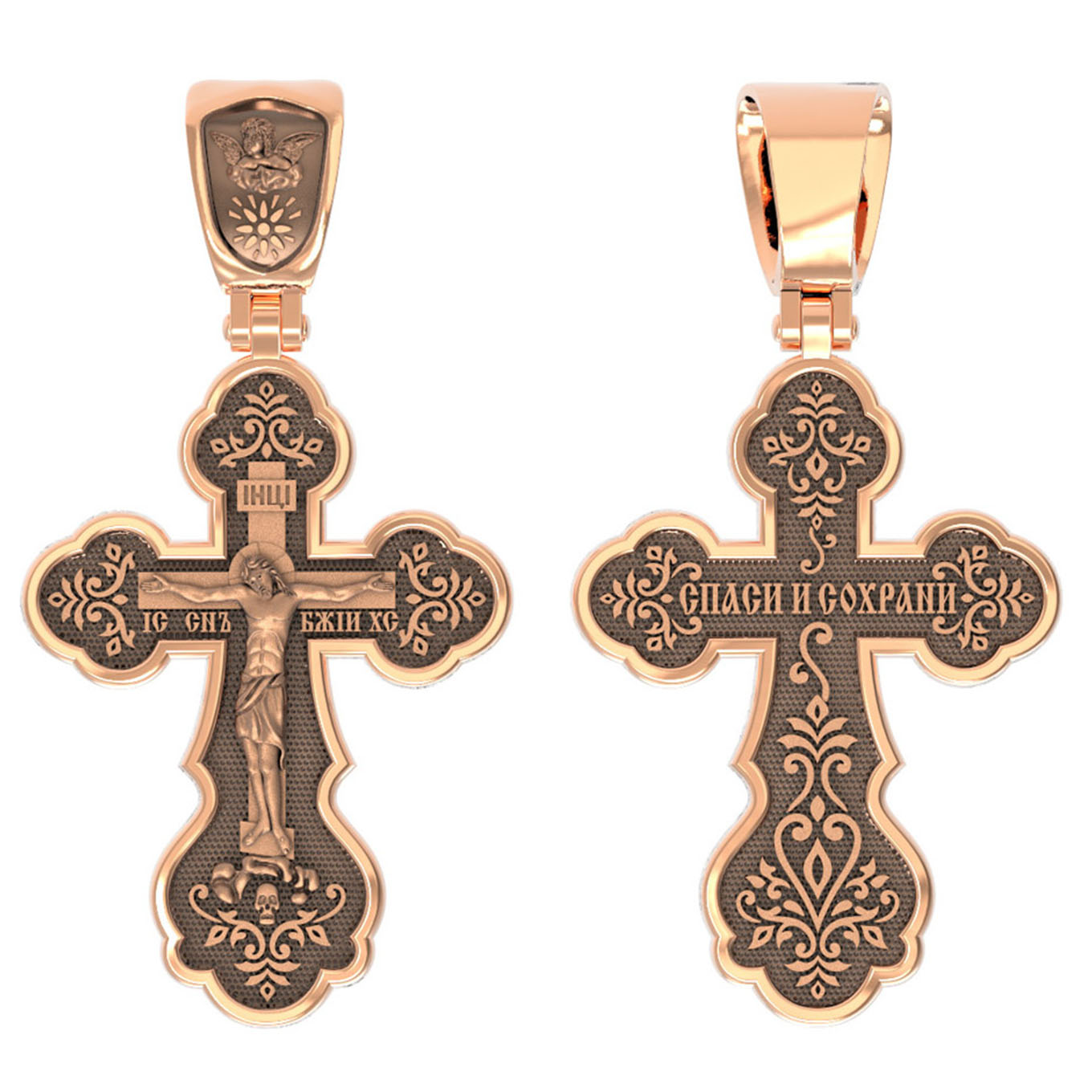 На лицевой стороне креста изображено Распятие Господа и Спасителя нашего Иисуса Христа. Христос, подвергнутый на кресте мучительной казни, своими страданиями искупил нас от древнего греха и даровал нам жизнь вечную. Крест означает своей вертикальной прямой линией справедливость и непреложность Божественных заповедей, прямоту Божией правды и истины, не допускающей никаких нарушений. Эта прямота пересекается главной поперечной перекладиной, означающей любовь и милость Божию к падшим и падающим грешникам, ради которой и был принесен в жертву Сам Господь, взявший на Себя грехи всех людей. На верхней табличке, выше головы Иисуса, расположена надпись, составленная Понтием Пилатом — «IНЦI». Она означает «Иисус Назорей, Царь Иудейский». Надпись «IС ХС» означает Иисус Христос и словосочетание «СЫН БОЖИЙ», что означает божественную природу Иисуса Христа, помещается на разных сторонах поперечной перекладины креста. Крест стоит на горе камней, символизирующих Голгофу. Под подножием Креста изображена покоящаяся голова (череп) Адама, грехи которого Христос омыл Своею Кровью. Христос в Своей Божественной любви, над которой смерть не властна и которая, страдая, и не страдает в обычном смысле, простирает к людям со Креста Свои объятия, в которые призывается и привлекается весь мир. Поэтому Тело Его не висит, а торжественно покоится на Кресте. Здесь Христос, распятый и умерший, удивительным образом жив в самой смерти Своей. На кулонном кольце изображен Ангел Херувим. Херувимы сияют всегда светом Богопознания, ведением таин и глубин премудрости Божией, сами просвещаемые и других просвещающие.