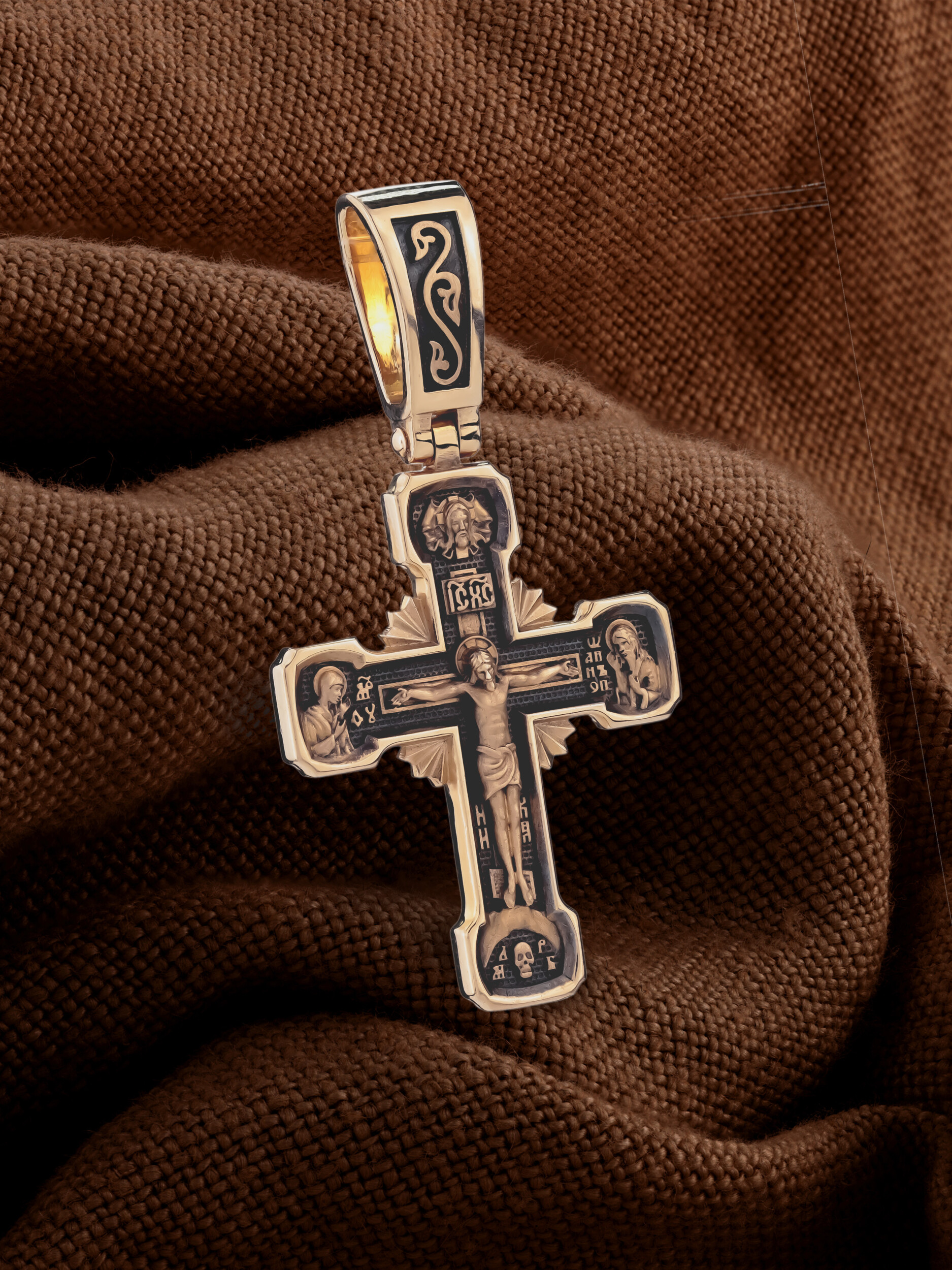 На лицевой стороне креста изображено Распятие Господа Иисуса Христа. Верхняя перекладина символизирует собой табличку с надписью «IHЦI» — Иисус Назарянин Царь Иудейский. Ниже перекладины добавляется: «НИКА» (греч. — Победитель). Возвышение, на котором стоит Крест, символизирует гору Голгофу, на которой произошло Распятие. У подножия Креста изображают прах Адама, обозначенный черепом.