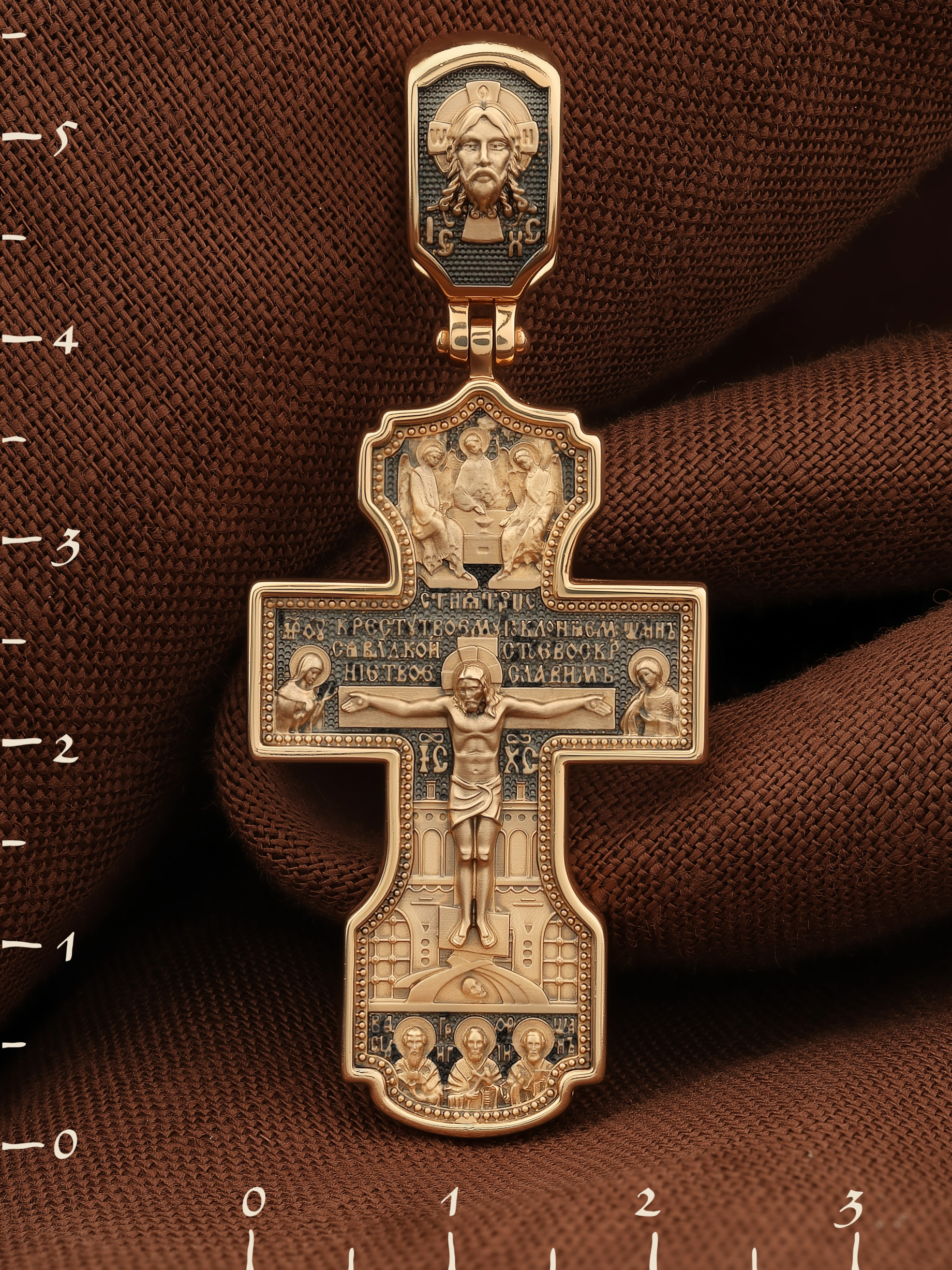 На лицевой стороне креста изображено Распятие Господа и Спасителя нашего Иисуса Христа, отдавшего Себя на смерть, для искупления грехов мира. Крест является символом жертвенной любви Всеблагого Бога к падшим людям, всепобеждающим духовным оружием христиан, основанием и средоточием церковной жизни. Господь сказал: «кто хочет идти за Мною, отвергнись себя, и возьми крест свой, и следуй за Мною». (Мк. 8: 34). Выше Распятия помещены слова молитвы:"Кресту Твоему поклоняемся, Владыко, и святое Воскресение Твое Славим». Над Распятием — образ Святой Троицы в виде трех ангелов. Надпись «IС» « ХС» означает Иисус Христос и находится ниже поперечной перекладины креста. Слева от Распятия изображена Пресвятая Богородица. Справа — апостол и евангелист Иоанн Богослов, один из ближайших учеников Иисуса Христа. За крестом высится Иерусалимская стена. Крест стоит на горе камней, символизирующих Голгофу. В ее основании различается череп — это голова Адама. Ниже распятия изображены отцы Церкви — Святители Василий Великий, Григорий Богослов и Иоанн Златоуст. На православном кресте Христос не умирает, а свободно простирает руки, ладони Иисуса открыты, будто он хочет обнять все человечество, даря им свою любовь и открывая путь к вечной жизни. На кулонном кольце изображен Нерукотворный образ Господа и Спасителя нашего Иисуса Христа, чудесно отпечатавшийся на плате, которым Христос вытер свой лик.