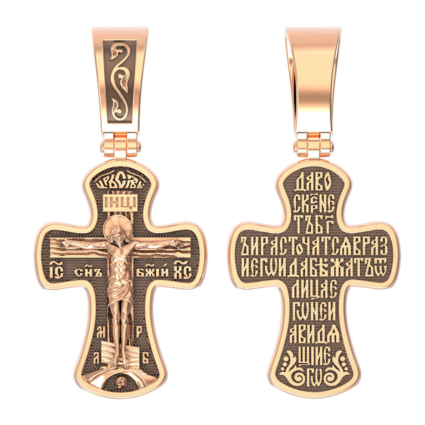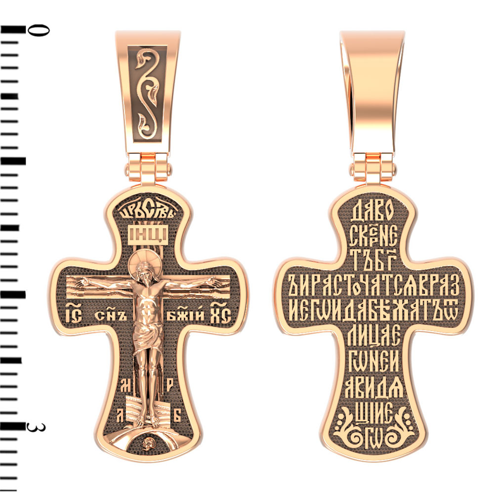 Всю оборотную часть креста занимает начальный стих оградительной молитвы Честному Кресту Господню: «Да воскреснет Бог, и расточатся врази Его, и да бежат от лица Его ненавидящие Его.»