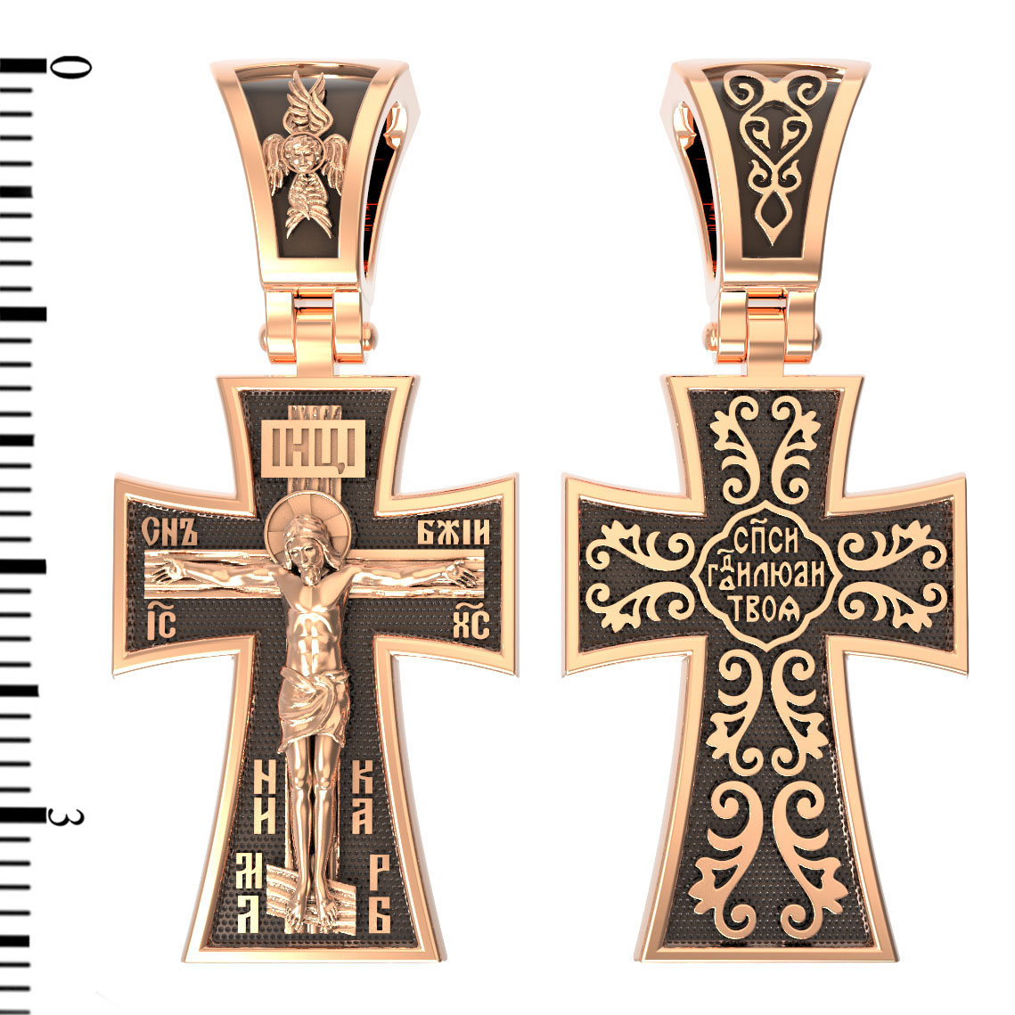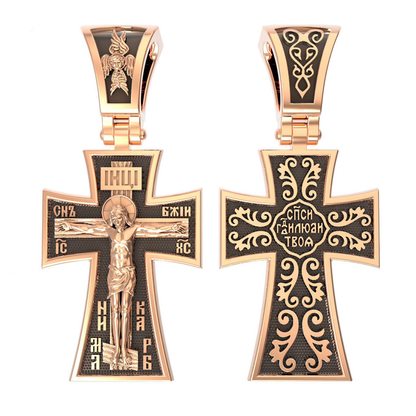 На лицевой стороне креста изображено Распятие, потому что это орудие казни Иисус Христос сделал орудием победы над грехом и смертью. Своими страданиями Он искупил грехи человечества, умерев и сошествовав во ад, победил сатану, освободил души праведников от вечной смерти и открыл им небесные врата рая. Жертва Христа сделала возможным спасение для каждого человека. На православном кресте Христос не умирает, а свободно простирает руки, ладони Иисуса открыты, будто он хочет обнять все человечество, даря им свою любовь и открывая путь к вечной жизни. Верхняя перекладина символизирует собой табличку с надписью «IHЦI» — Иисус Назарянин Царь Иудейский. Над перекладиной пишется и словосочетание «СНЪ БЖIЙ» — СЫН БОЖИЙ, ниже перекладины добавляется имя Спасителя «IC XC» — Иисус Христос. Рядом с образом Христа помещены слова — «НИКА» (греч. — Победитель). Возвышение, на котором стоит Крест, символизирует гору Голгофу, на которой произошло Распятие. У подножия Креста изображают прах Адама, обозначенный черепом. Буквы «МЛ» «РБ», написанные в нижней части креста, означают: «Место Лобное Рай Бысть».