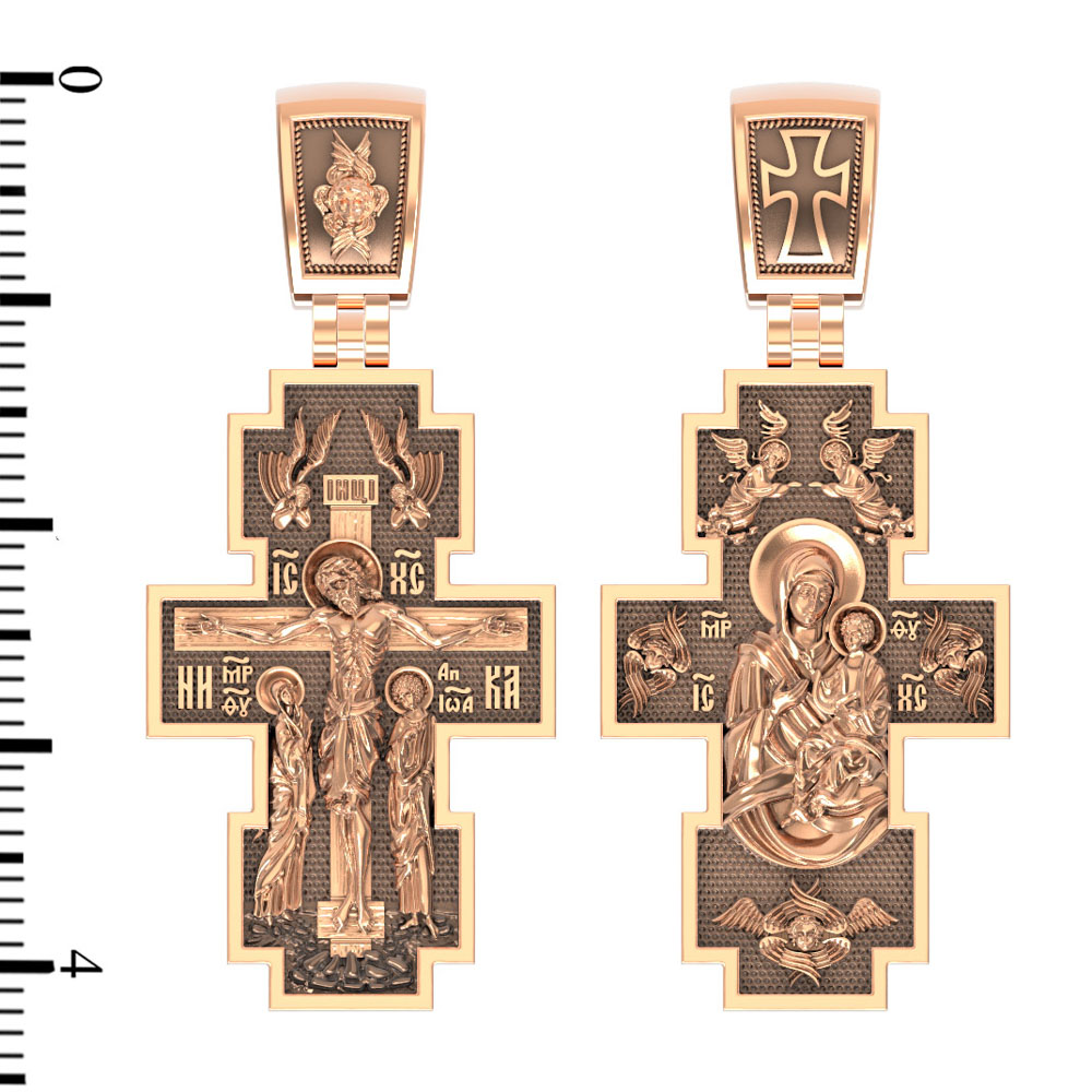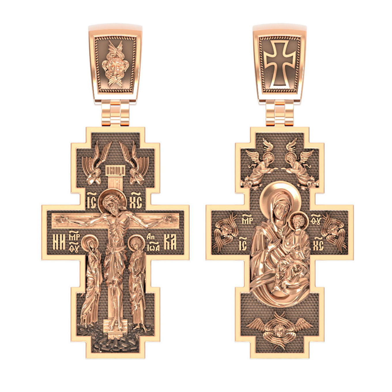 На лицевой стороне креста изображено Распятие Господа Иисуса Христа с предстоящими Ему святыми, которые, по преданию, находились у Креста Господа во время Его казни. Слева — Пресвятая Богородица, справа — апостол Иоанн Богослов. Верхняя перекладина креста символизирует титло — табличку, на которой, согласно Евангелию, было начертано: «Иисус Назорей Царь Иудейский» (IНЦI). Над перекладиной пишется сокращенно имя Спасителя «IC XC» — Иисус Христос, ниже перекладины добавляется: «НИКА» (греч. — Победитель). Возвышение, на котором стоит Крест, символизирует гору Голгофу, на которой произошло Распятие. У подножия Креста изображают прах Адама, обозначенный черепом. На кулонном кольце изображен шестикрылый Серафим — самый приближенный к Господу Ангел.