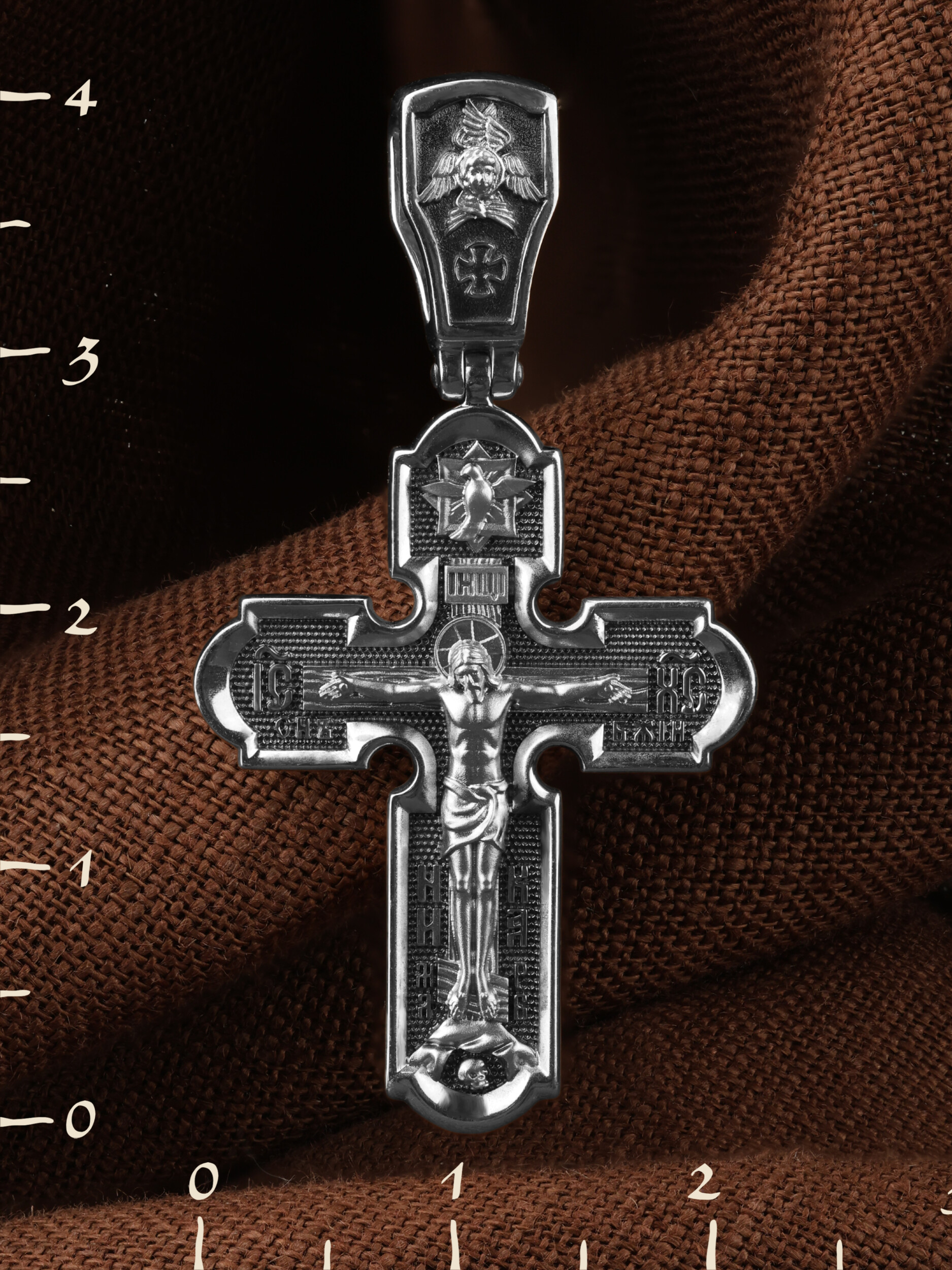 На лицевой стороне креста изображено Распятие Иисуса Христа. Господь представлен свободно покоящимся на кресте с простертыми руками и как бы обнимающим всю Вселенную. Верхняя перекладина символизирует титло — табличку, на которой, согласно Евангелию, было начертано: Иисус Назорей Царь Иудейский (IНЦI). Также Распятие сопровождается надписями, олицетворяющими Христа: святое имя Христа «IC» (Иисус) «ХС» (Христос), и словосочетание «СНЪ БЖIЙ» — СЫН БОЖИЙ. Рядом с образом Христа помещены слова — «НИКА» (греч. — Победитель) и четыре буквы «МЛ» «РБ» — Место Лобное Рай Бысть. Возвышение, на котором стоит Крест, символизирует гору Голгофу, на которой произошло Распятие. У подножия Креста изображают прах Адама, обозначенный черепом. На кулонном кольце изображен шестикрылый Серафим — самый приближенный к Господу Ангел.